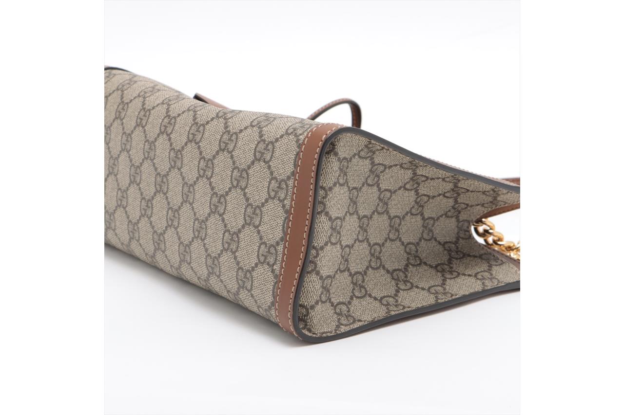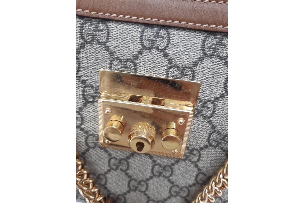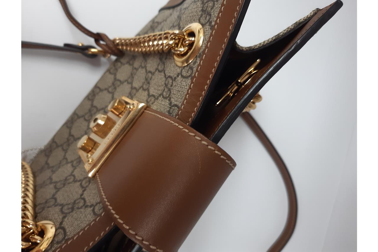 Gucci Small GG Padlock Shoulder Bag in beige/ebony GG Supreme canvas with brown leather detail. Featuring gold-tone hardware, Microfibre lining with a suede-like finish, and lock closure. Style: ?498156 KHNKG 8534.