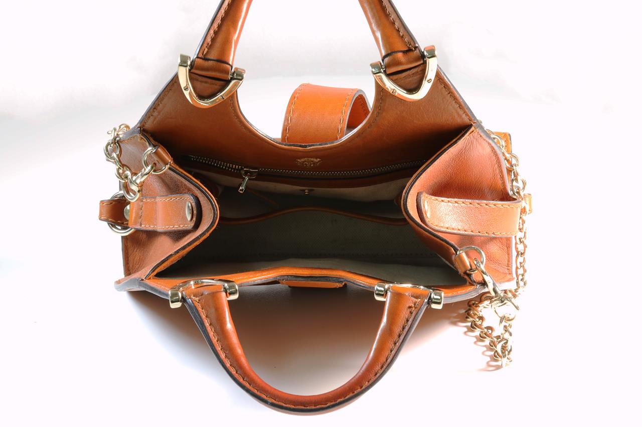 Gucci small stirrup top handle bag. Gold tone hardware with chain strap. Beige canvas lining. Dimensions: 23.5cm x 26cm x 9cm. With Royal Bag Spa authenticity certificate. (Pre-owned)