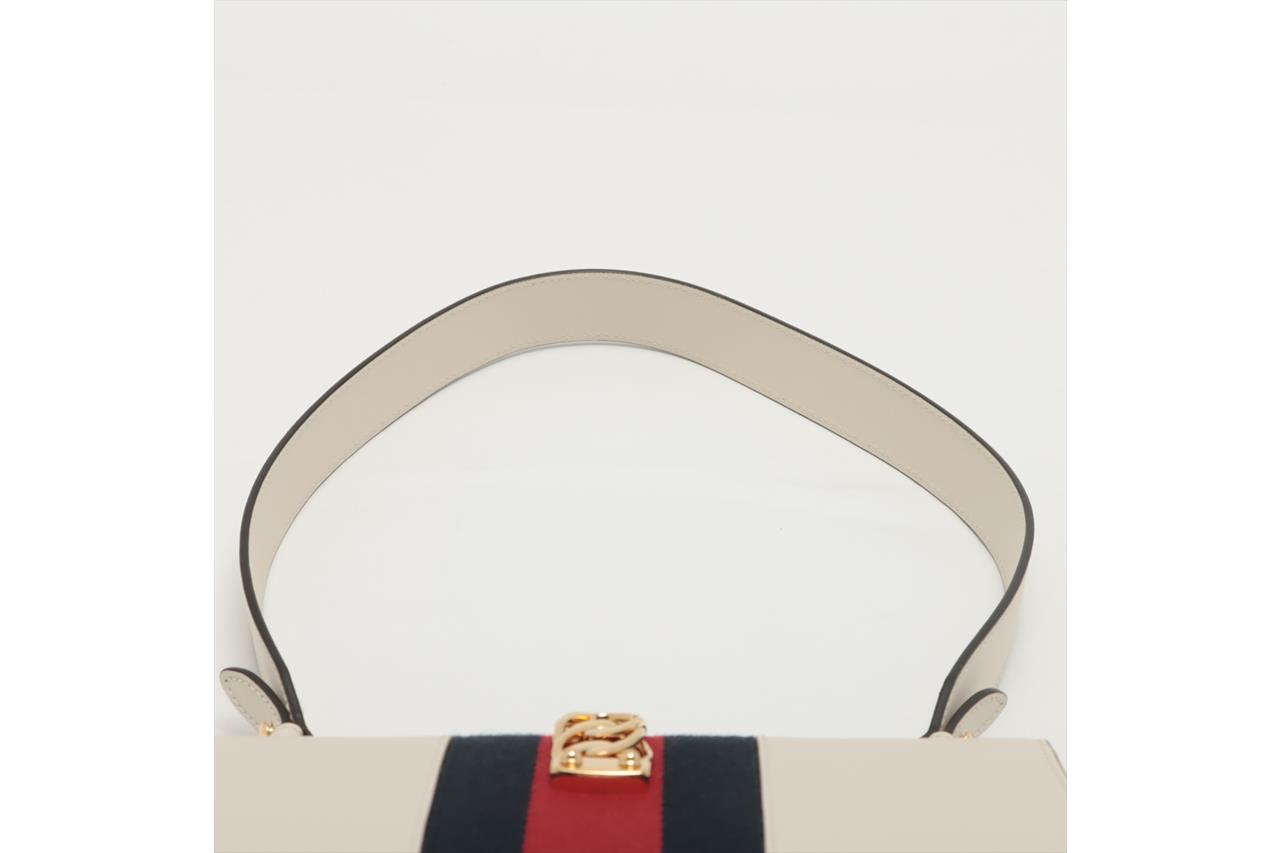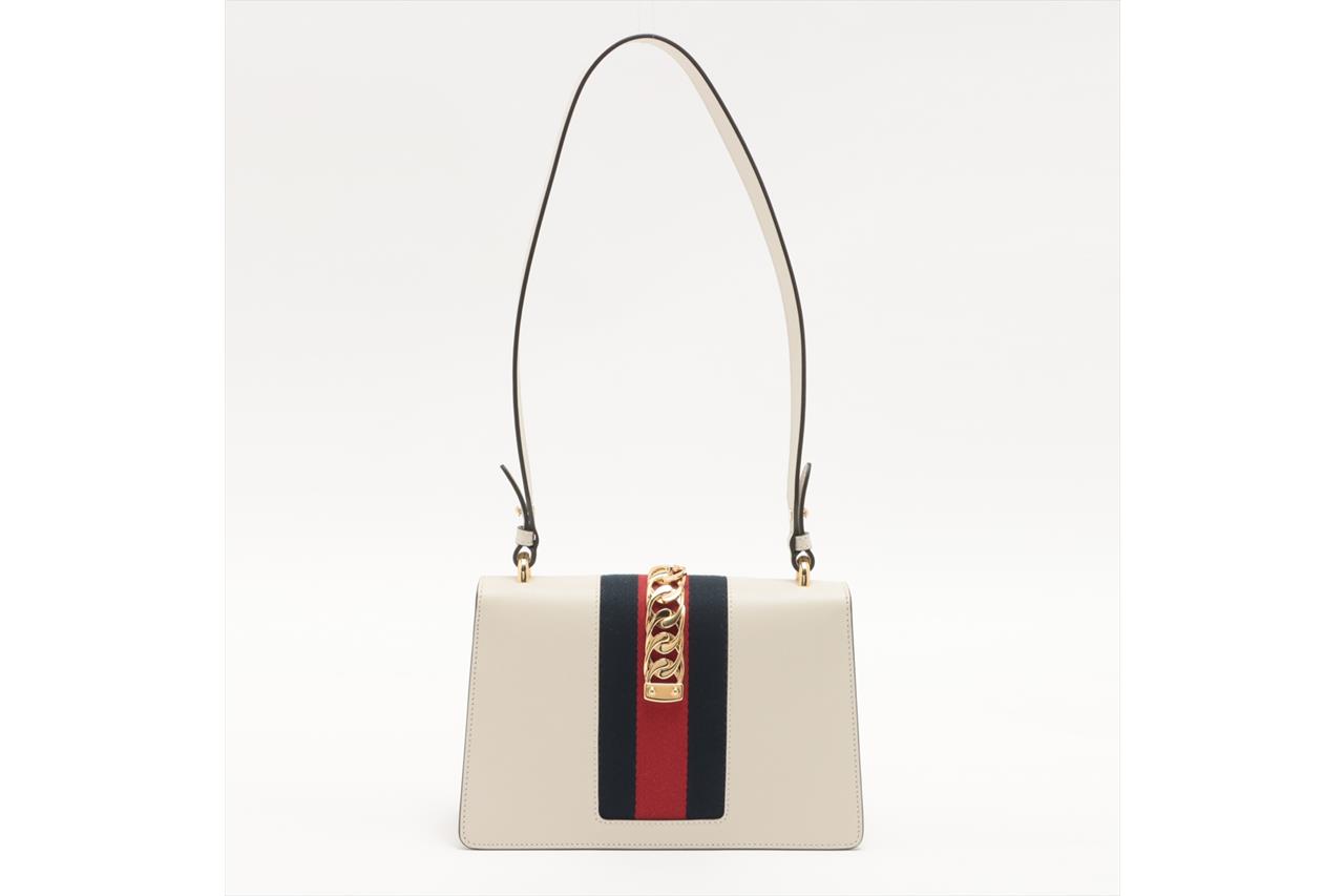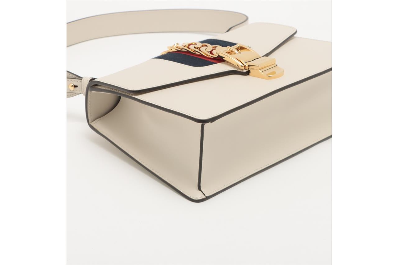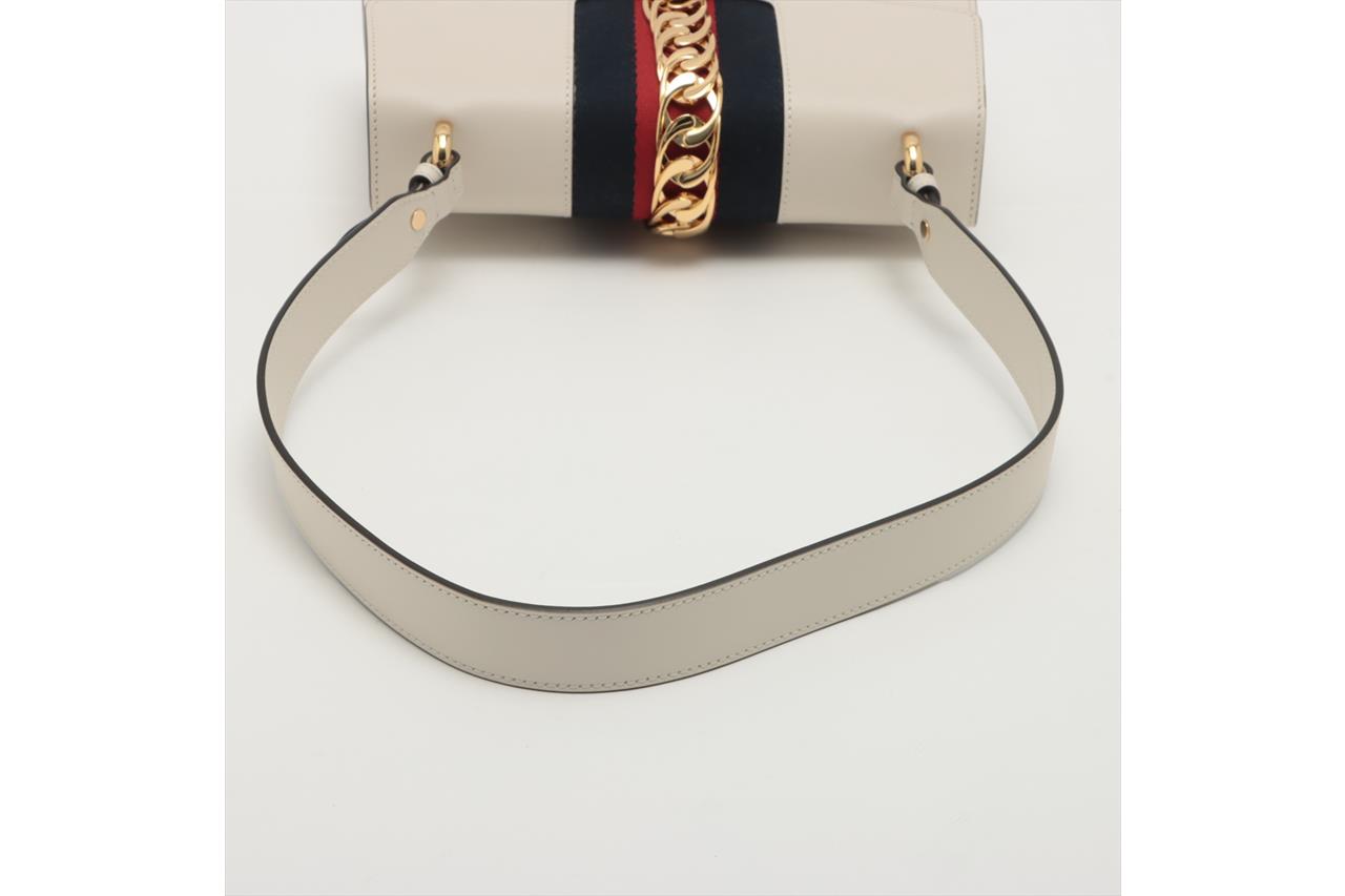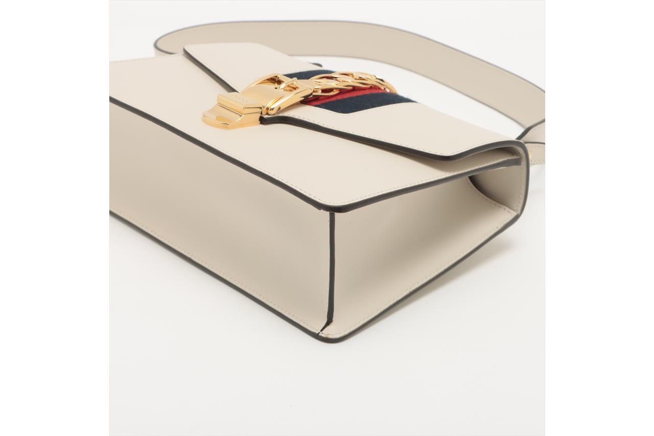 Gucci small Sylvie shoulder bag in off white calfskin leather. Featuring a front flap detailed with a central red and navy web stripe, a chain buckle lock closure at front, gold tone hardware. The flap opens to a microfiber lining interior with zipper and patch pockets. Approximate dimensions: 26cm(W) x 17cm(H) x 8cm(D), 35cm leather strap drop. Accompanied by a stripe ribbon, Gucci info booklet and dust bag. With Entrupy Certificate of Authenticity. (Pre-owned)