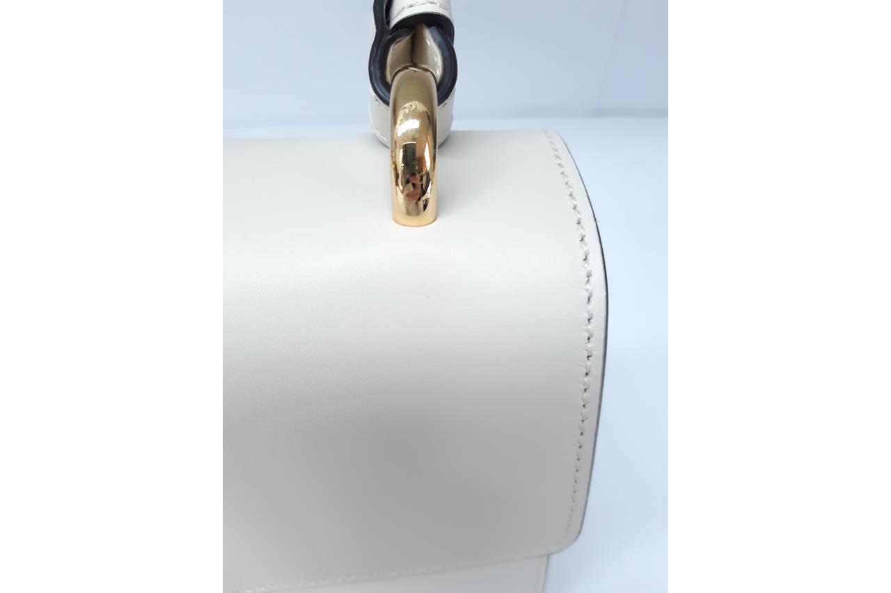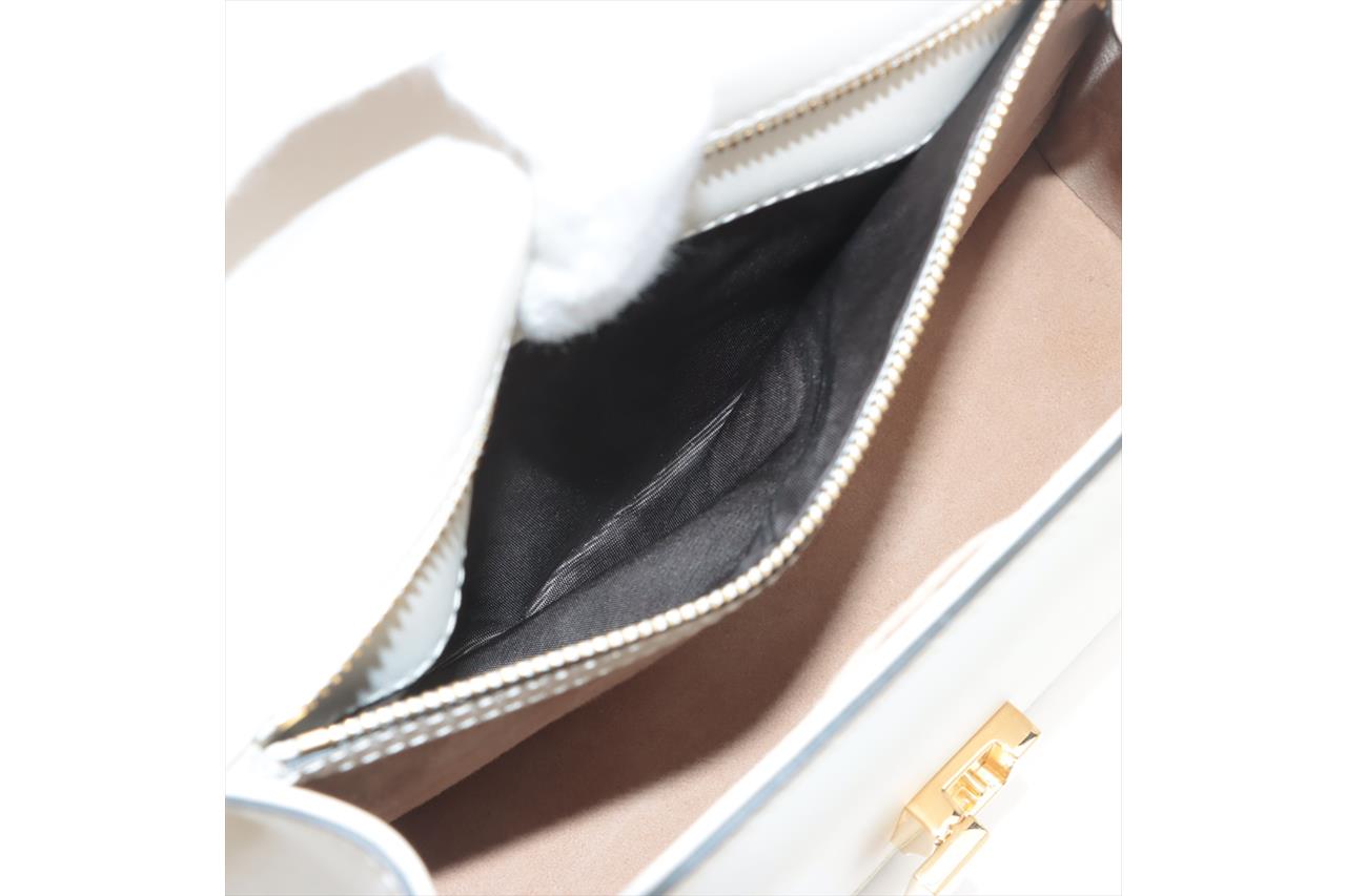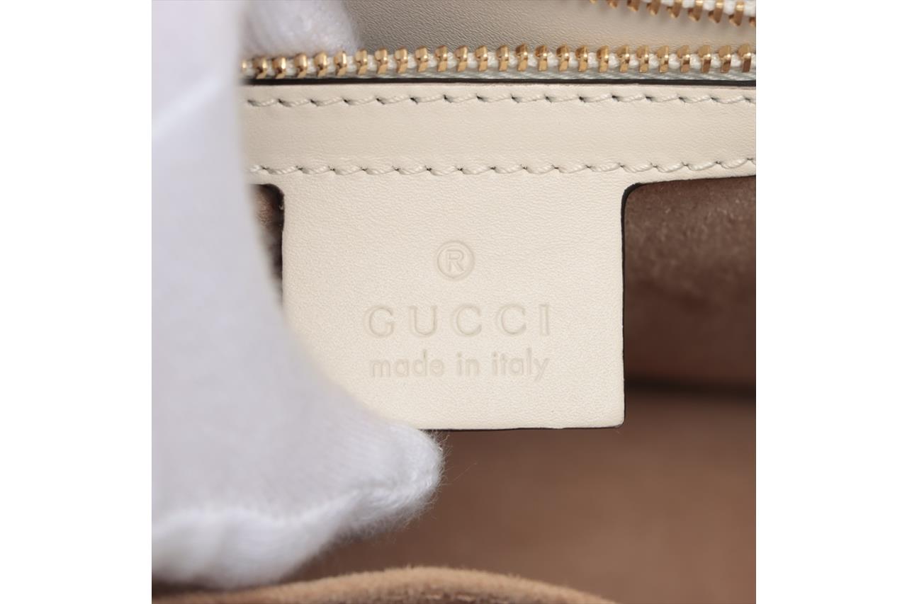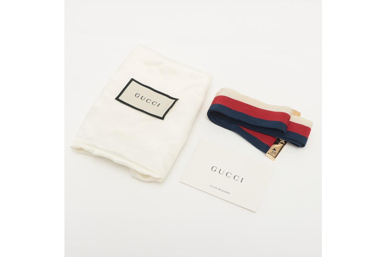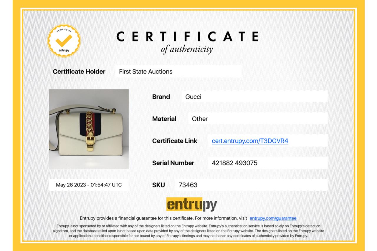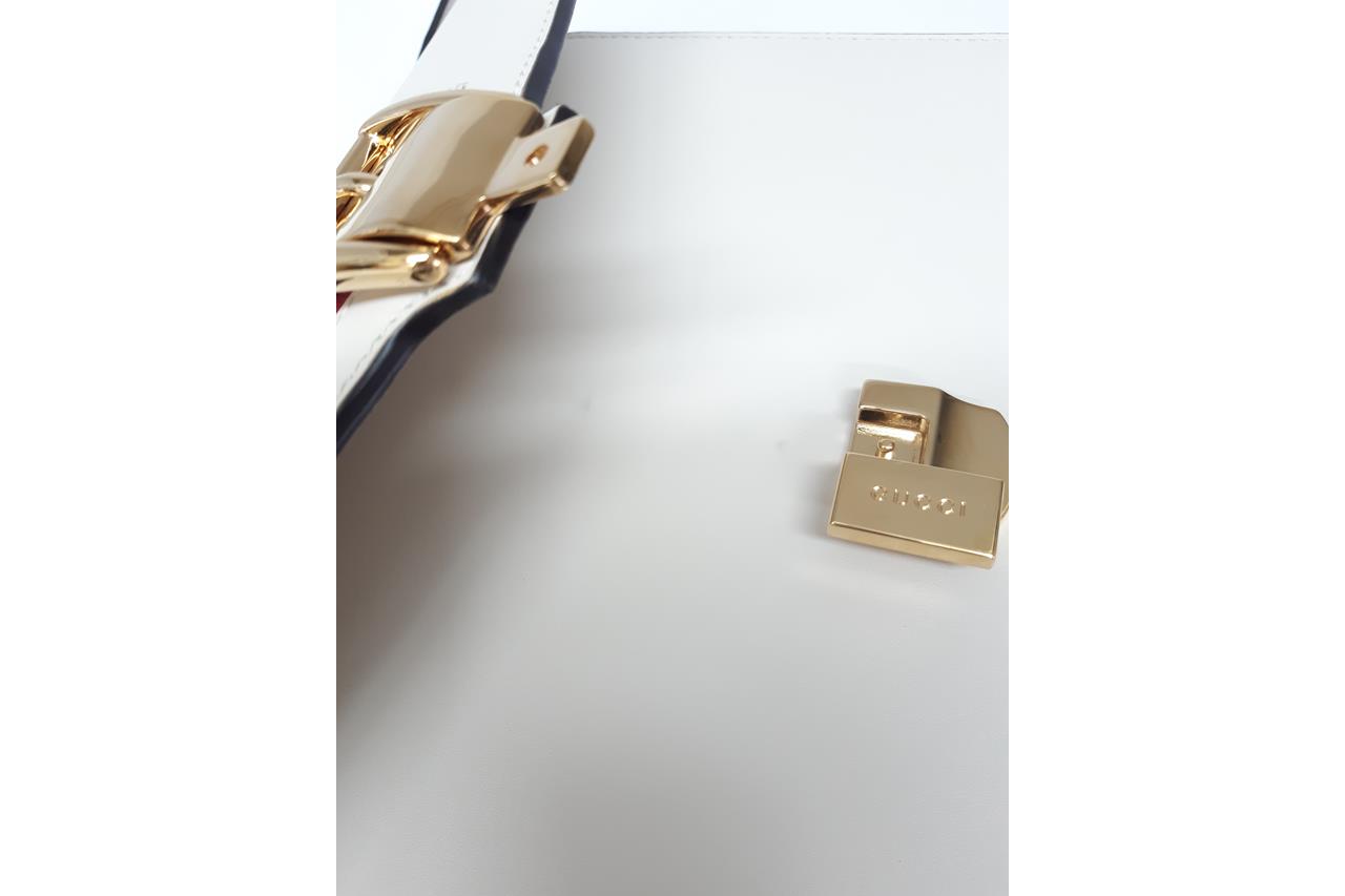Gucci small Sylvie shoulder bag in off white calfskin leather. Featuring a front flap detailed with a central red and navy web stripe, a chain buckle lock closure at front, gold tone hardware. The flap opens to a microfiber lining interior with zipper and patch pockets. Approximate dimensions: 26cm(W) x 17cm(H) x 8cm(D), 35cm leather strap drop. Accompanied by a stripe ribbon, Gucci info booklet and dust bag. With Entrupy Certificate of Authenticity. (Pre-owned)