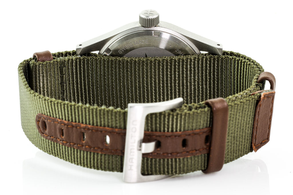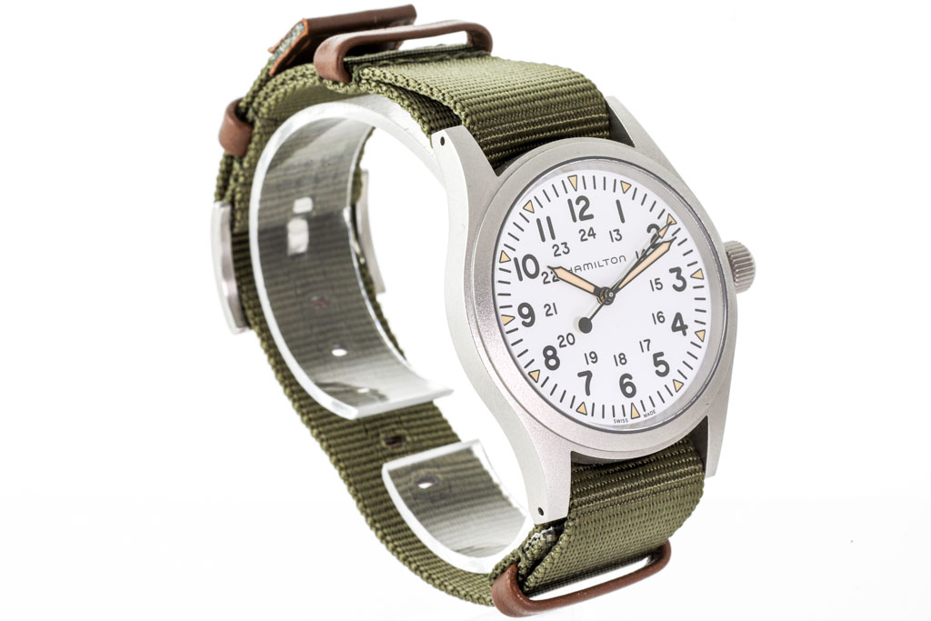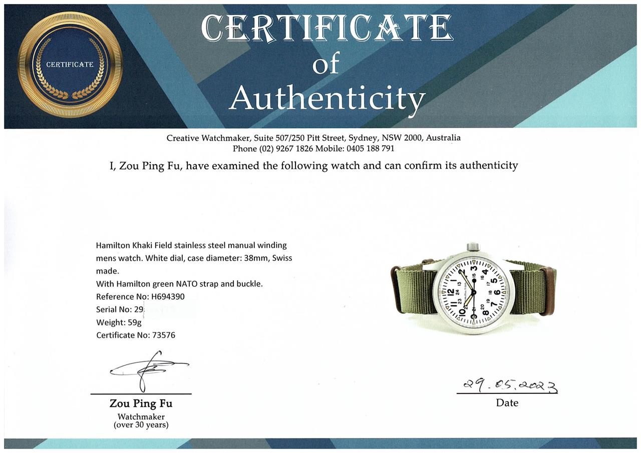 Hamilton Khaki Field stainless steel manual winding mens watch. White dial, case diameter: 38mm, strap length: 21.5cm, Swiss made. Ref# H694390. With Hamilton green NATO strap and buckle. With Certificate of Authenticity, Undated Hamilton Warranty card and Hamilton box. 3 month FSA warranty. (Pre-owned)