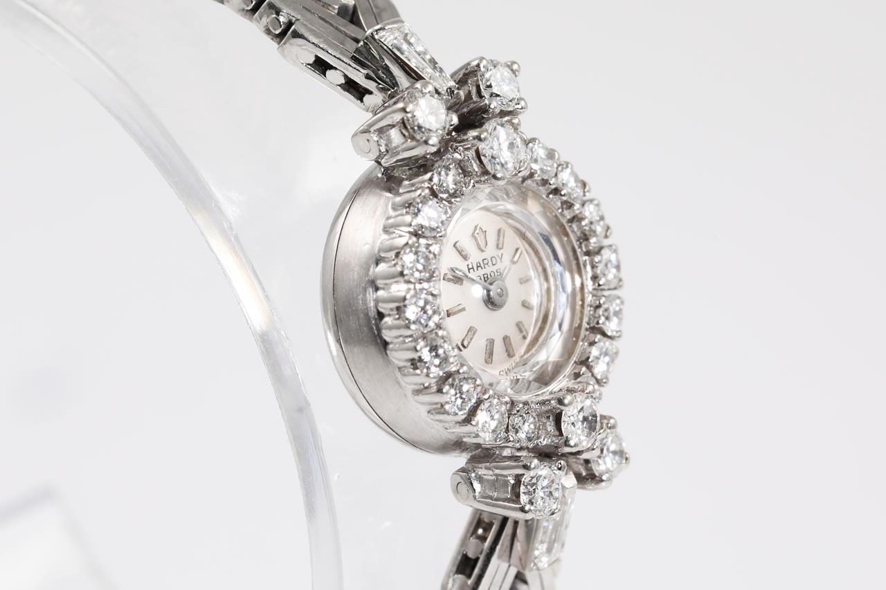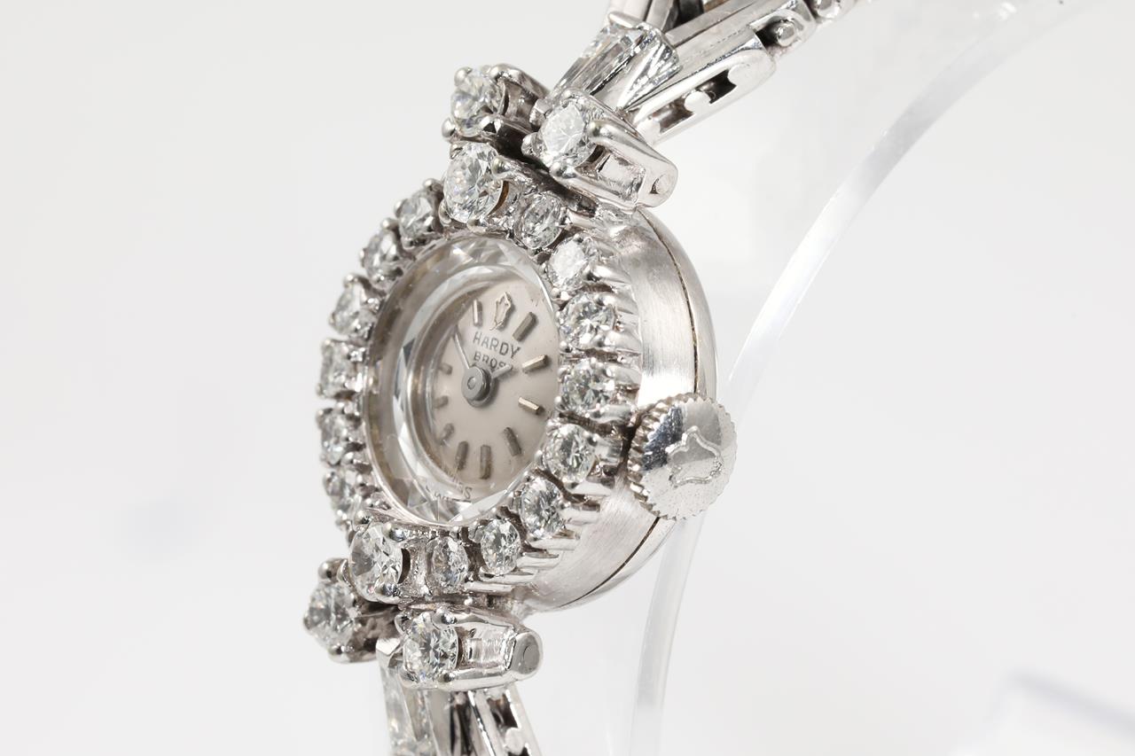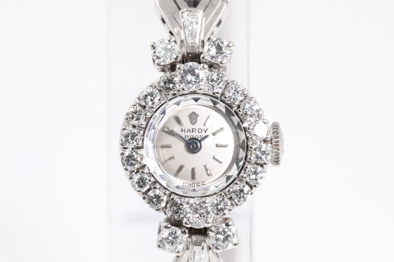 Hardy Brothers 18ct white gold manual winding ladies watch. Silver dial, Diamond set bezel and lugs totalling approximately 1.00cts (Estimated grading H-I, SI), case diameter: 15mm, wrist size: 16cm, Swiss made. With 18ct white gold bracelet and clasp. With Certificate of Authenticity. Weight: 29.8g. 3 month FSA warranty. (Pre-owned)