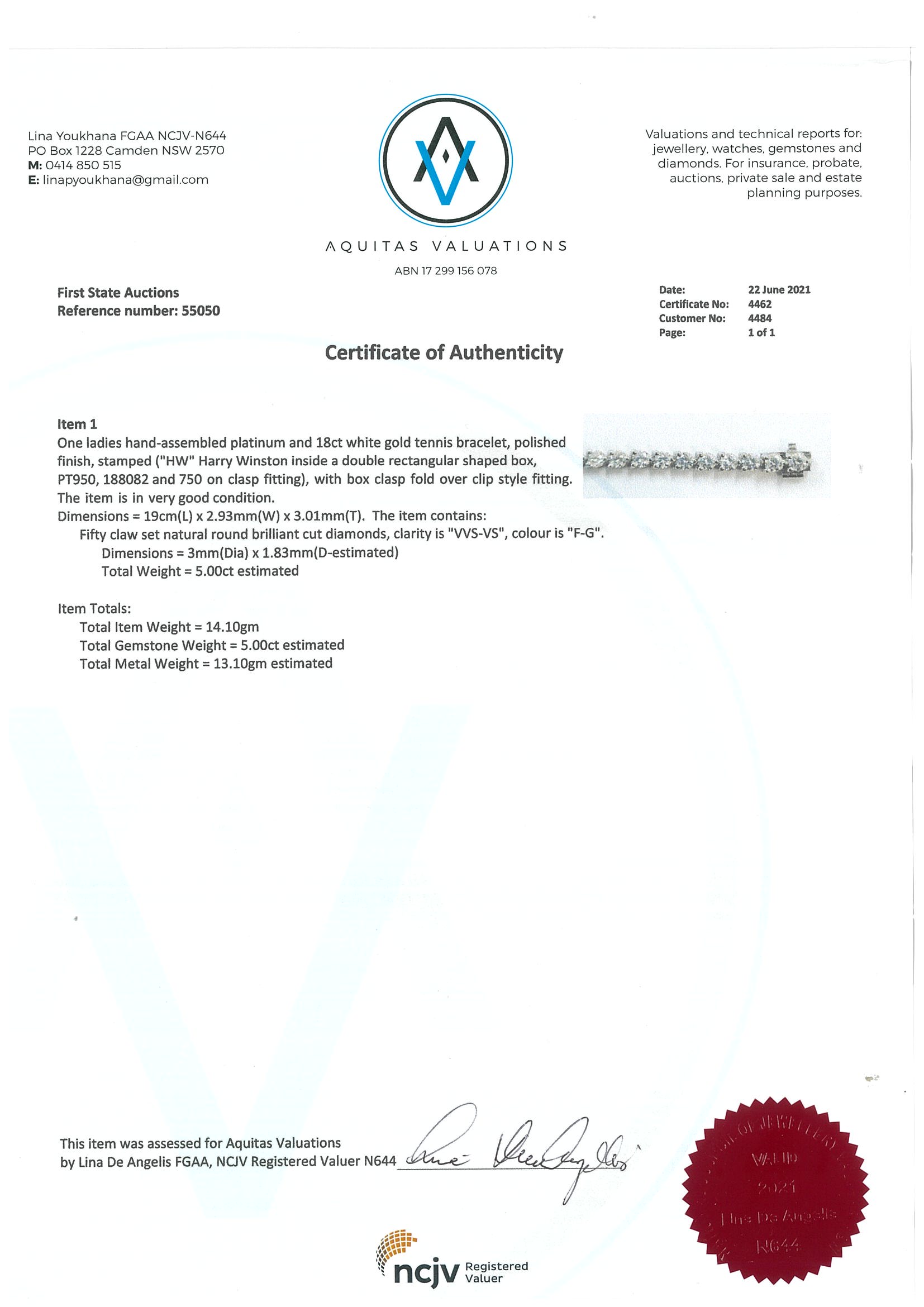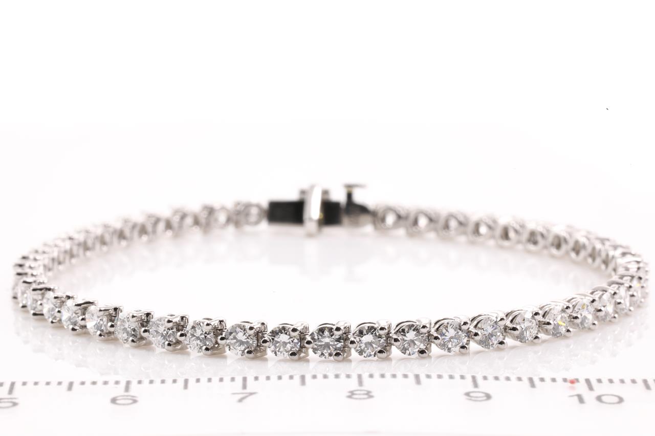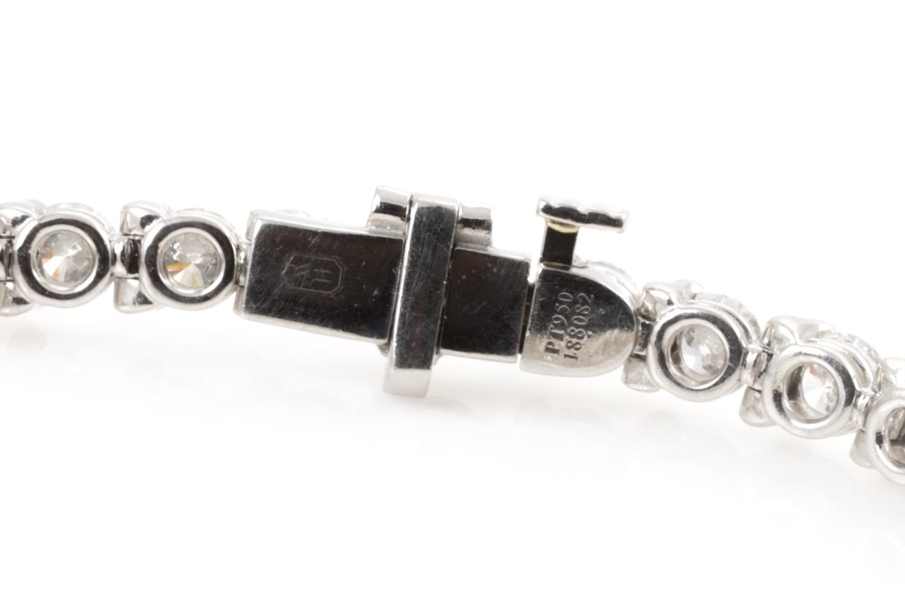 Harry Winston Diamond tennis bracelet with round Diamonds totalling approximately 5.00cts (Estimated grading: F-G VVS-VS). Platinum with 18ct white gold tongue. Length: 19cm. Weight: 14.1cm. With certificate #4462. With Harry Winston pouch. (Pre-owned)