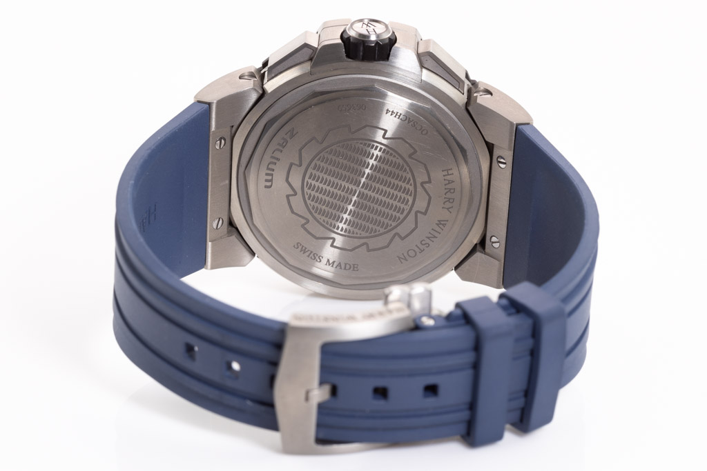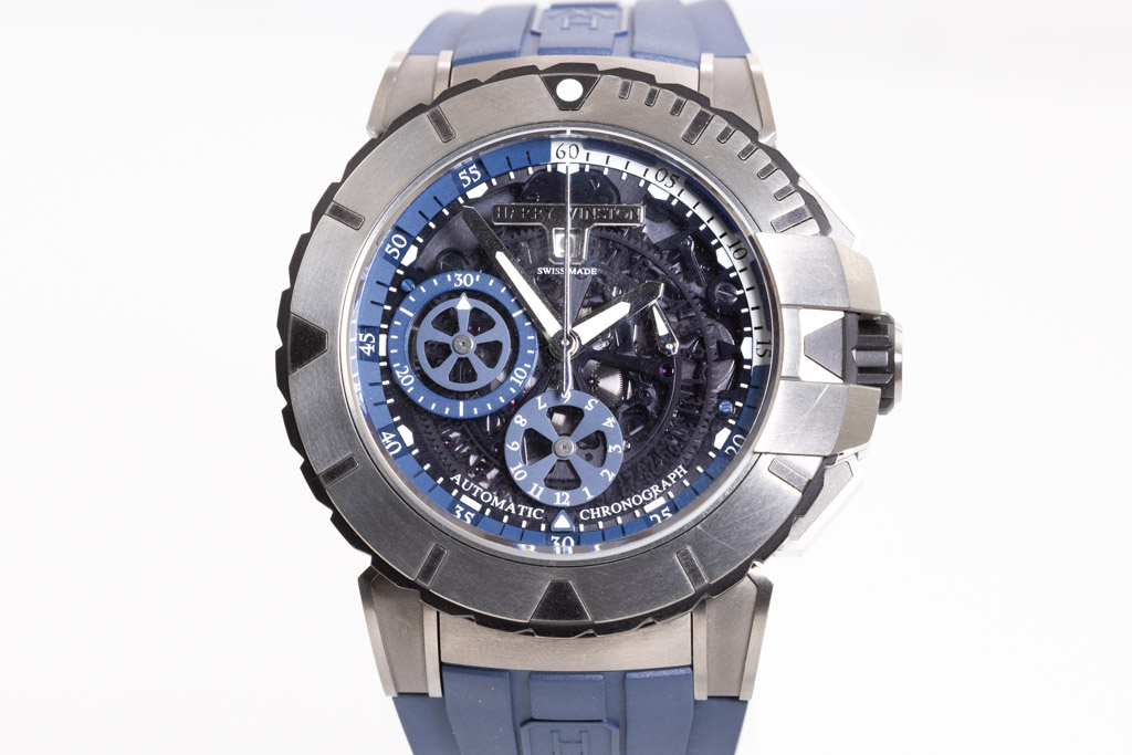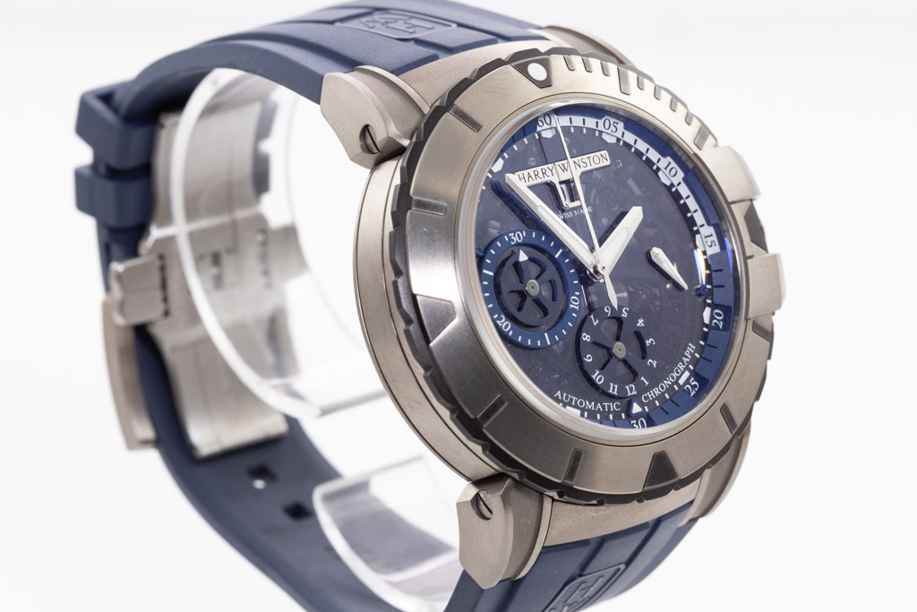 Harry Winston Ocean Sports zalium automatic men's watch. Blue Skeleton Chronograph dial, date, case diameter: 44mm, adjustable max wrist size: 19.5cm, Swiss made. Ref# OCSACH44ZZ007. With Harry Winston blue rubber strap and clasp. With Certificate of Authenticity, Harry Winston International Warranty booklet dated 06/07/2021 and Harry Winston box. 3 month FSA warranty. (Pre-owned)