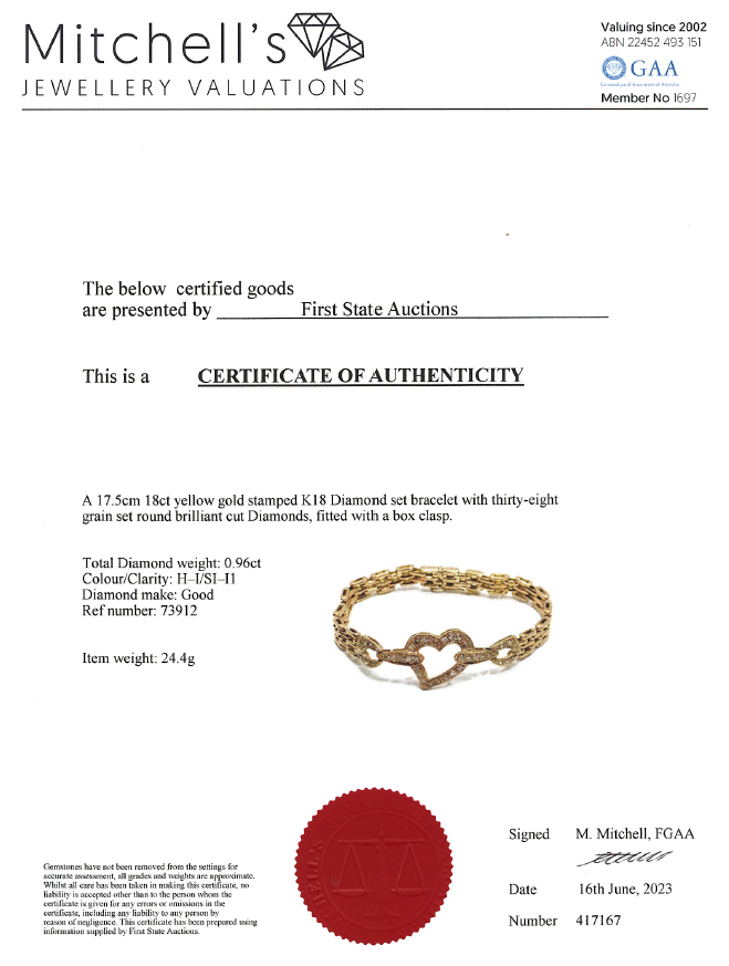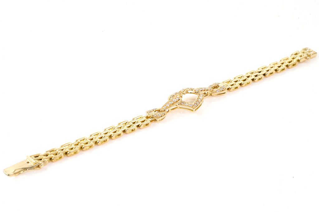 Diamond bracelet with round Diamonds totalling 0.96cts (Estimated grading: H-I SI-P1). 18ct yellow gold. Length: 17.5cm. Weight: 24.4g. With certificate #417167. (Pre-owned)