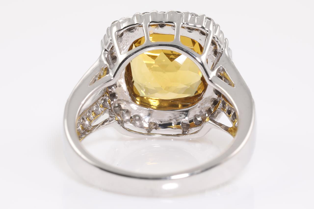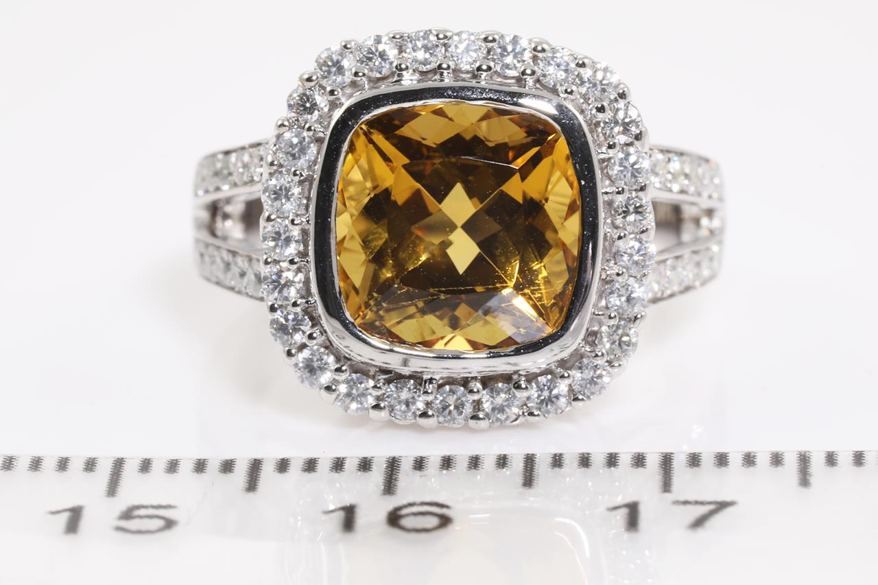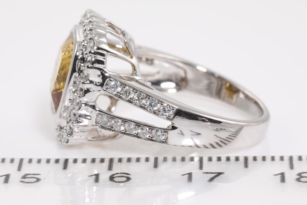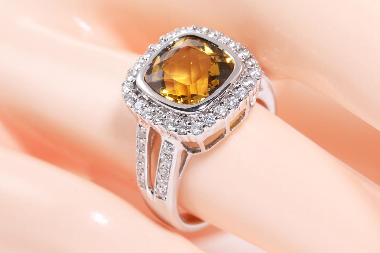 Helidor and Diamond Ring with cushion cut Heliodor of approximately 3.24ct and round Diamonds totalling approximately 0.59cts (Estimated grading: H SI). 14ct white gold. Ring size L. Weight 6.1g. (Pre-owned)