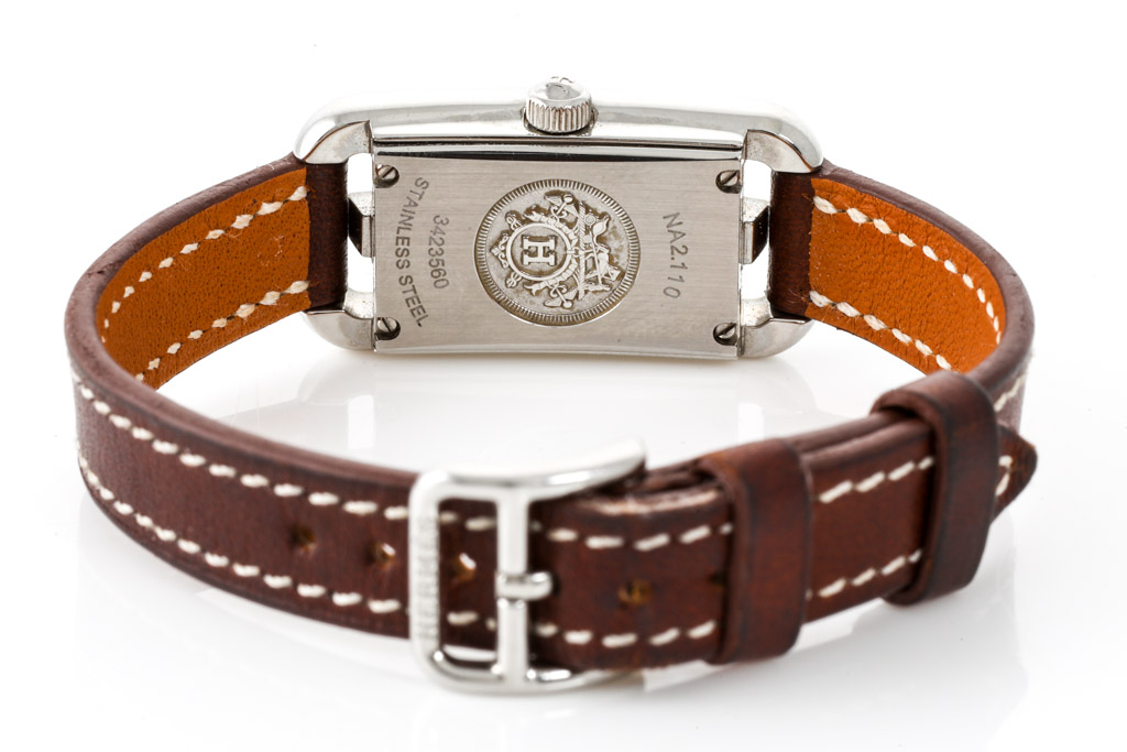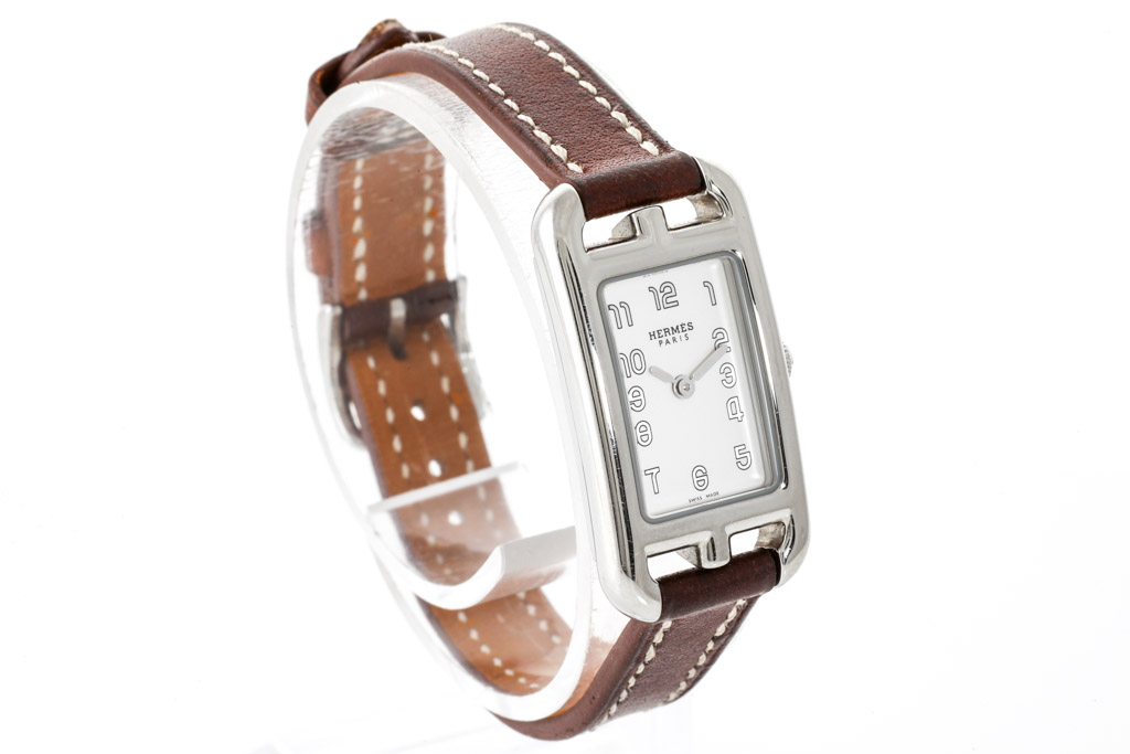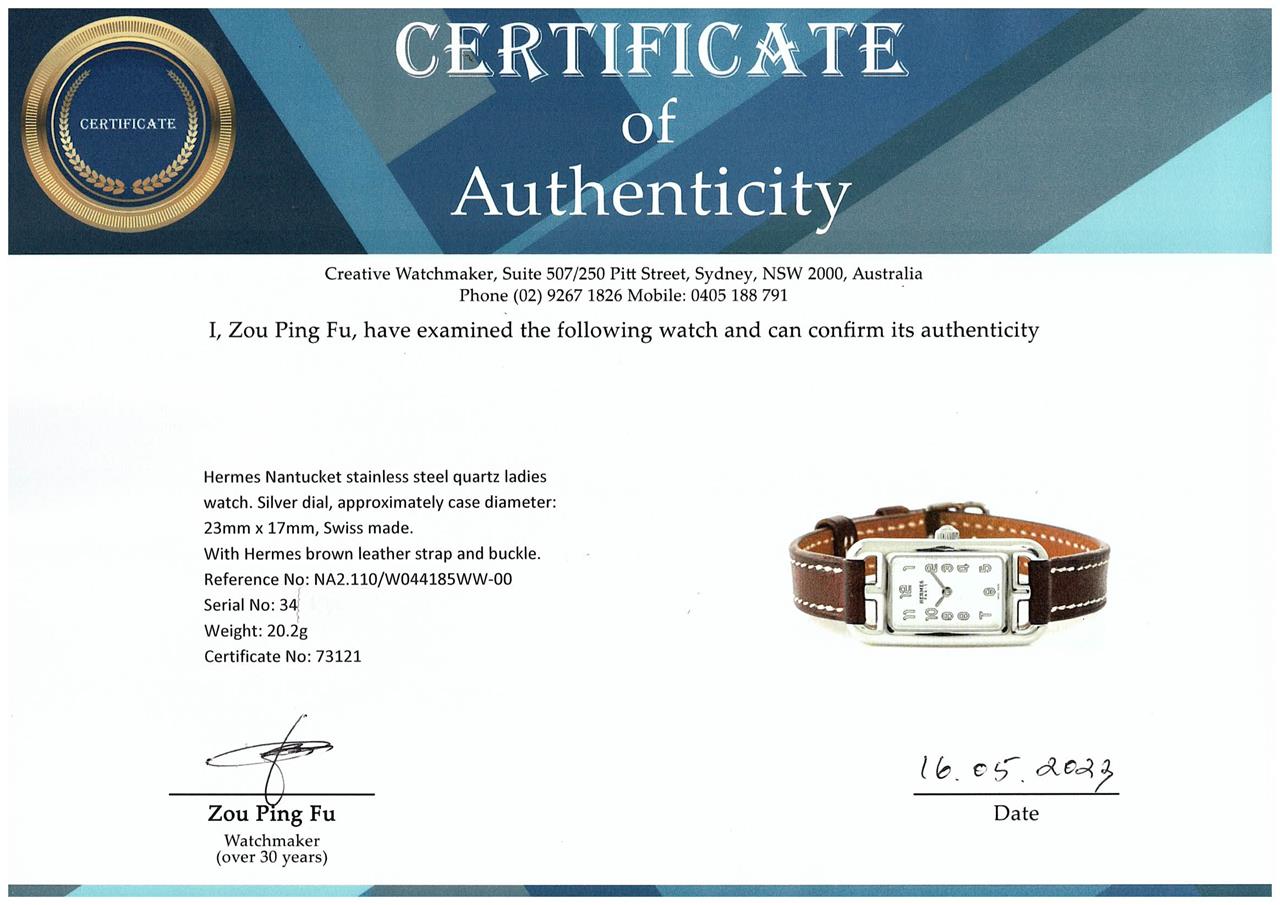 Hermes Nantucket stainless steel quartz ladies watch. Silver dial, approximately case diameter: 23mm x 17mm, strap length: 17cm, Swiss made. Ref# NA2.110/W044185WW-00. With Hermes brown leather strap and buckle. With Certificate of Authenticity, Hermes International Guarantee booklet dated 07/09/2020 and Hermes box. 3 month FSA warranty. (Pre-owned)