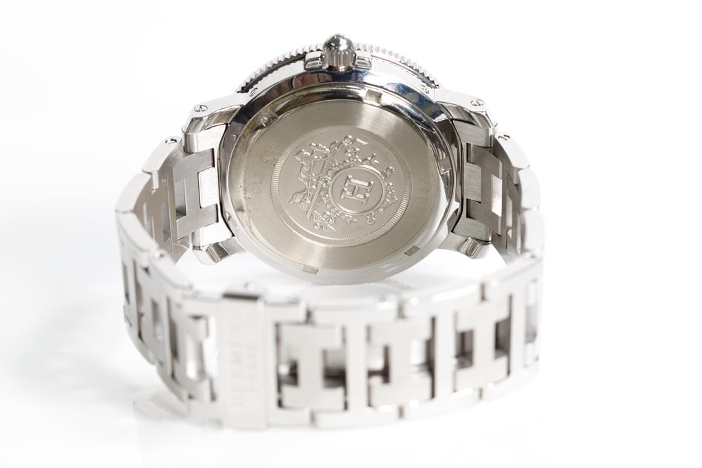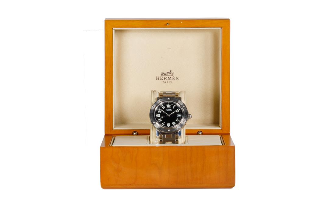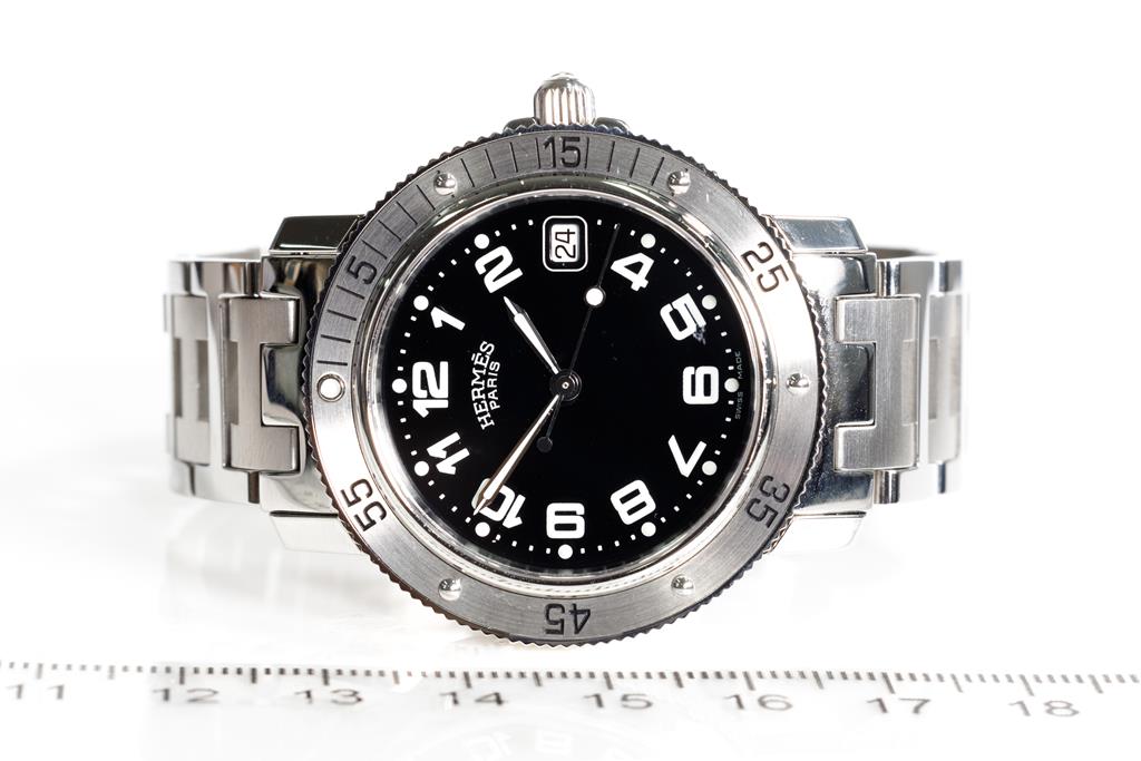 Hermès Clipper stainless steel quartz mens watch. Black dial, date, case diameter: 38mm, wrist size: 15.5cm, Swiss made. Ref# CL7.710. With Hermès stainless steel bracelet and clasp. With Certificate of Authenticity and Hermès box. 3 month FSA warranty. (Pre-owned)