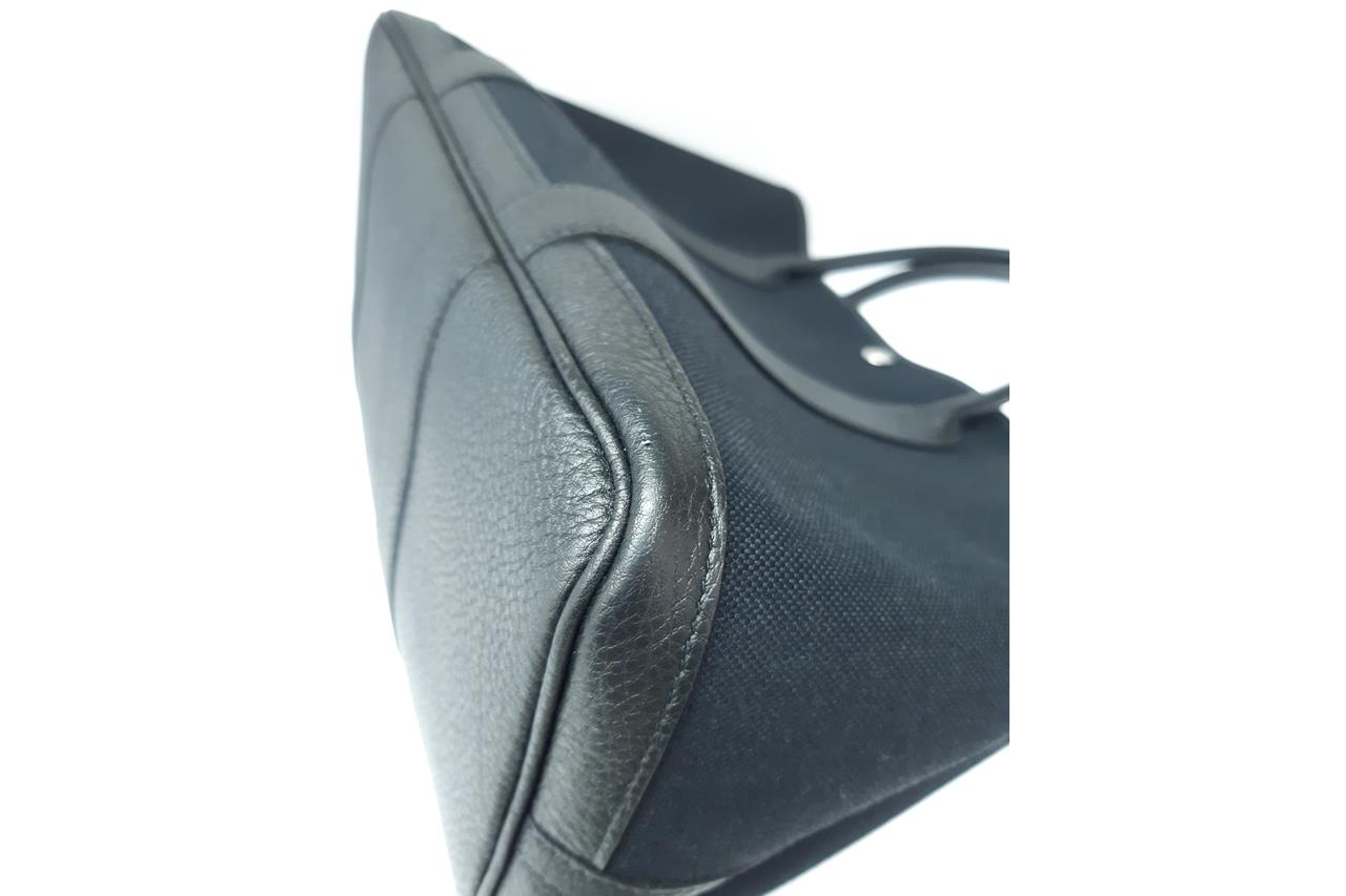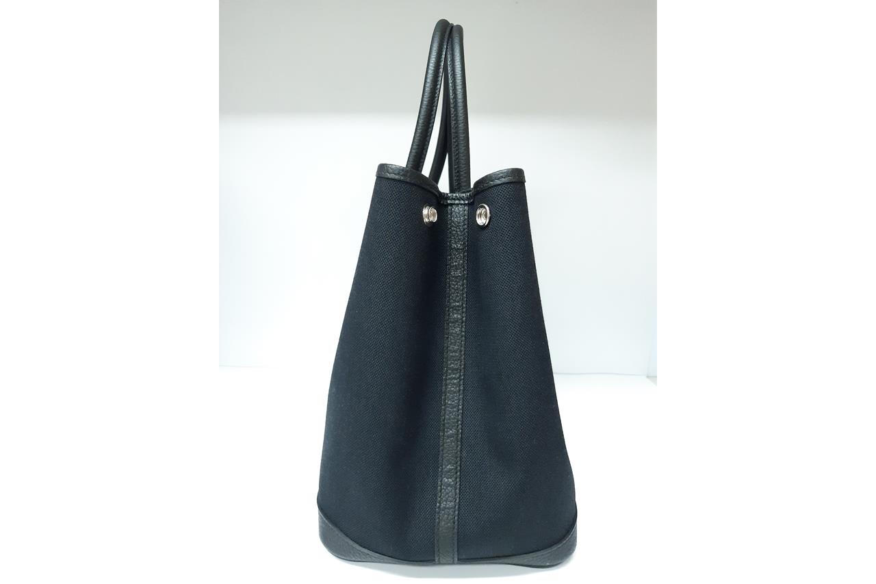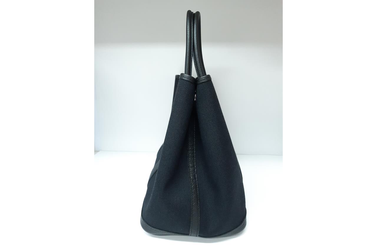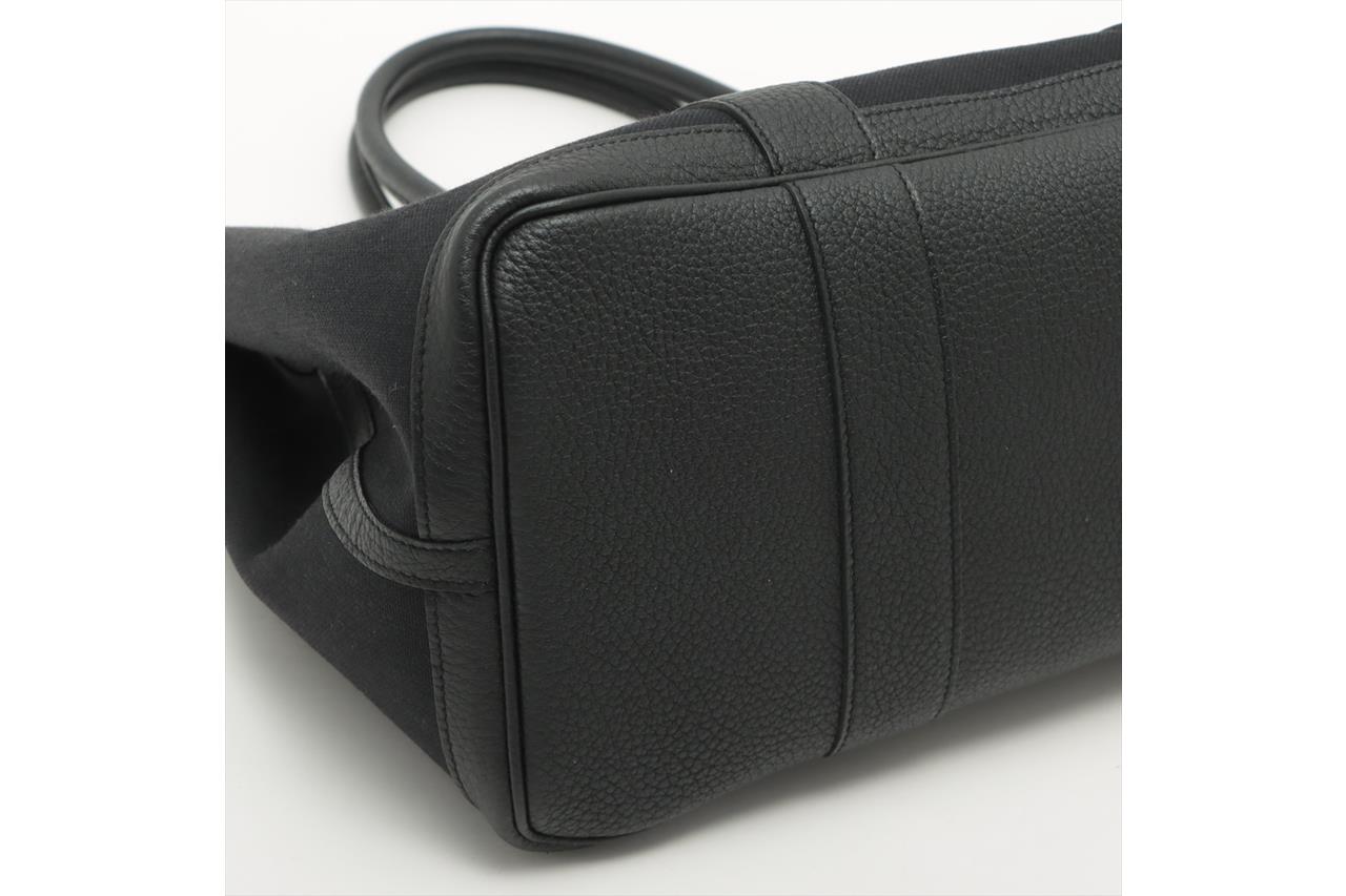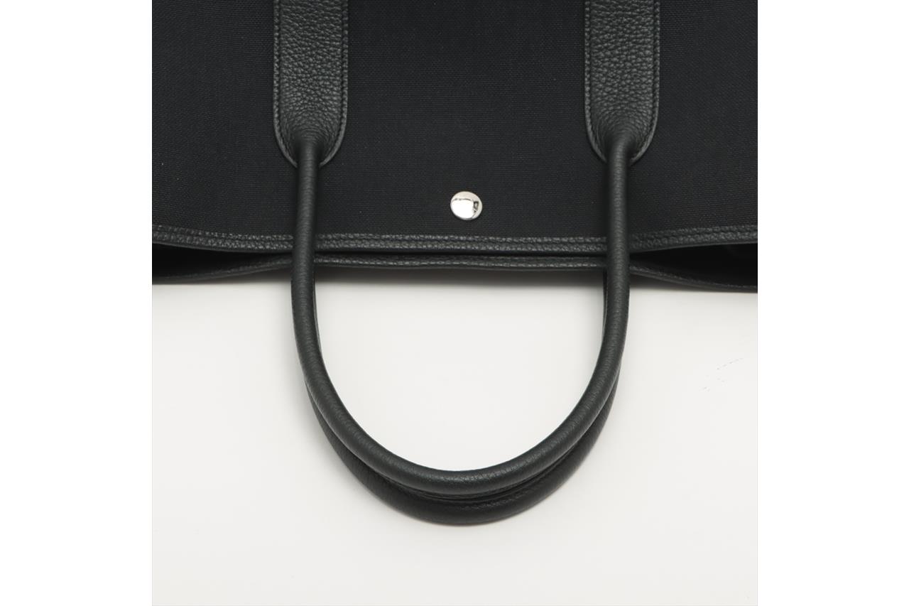 Hermès Garden Party 36 bag in black canvas and leather. Stamp:D. (Circa:2019). Featuring silver-tone hardware, dual rolled leather handles, snap button closure on sides and front. The top opens to black canvas and leather interior with a main open compartment. Approximate dimensions: 36cm(L) x 25cm(H) x 17.5cm(D), 14cm handle drop. Accompanied by Hermes dust bag. With Entrupy Certificate of Authenticity. (Pre-owned)