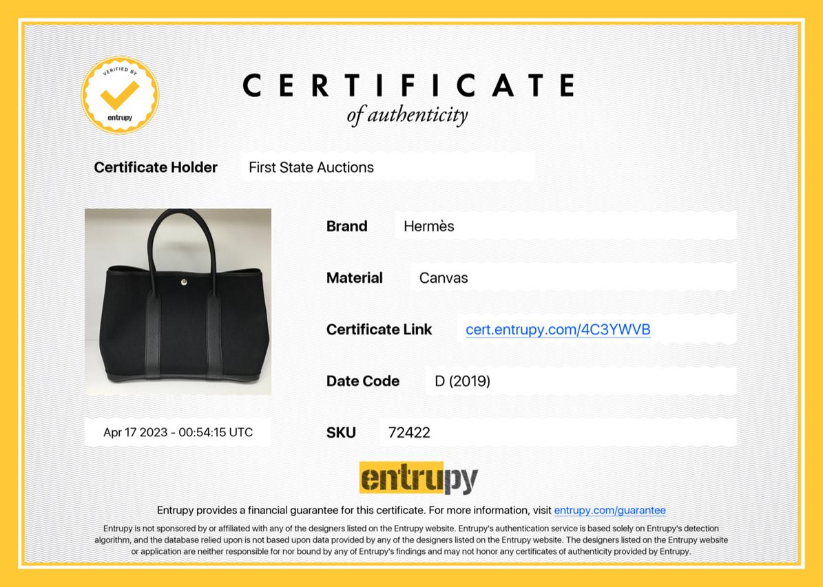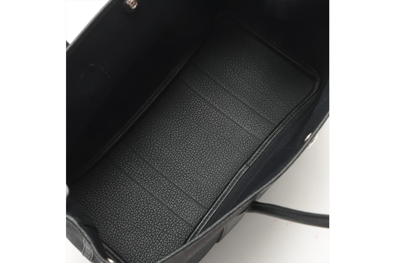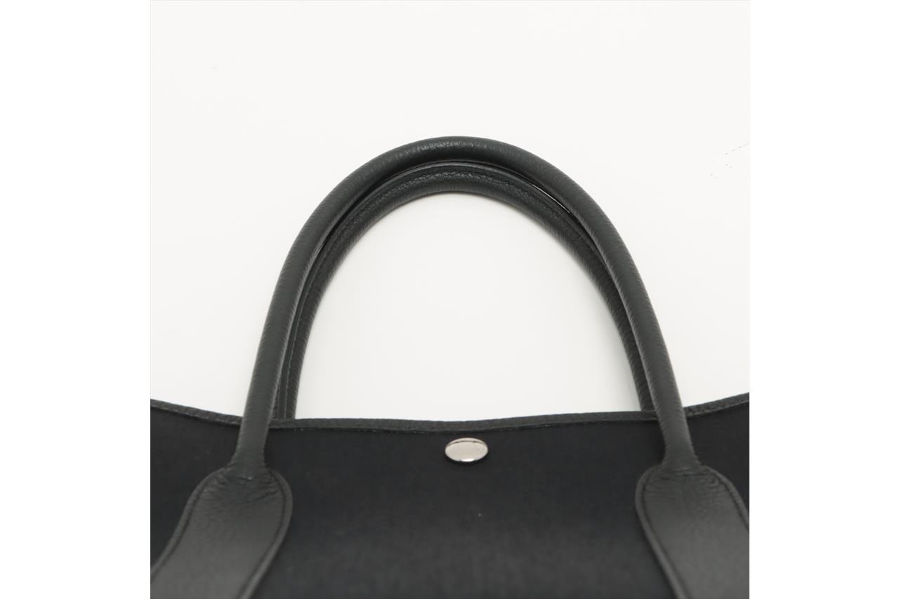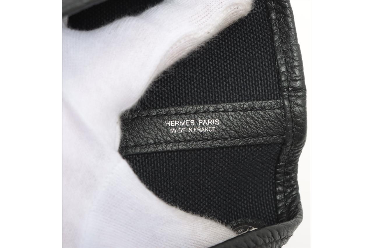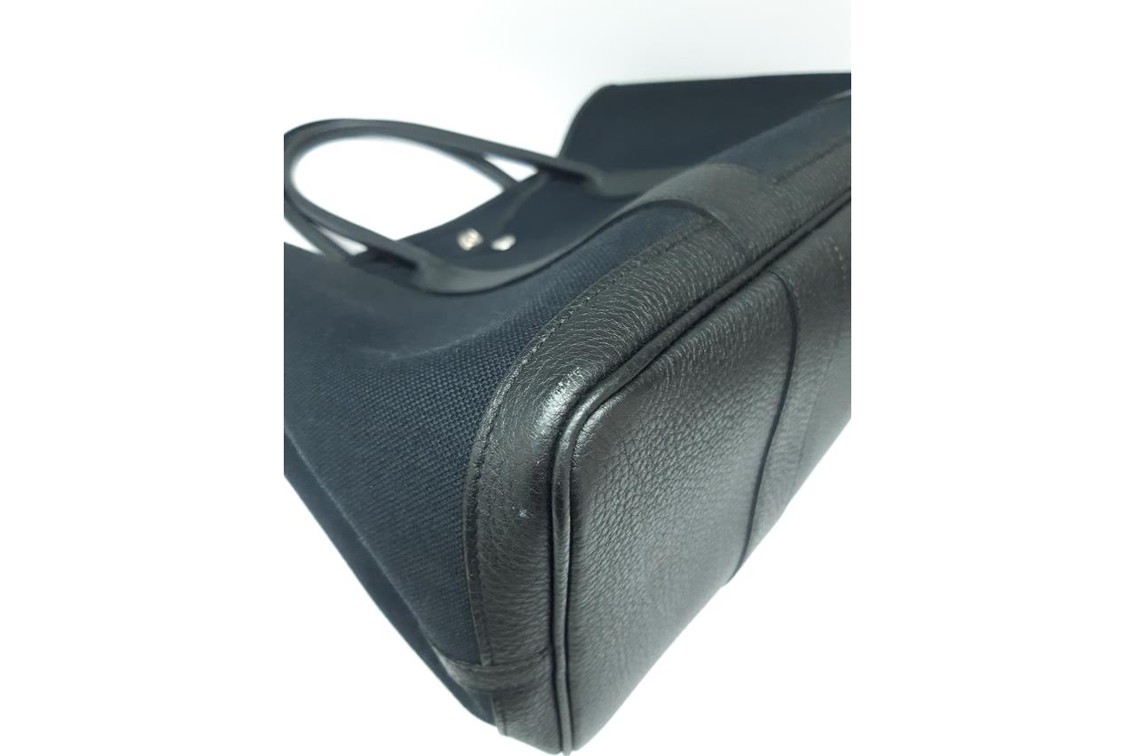 Hermès Garden Party 36 bag in black canvas and leather. Stamp:D. (Circa:2019). Featuring silver-tone hardware, dual rolled leather handles, snap button closure on sides and front. The top opens to black canvas and leather interior with a main open compartment. Approximate dimensions: 36cm(L) x 25cm(H) x 17.5cm(D), 14cm handle drop. Accompanied by Hermes dust bag. With Entrupy Certificate of Authenticity. (Pre-owned)