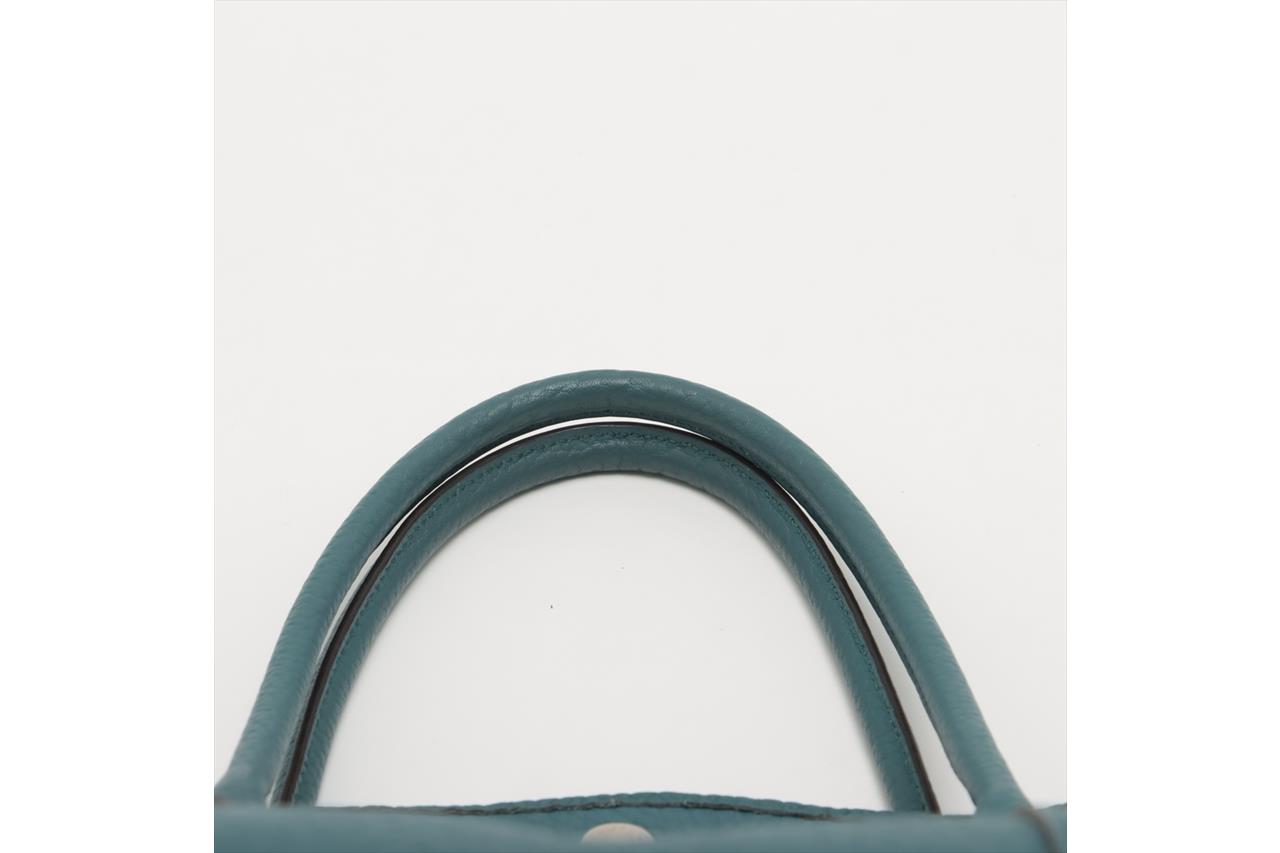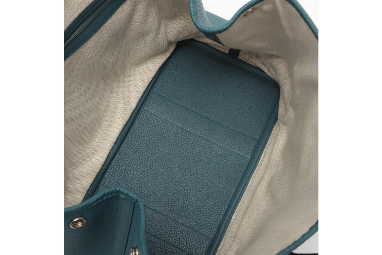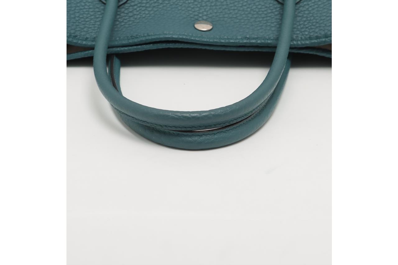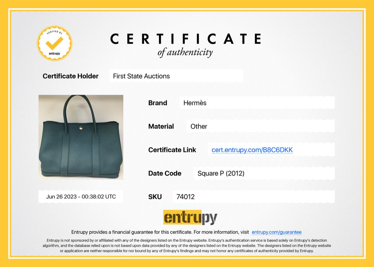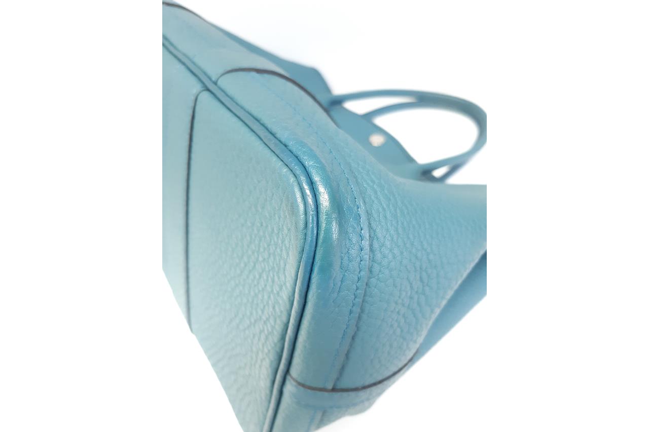 Hermès Garden Party 36 bag in turquoise colour Negonda leather. Stamp:P in square. (Circa:2012). Featuring silver-tone hardware, dual rolled leather handles, snap button closure on sides and front. The top opens to a beige canvas and turquoise leather interior with a main open compartment and a zipped pocket. Approximate dimensions: 36cm(L) x 25cm(H) x 17.5cm(D), 14cm handle drop. Accompanied by Hermes dust bag. With Entrupy Certificate of Authenticity. (Pre-owned)