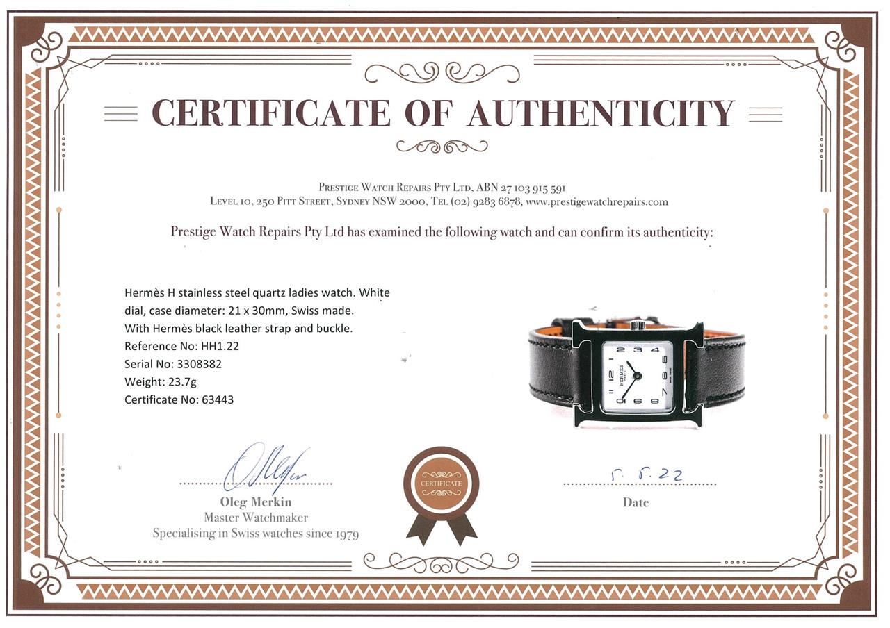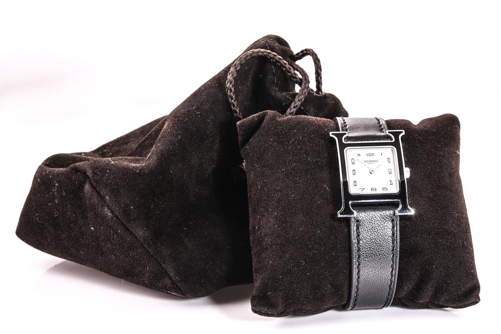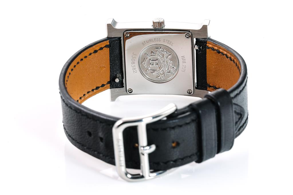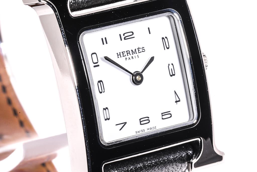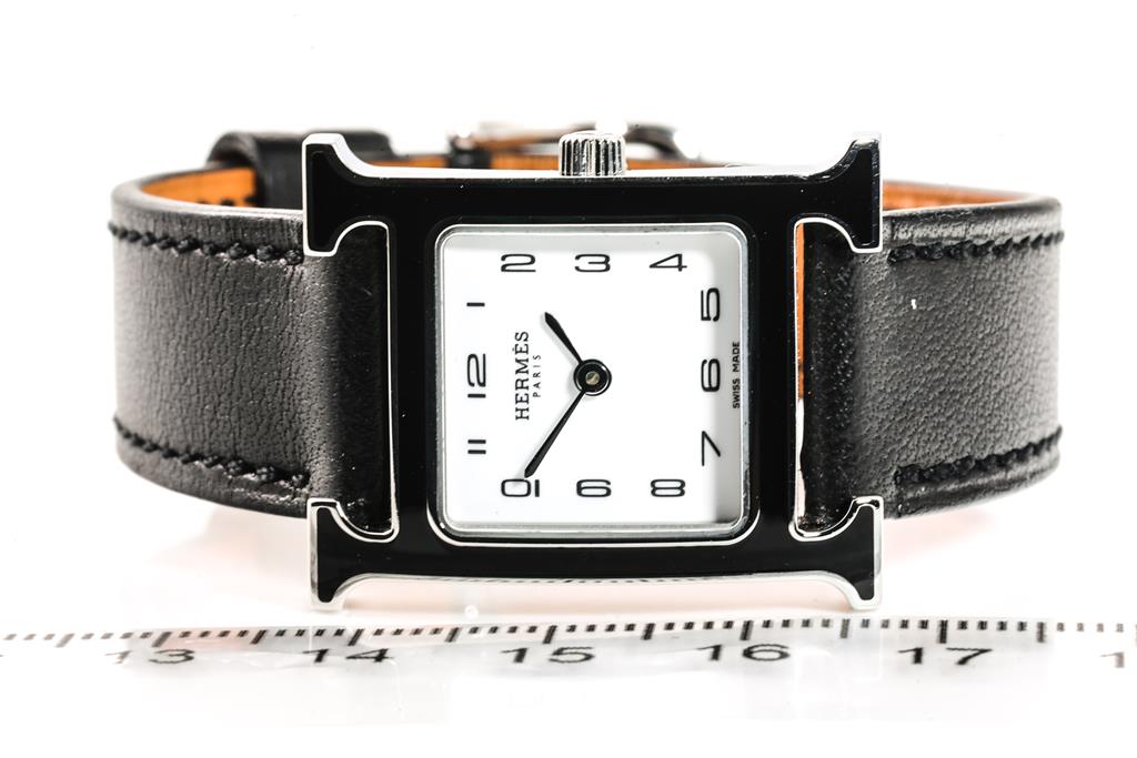 Hermès H stainless steel quartz ladies watch. White dial, case diameter: 30 x 21mm, wrist Length: 17cm, Swiss made. Ref# HH1.221. With Hermès black leather strap and buckle. With Certificate of Authenticity and Hermès pouch. 3 month FSA warranty. (Pre-owned)