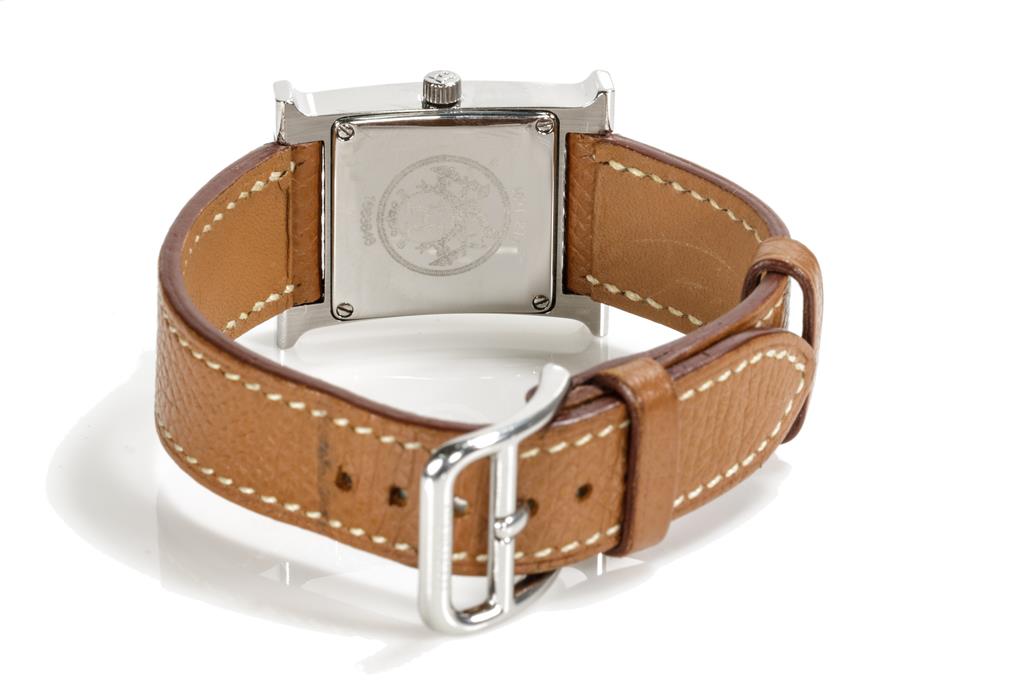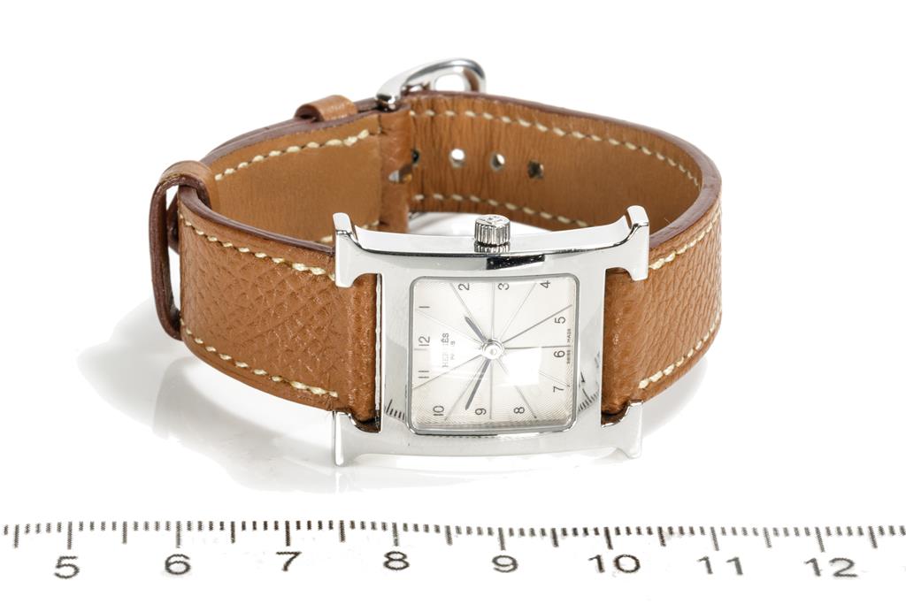 Hermès H stainless steel quartz ladies watch. Silver dial, case diameter: 30mm x 20mm, strap length: 17cm, Swiss made. Ref# HH1.210. With Hermès brown leather strap and buckle. With Certificate of Authenticity. 3 month FSA warranty. (Pre-owned)