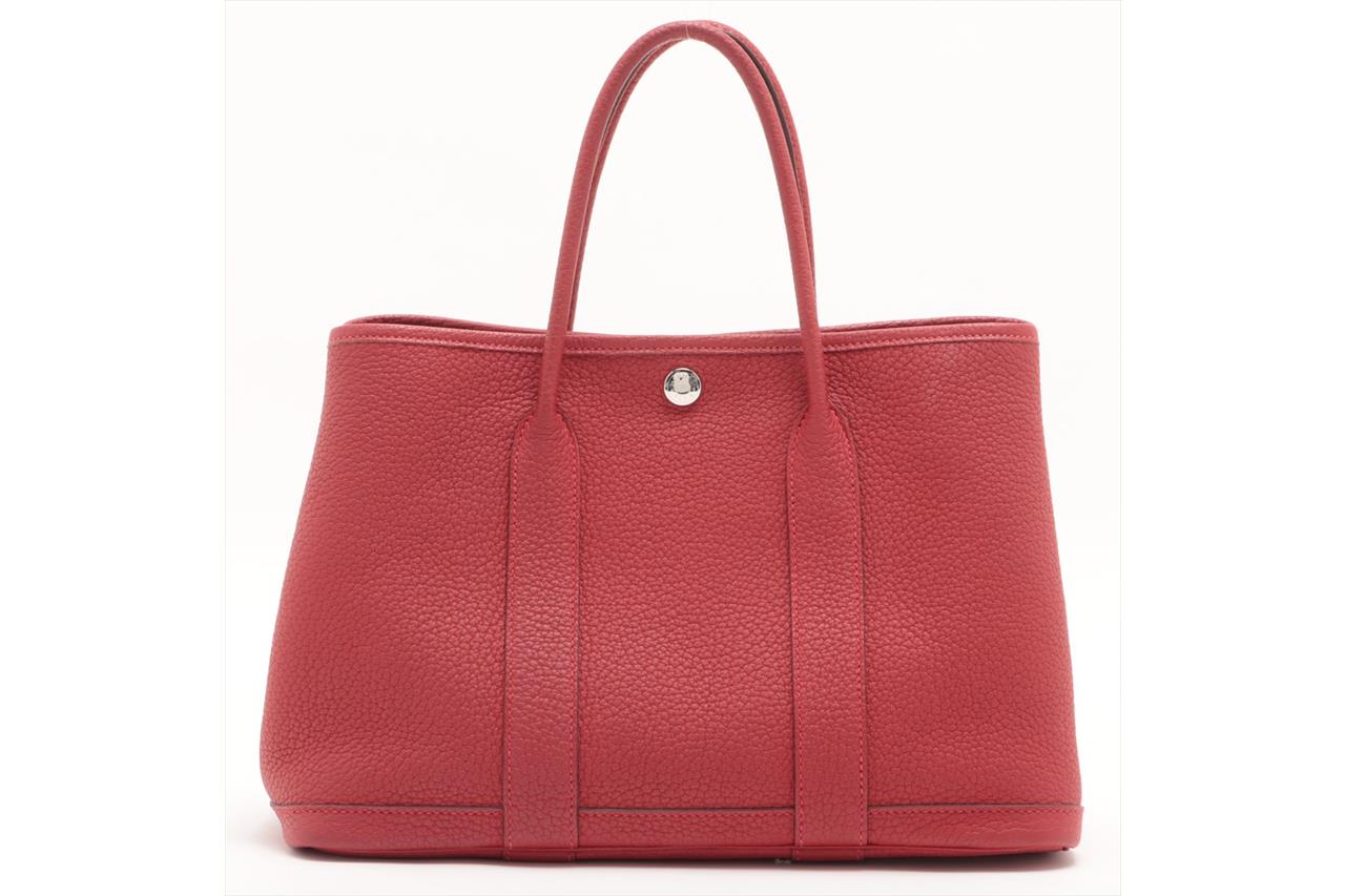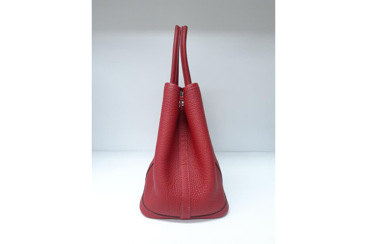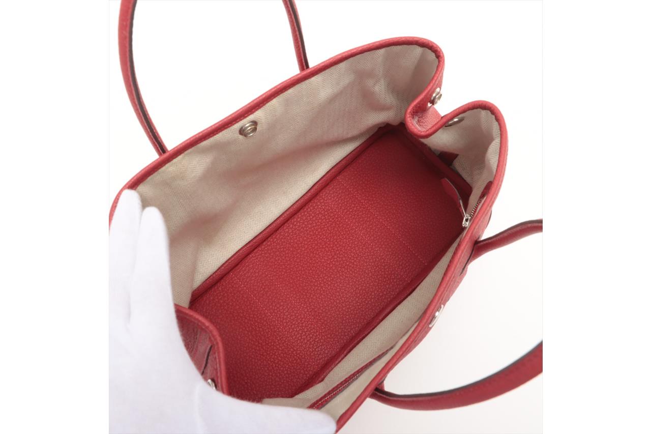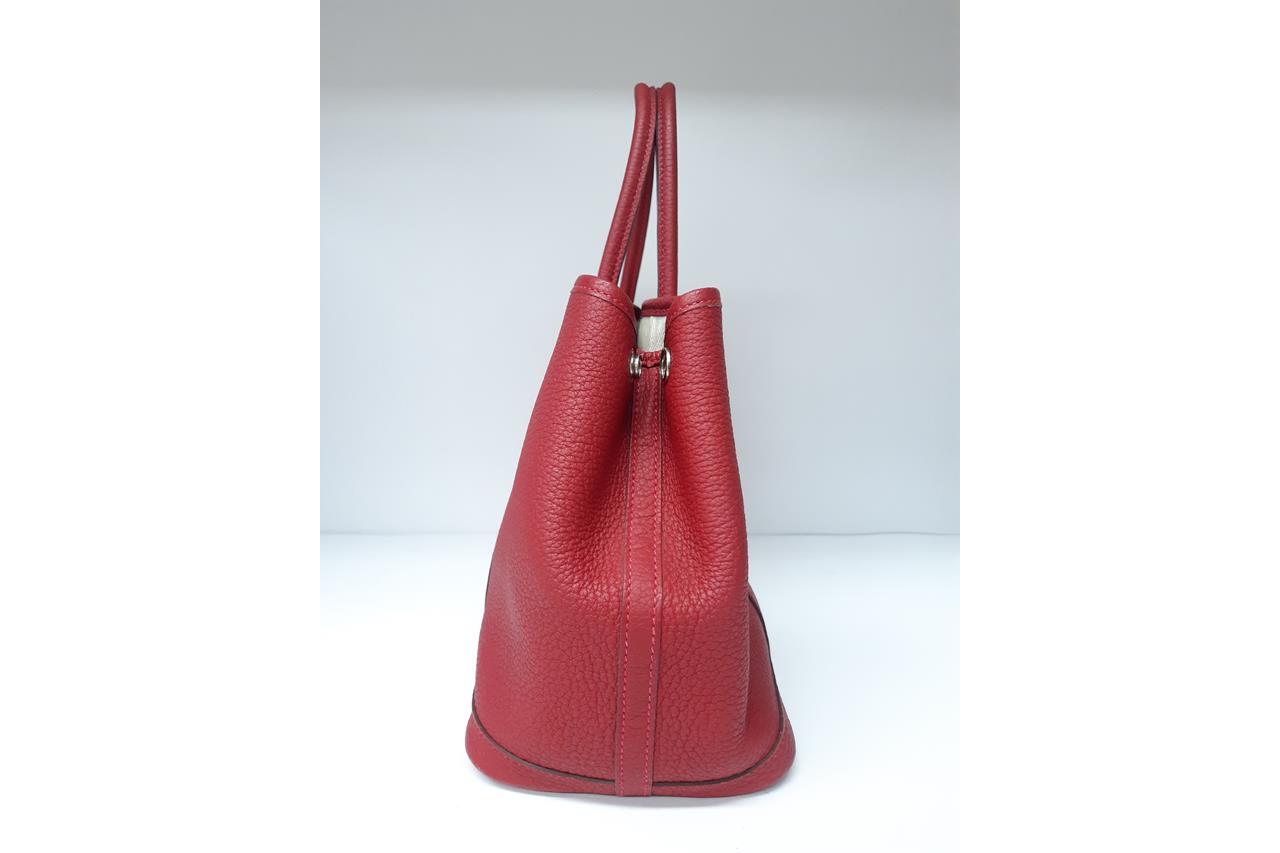 Hermès Garden Party 30 bag in Negonda leather in Rouge Piment colour. Stamp:D. (Circa:2019). Featuring silver-tone hardware, dual rolled leather handles, snap button closure on sides and front. The top opens to beige canvas and Rouge Piment leather interior with a main open compartment and a zipped pocket. Approximate dimensions: 30cm(L) x 20cm(H) x 14cm(D), 11.5cm handle drop. Accompanied by Hermes dust bag. With Entrupy Certificate of Authenticity. (Pre-owned)