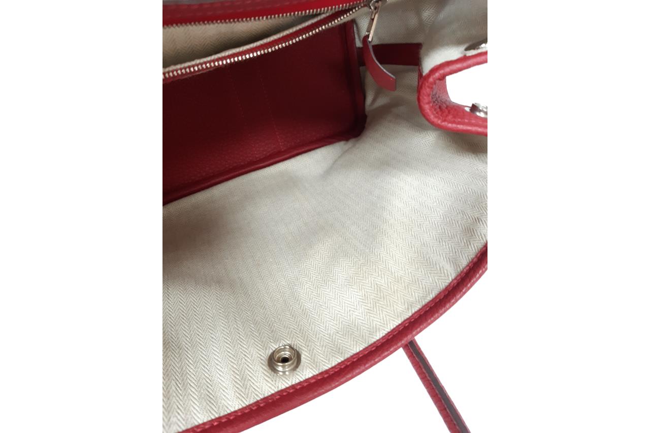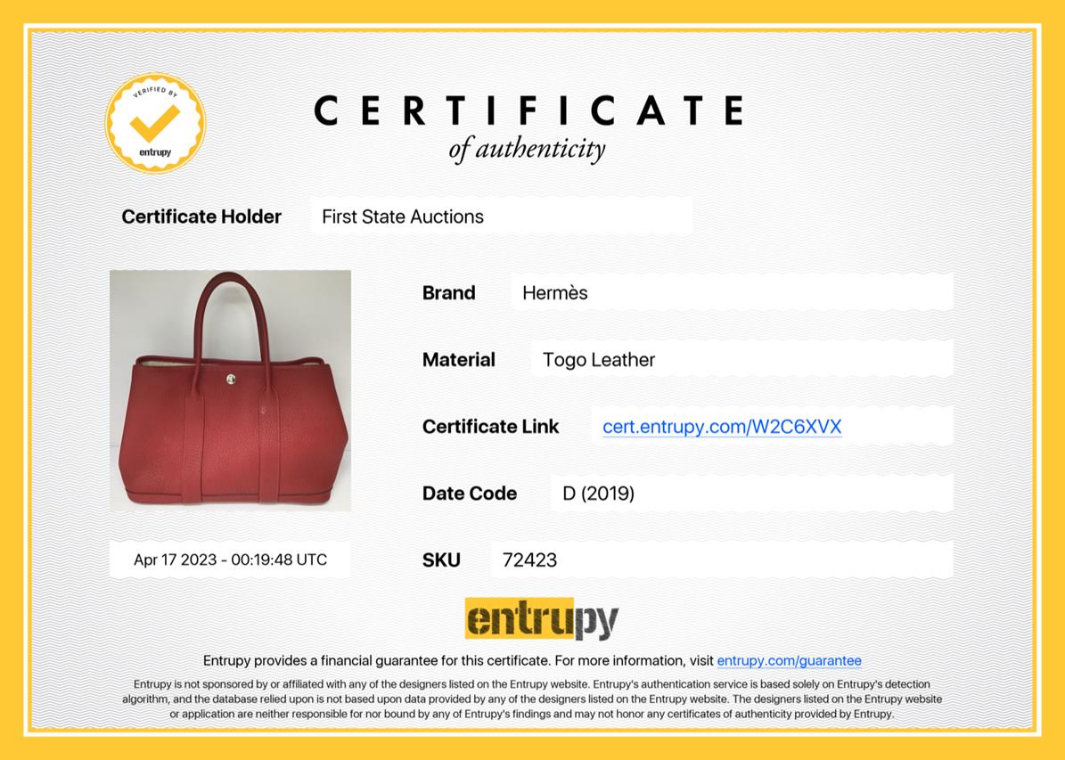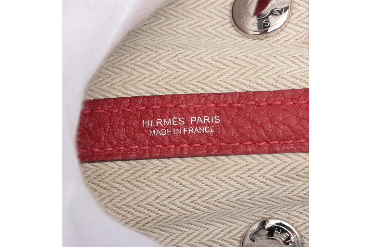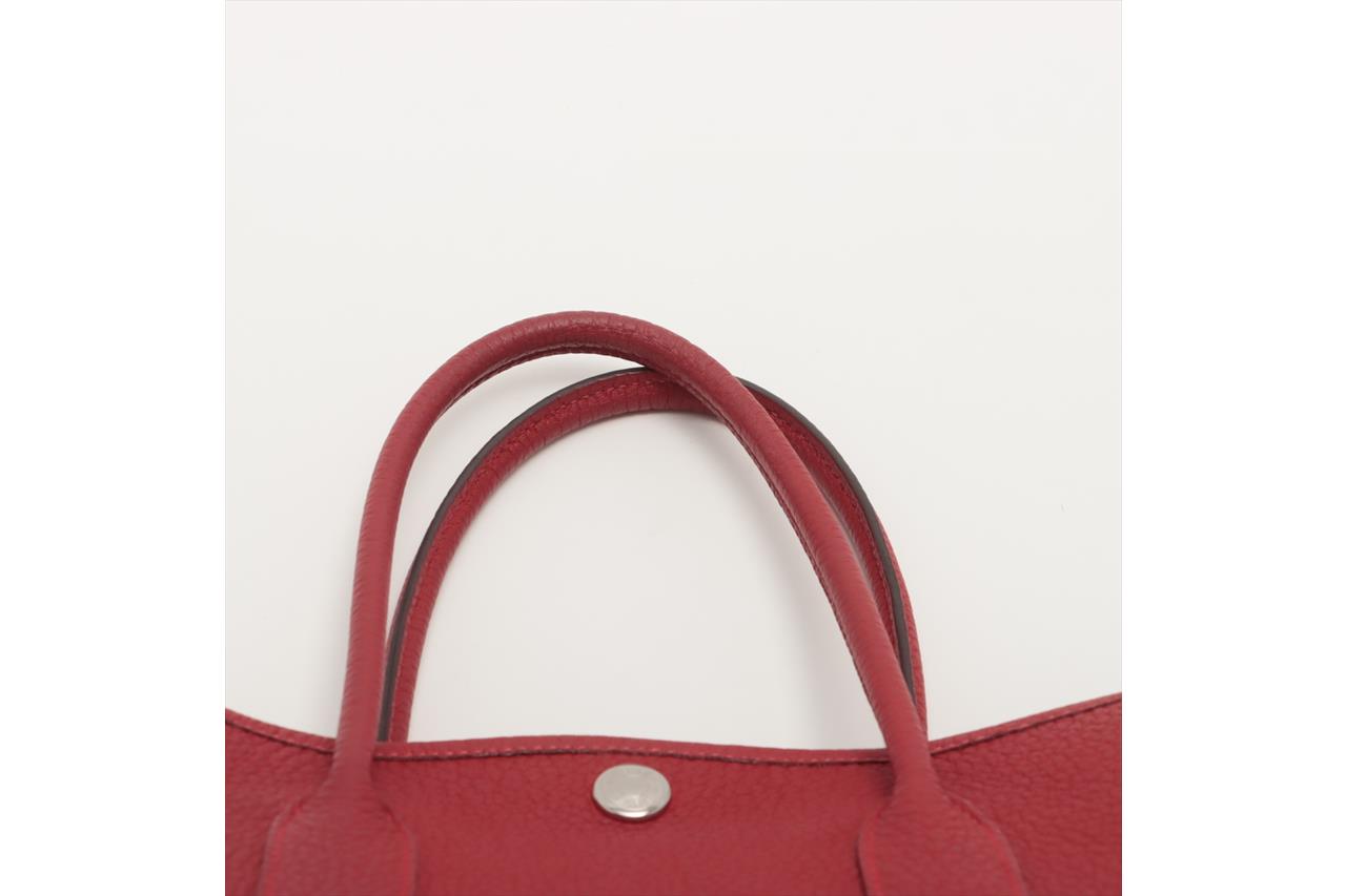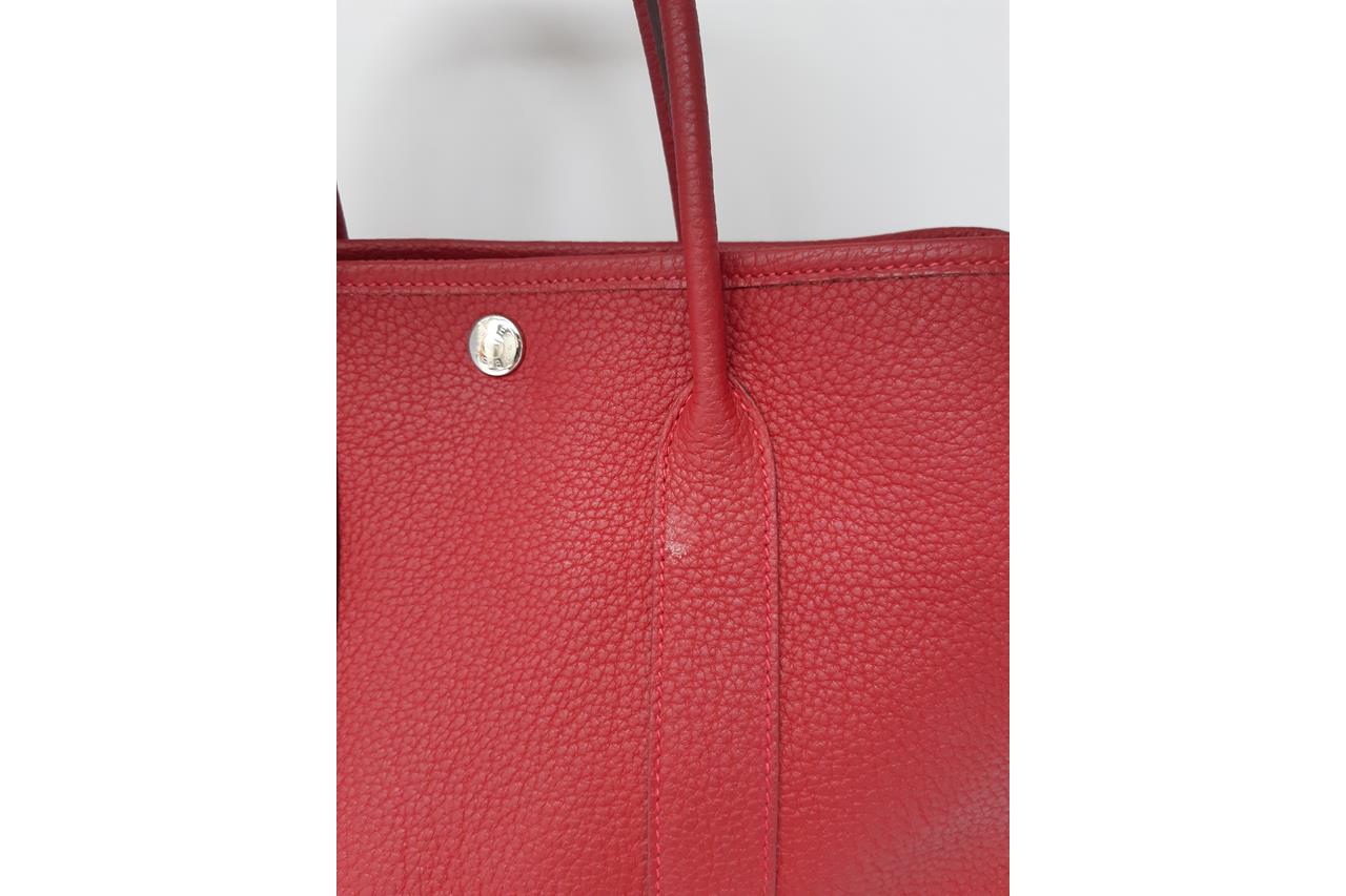 Hermès Garden Party 30 bag in Negonda leather in Rouge Piment colour. Stamp:D. (Circa:2019). Featuring silver-tone hardware, dual rolled leather handles, snap button closure on sides and front. The top opens to beige canvas and Rouge Piment leather interior with a main open compartment and a zipped pocket. Approximate dimensions: 30cm(L) x 20cm(H) x 14cm(D), 11.5cm handle drop. Accompanied by Hermes dust bag. With Entrupy Certificate of Authenticity. (Pre-owned)