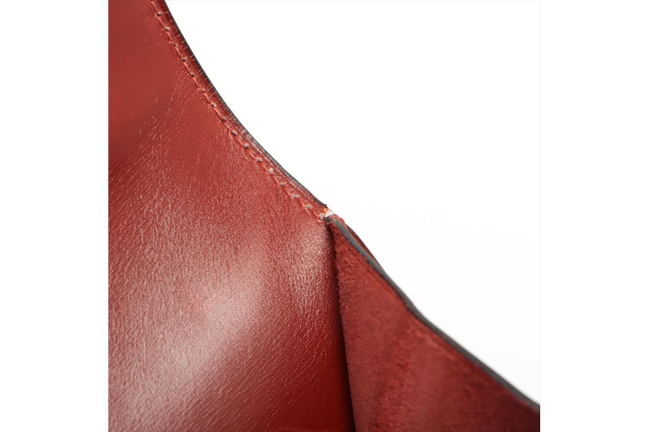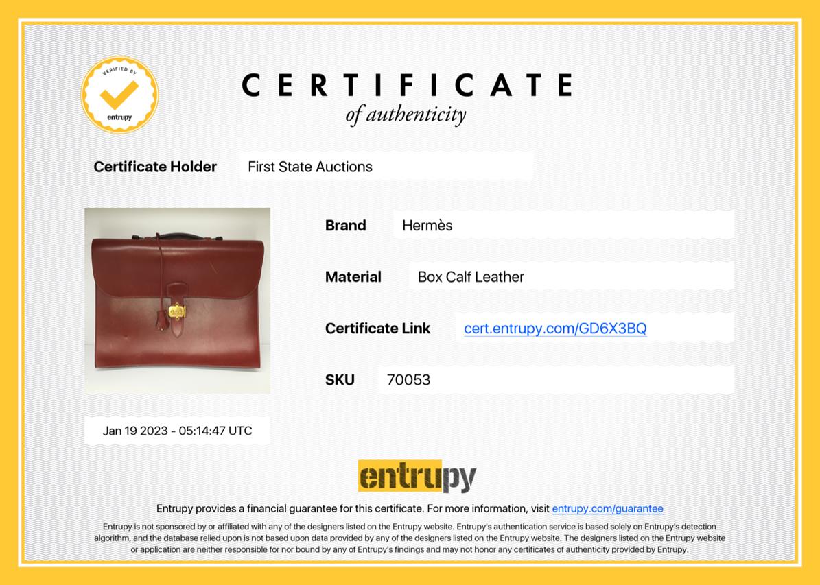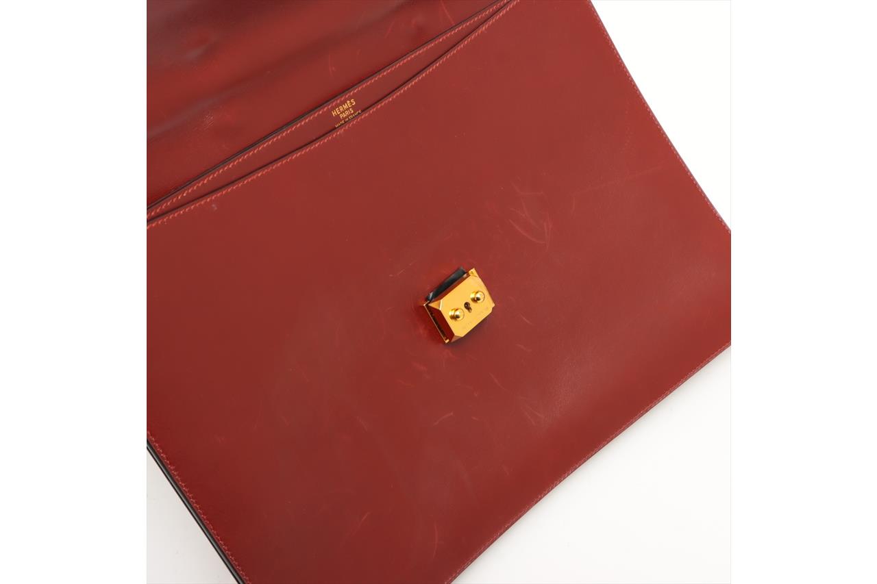 Hermès Sac à Depeche 38 briefcase in Rouge calf box leather. Featuring gold-toned hardware, single top handle, flap closure at front with lock clasp. Red suede interior with 3 compartments. Approximate dimensions: 38cm(L) x 30cm(H) x 11cm(D), 2.5cm handle height. Accompanied by Hermes clochette, keys and dust bag. (Note: Date code stamp is blurred and not readable). With Entrupy Certificate of Authenticity. (Pre-owned)