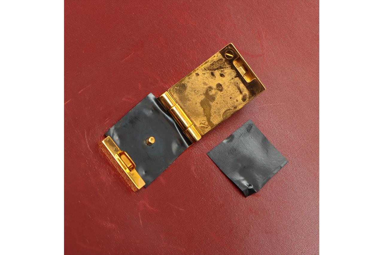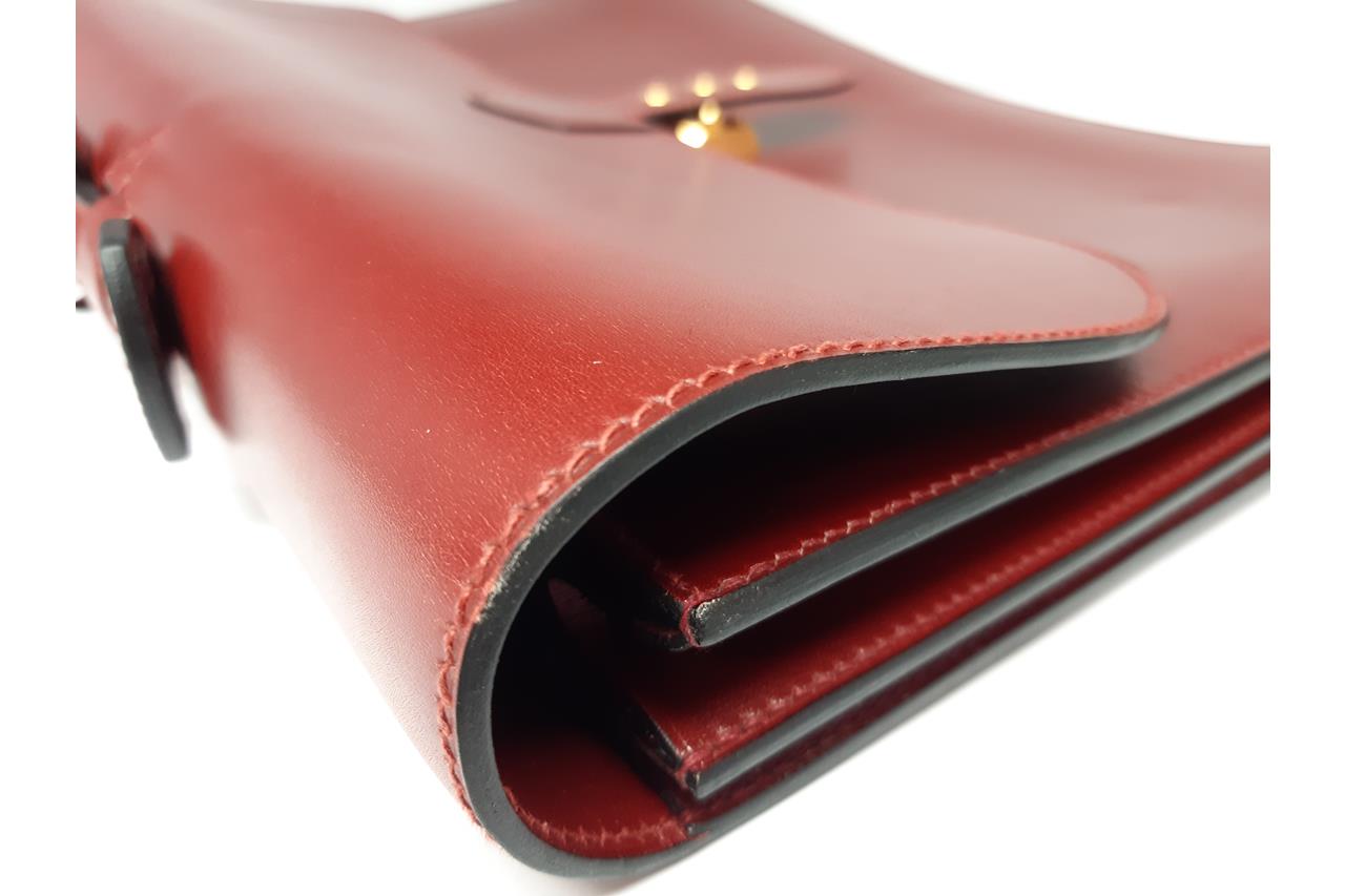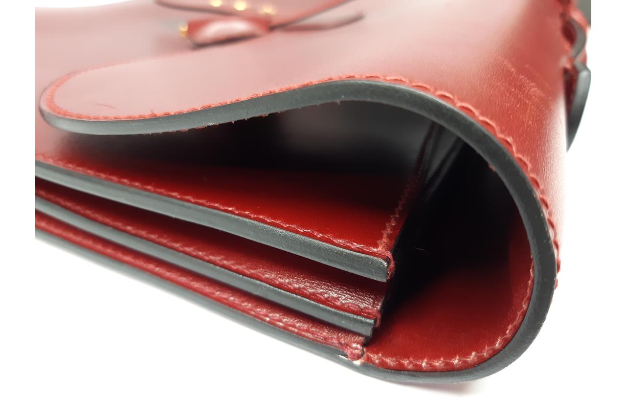 Hermès Sac à Depeche 38 briefcase in Rouge calf box leather. Featuring gold-toned hardware, single top handle, flap closure at front with lock clasp. Red suede interior with 3 compartments. Approximate dimensions: 38cm(L) x 30cm(H) x 11cm(D), 2.5cm handle height. Accompanied by Hermes clochette, keys and dust bag. (Note: Date code stamp is blurred and not readable). With Entrupy Certificate of Authenticity. (Pre-owned)