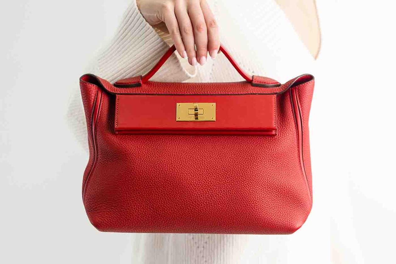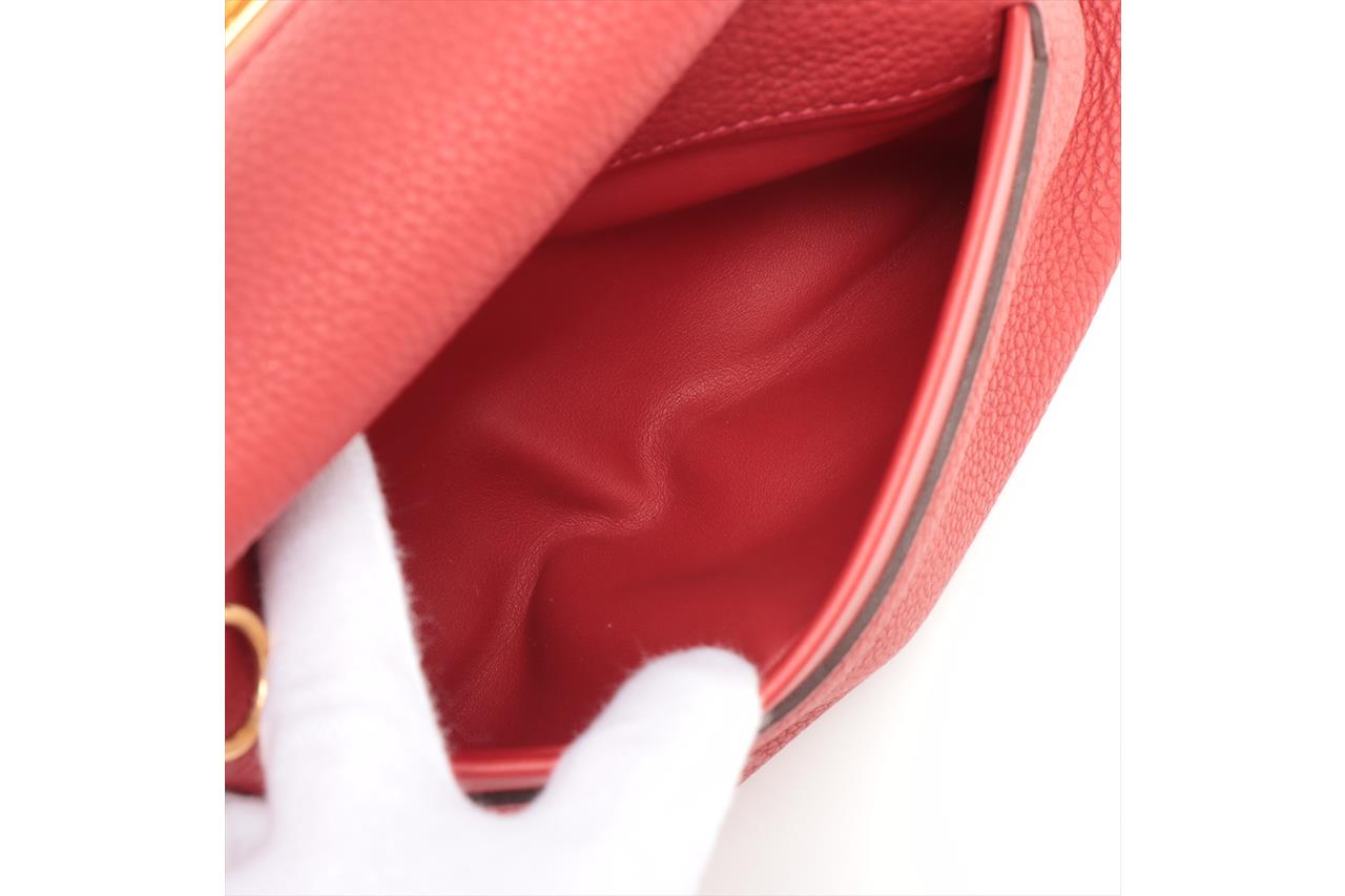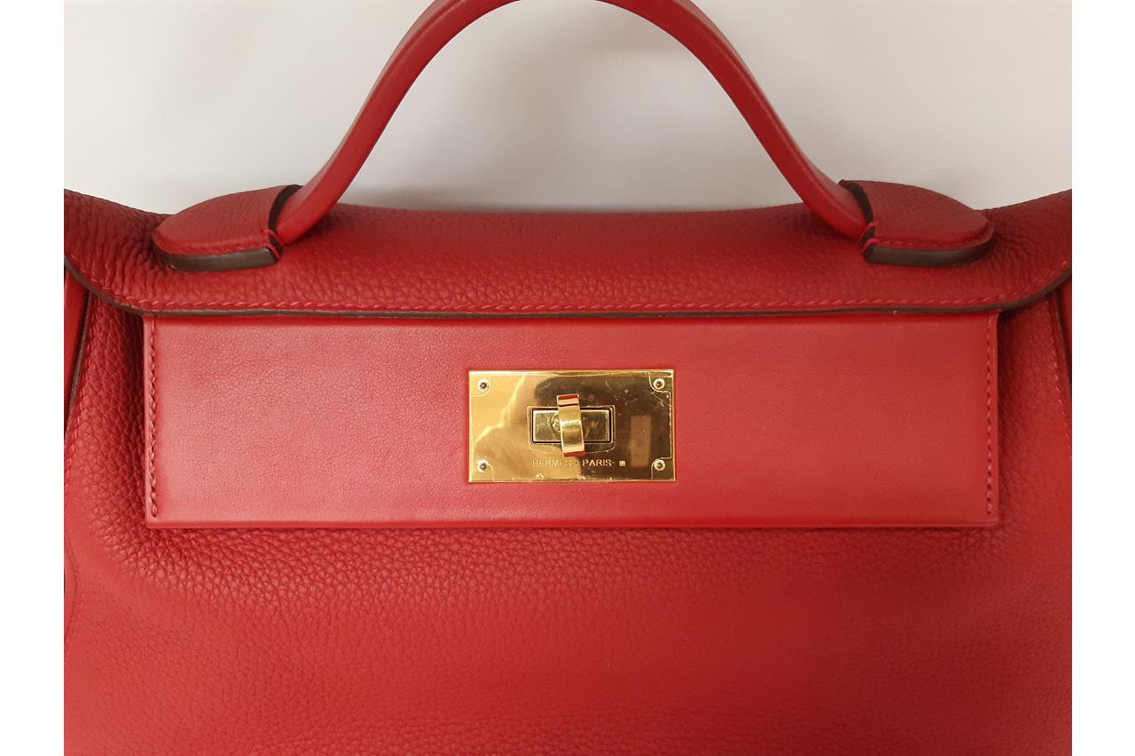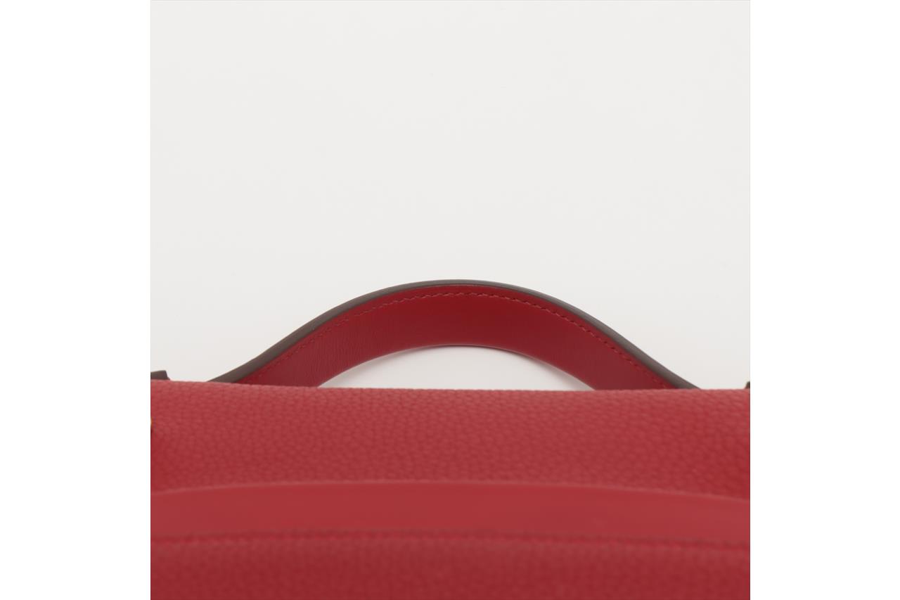 Hermes 24/24 29 2way bag in red Taurillon Clemence leather. (Stamp: Y, circa:2020). Featuring gold-toned hardware, a top leather handle, an exterior pocket at back, frontal flap with turned lock closure. The flap opens to a matching smooth leather interior with a zipper pocket. Approximate dimensions: 28.5cm(L) x 20cm(H) x 13.5cm(D), 6cm handle drop and 34.5cm removable strap drop. Accompanied by Hermes dust bag. With Entrupy Certificate of Authenticity. (Pre-owned)