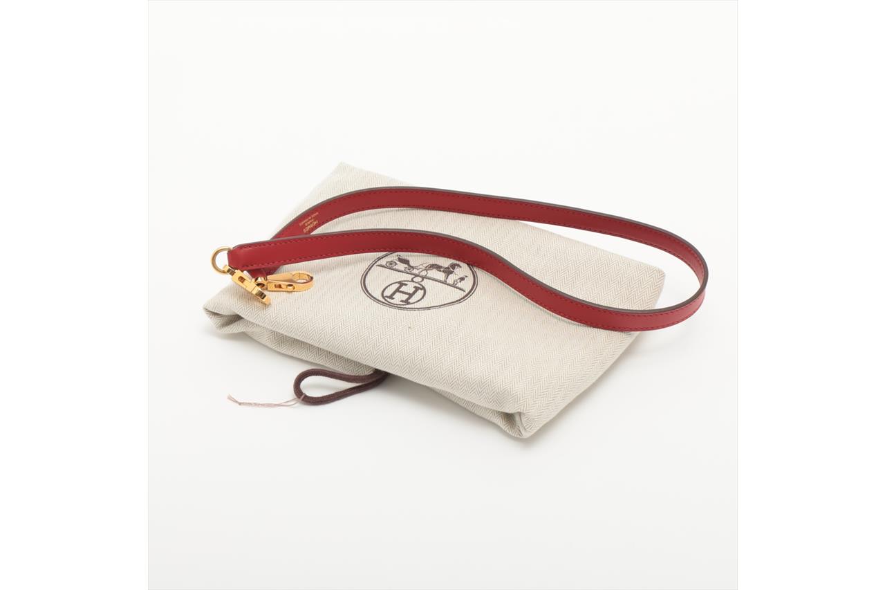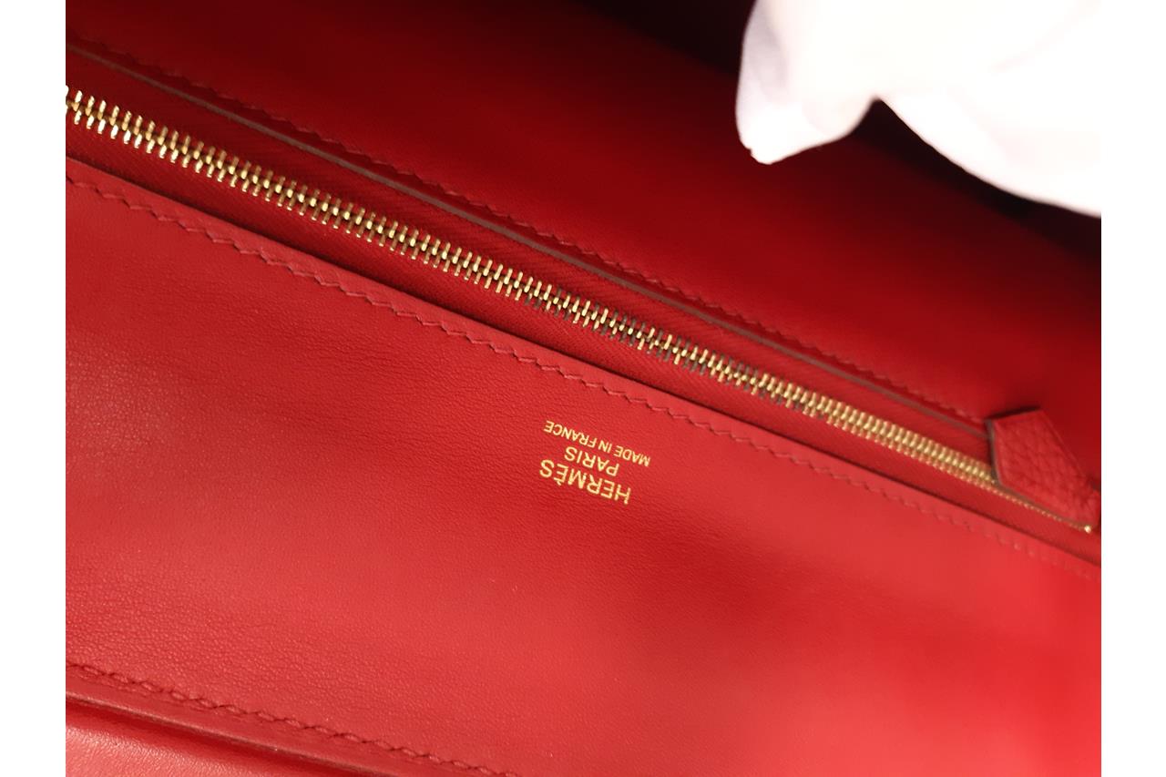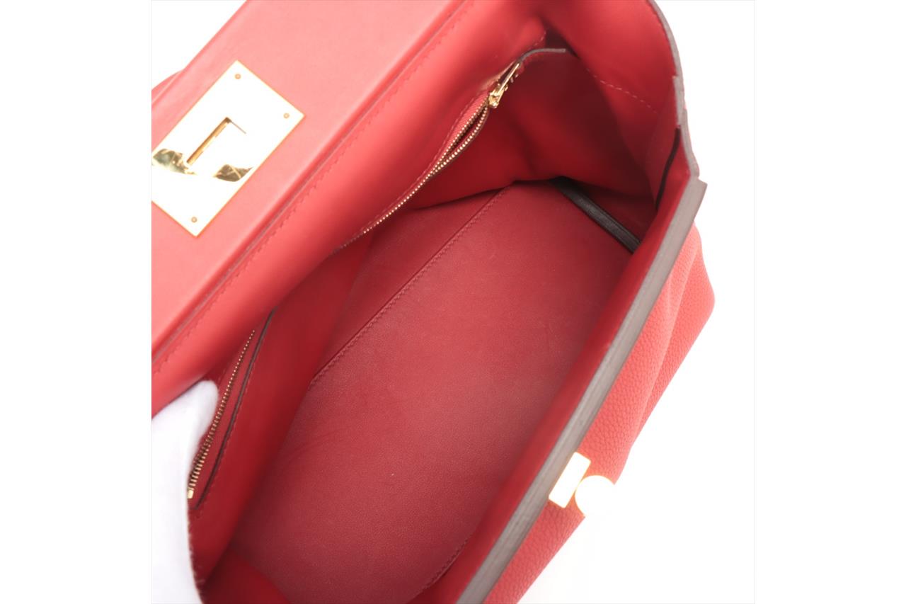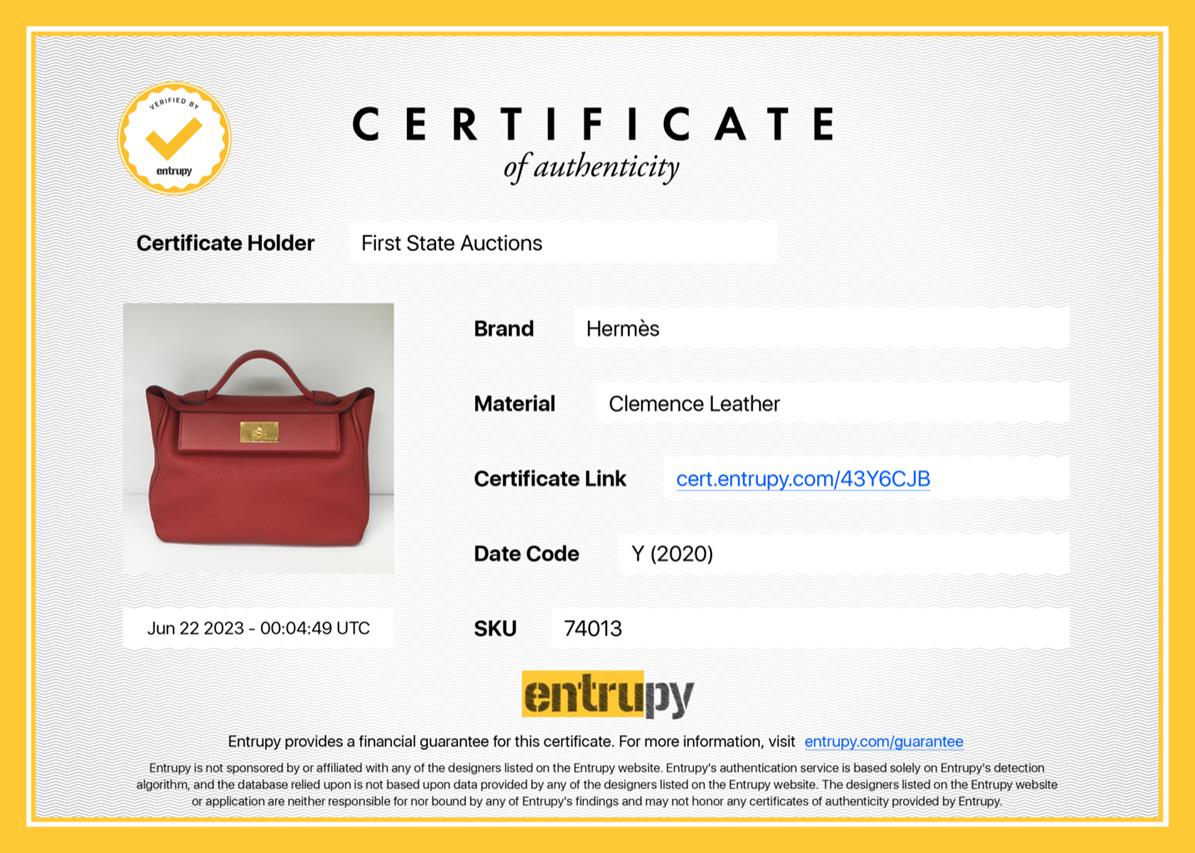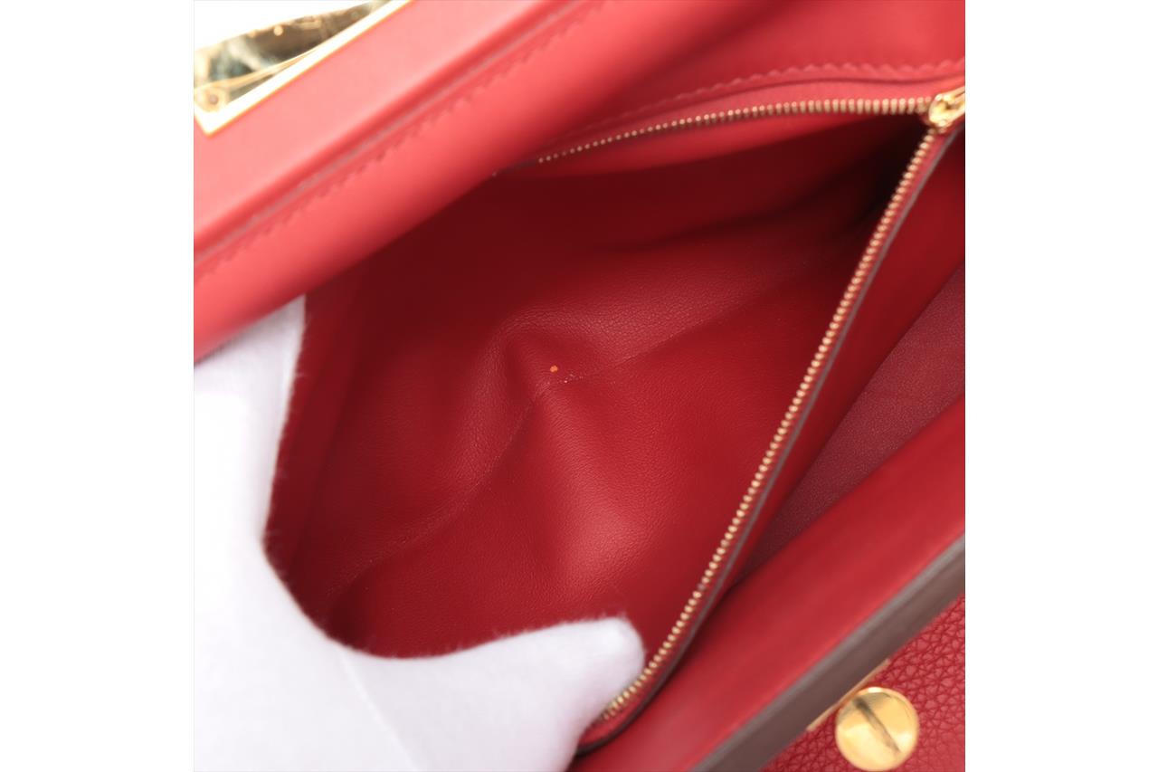 Hermes 24/24 29 2way bag in red Taurillon Clemence leather. (Stamp: Y, circa:2020). Featuring gold-toned hardware, a top leather handle, an exterior pocket at back, frontal flap with turned lock closure. The flap opens to a matching smooth leather interior with a zipper pocket. Approximate dimensions: 28.5cm(L) x 20cm(H) x 13.5cm(D), 6cm handle drop and 34.5cm removable strap drop. Accompanied by Hermes dust bag. With Entrupy Certificate of Authenticity. (Pre-owned)
