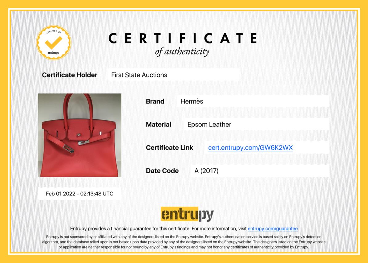 Hermes Birkin 30 in Rouge Tomate Veau Epsom Leather. Circa 2017. Palladium gold-tone hardware. Approximate dimensions: 30cm (L) x 22cm (H) x 16cm (D) and 10cm handle height. Accompanied by Hermes clochette, padlock, key and small dust bag. With Entrupy Certificate of Authenticity. (Pre-owned)