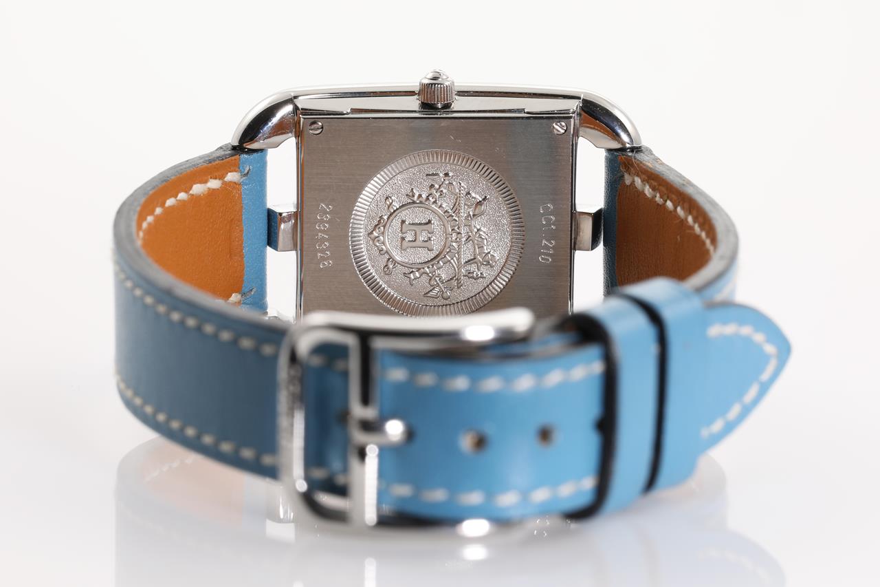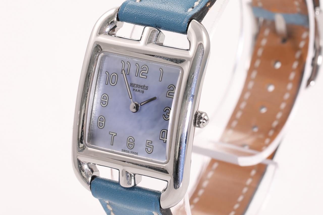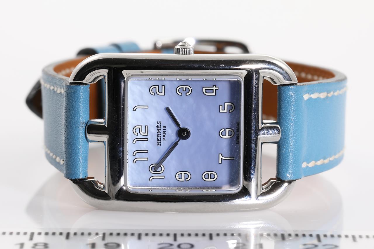 Hermes Cape Cod stainless steel quartz ladies watch. Mother of Pearl dial, case diameter: 23mm, length: 17.5cm, Swiss made. Ref# CC1.210. With Hermes blue leather strap and clasp. With Certificate of Authenticity. 3 month FSA warranty. (Pre-owned)