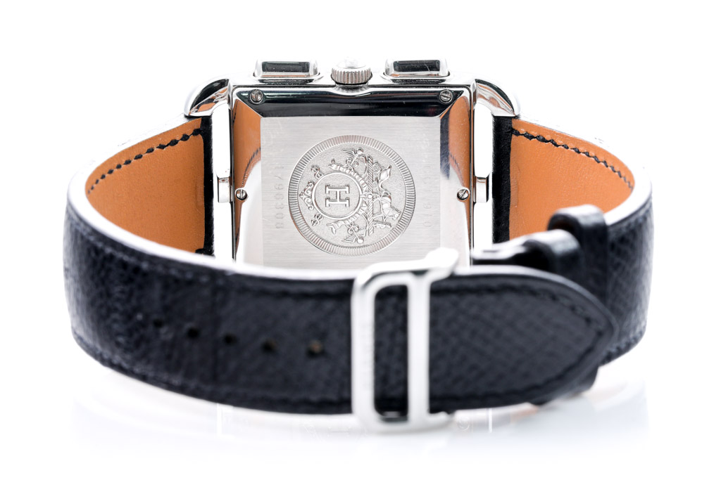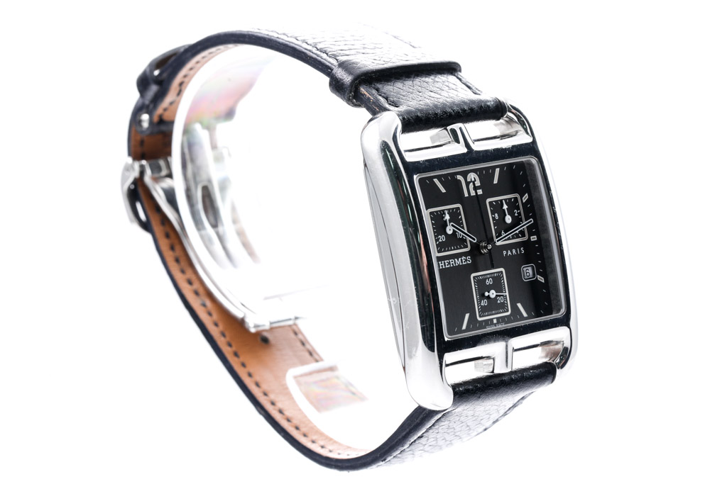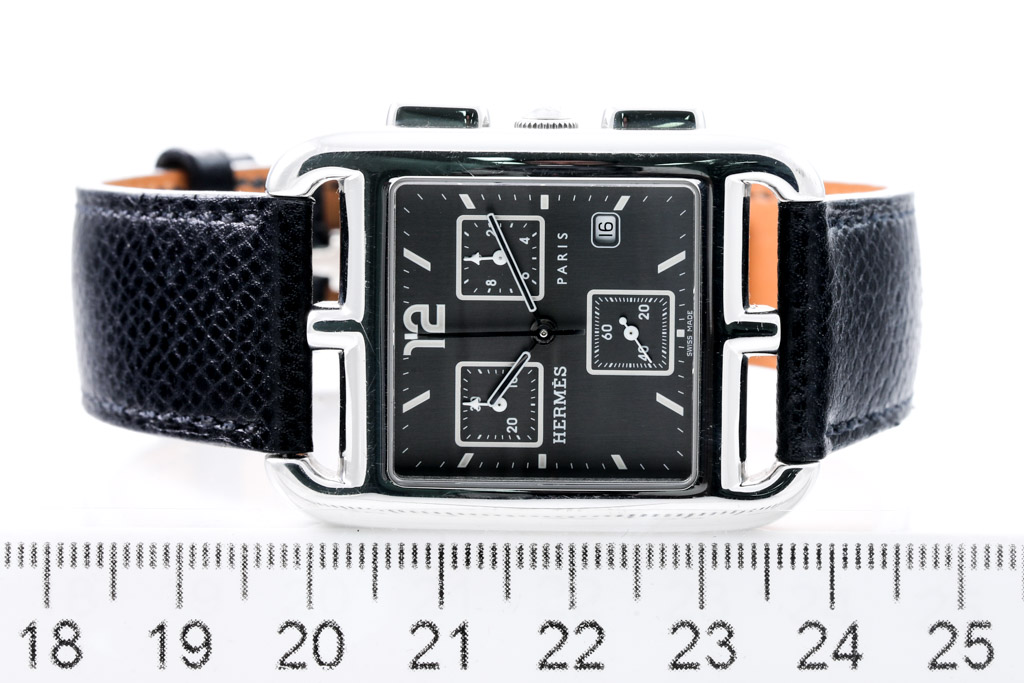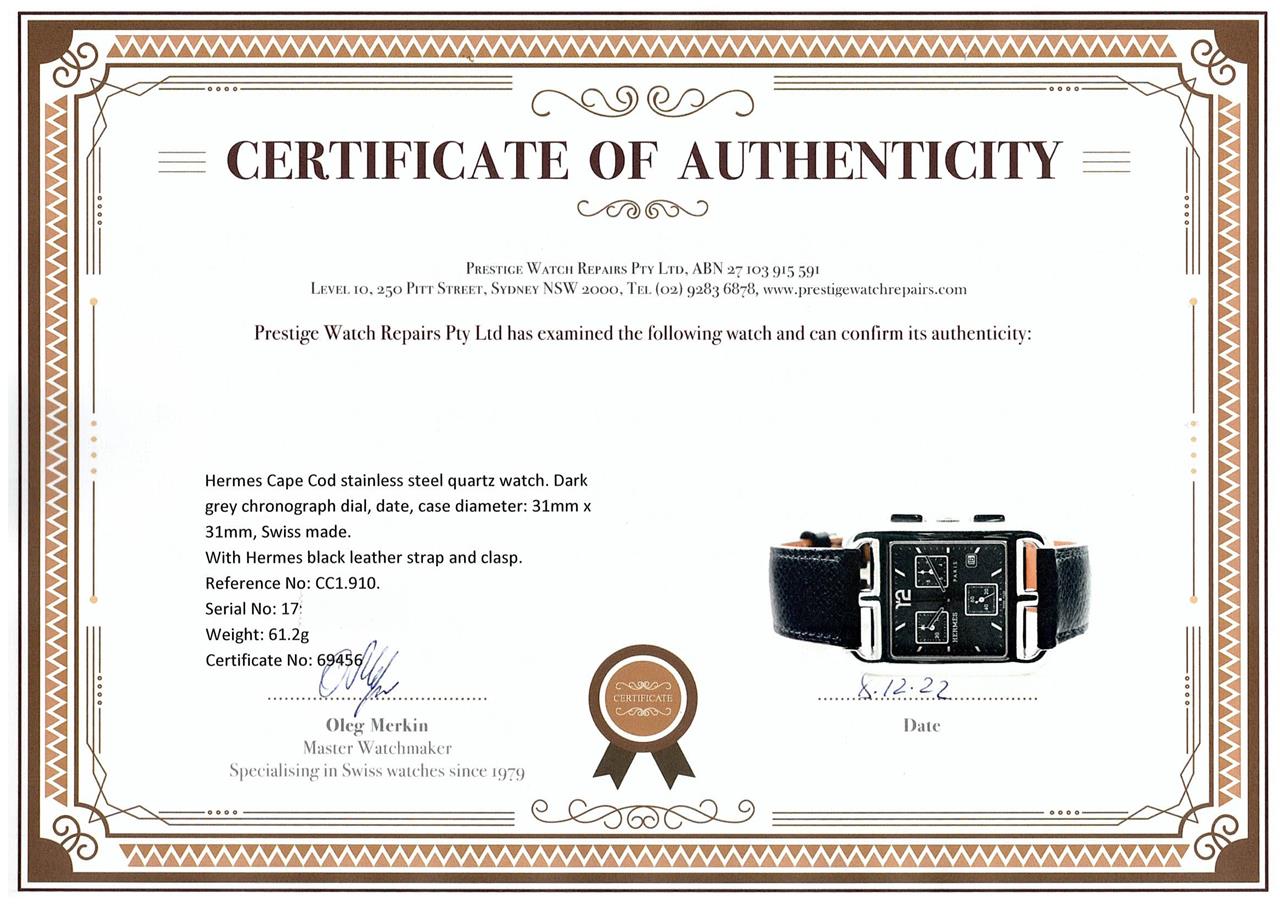 Hermes Cape Cod stainless steel quartz watch. Dark grey chronograph dial, date, case diameter: 31mm x 31mm, adjustable max wrist size: 18.5cm, Swiss made. Ref# CC1.910. With Hermes black leather strap and clasp. With Certificate of Authenticity and Hermes box. 3 month FSA warranty. (Pre-owned)