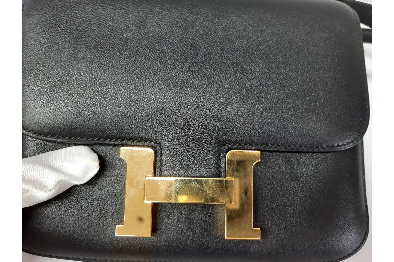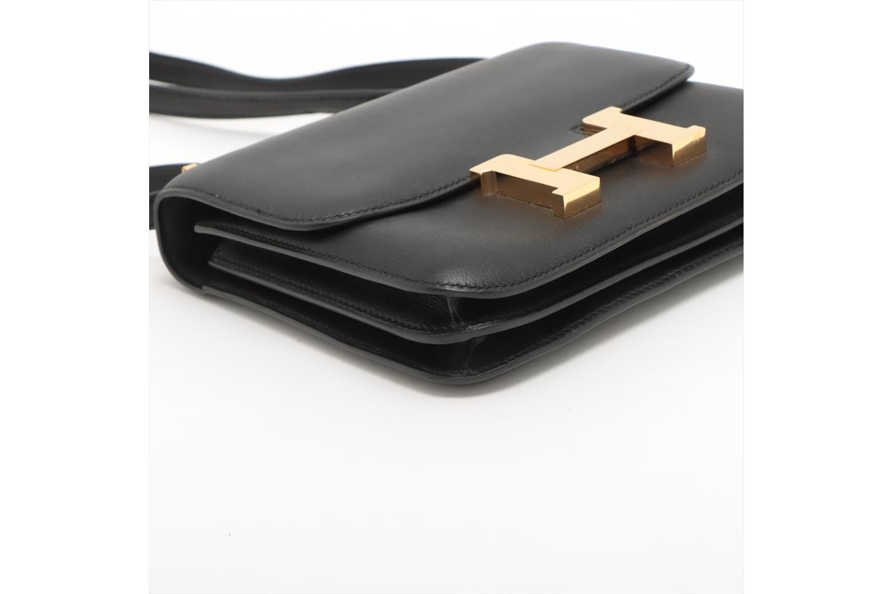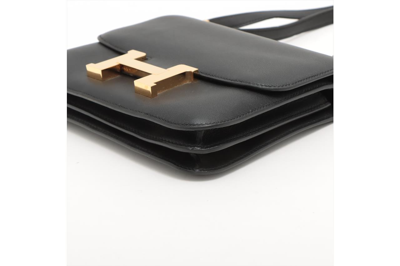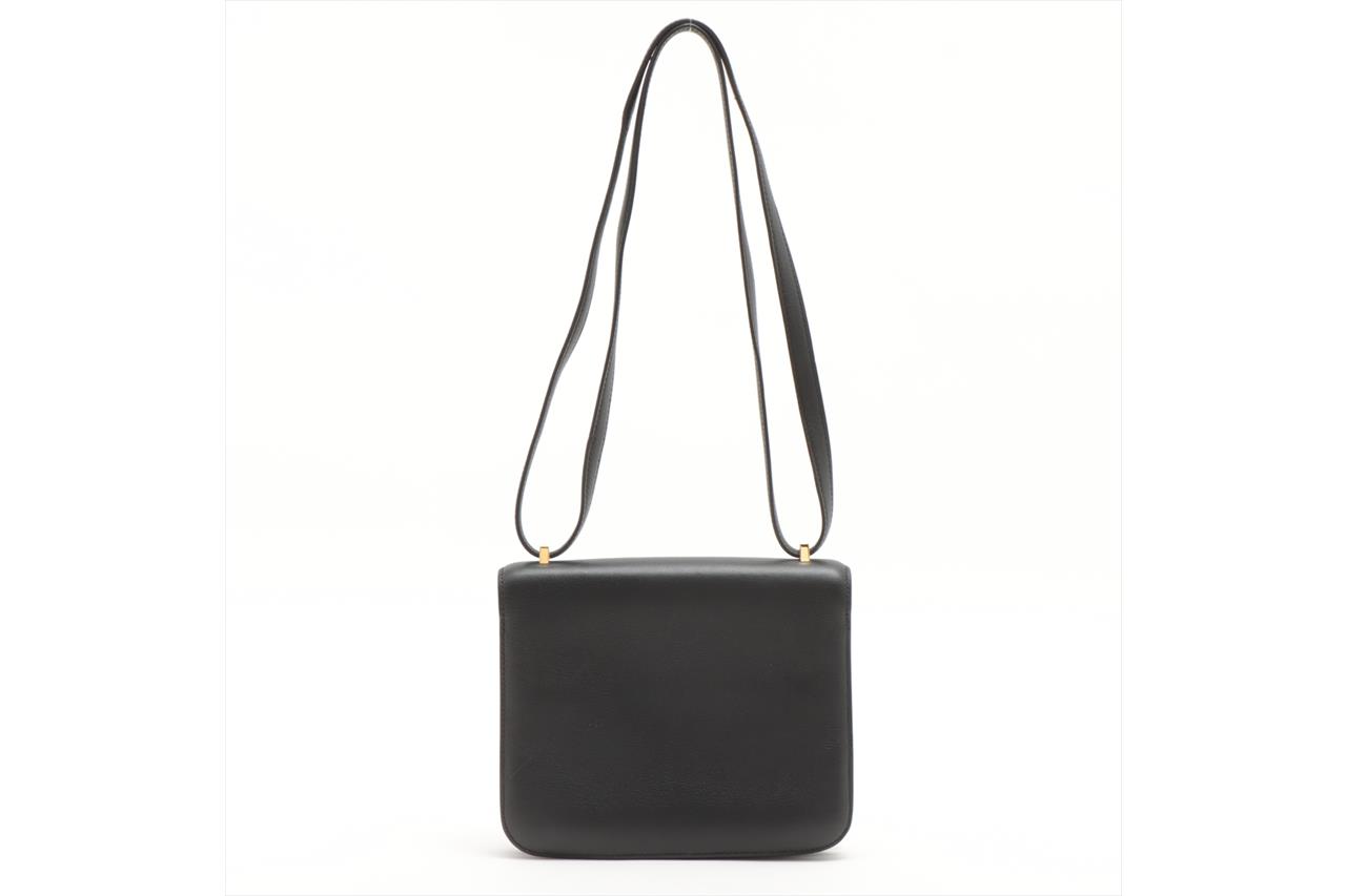 Hermes Constance 18 Mini handbag in black Swift leather (Square O, Year 2011). Gold-tone hardware, flap with H-Buckle closure on front. The flap opens to a black leather interior with two compartments and 2 slip pockets. Approximate dimensions: 18cm(W) x 15cm(H) x 6cm(D), 50cm single strap height. Accompanied by Hermes dust bag. With Entrupy certificate of authenticity. (Pre-owned)