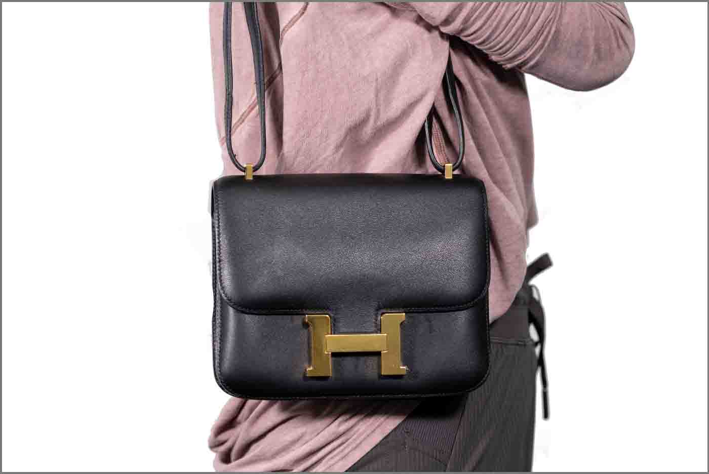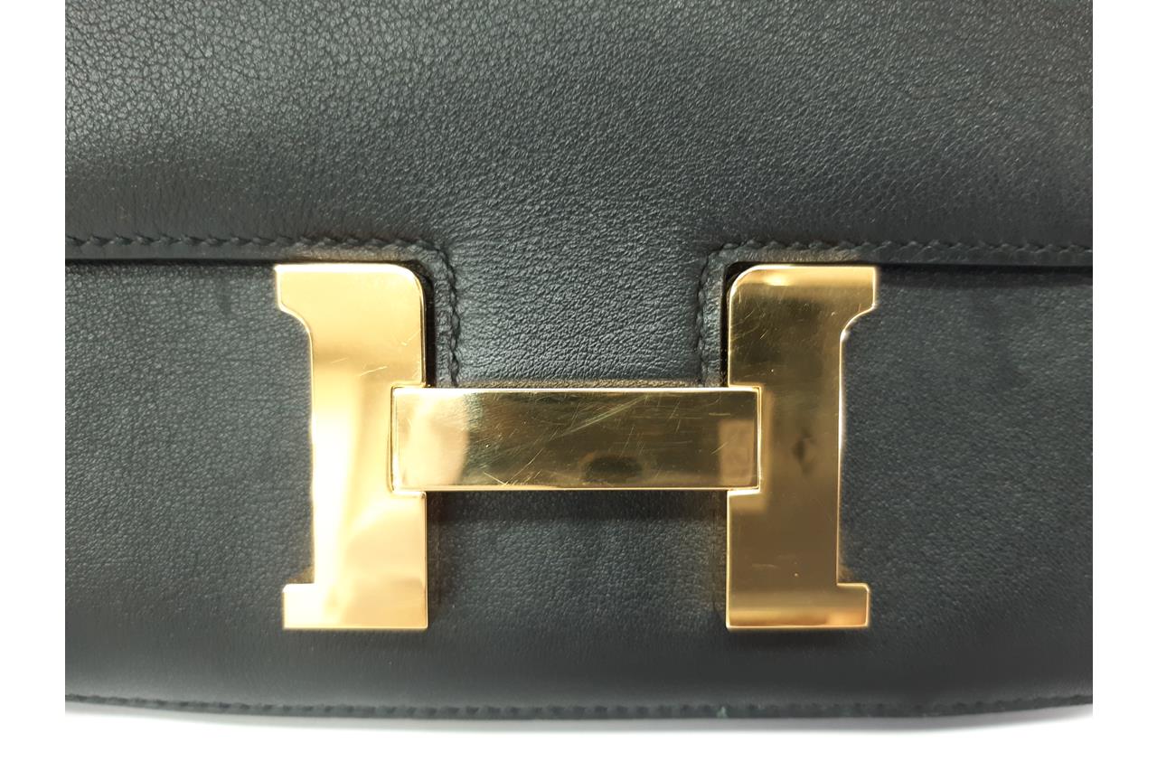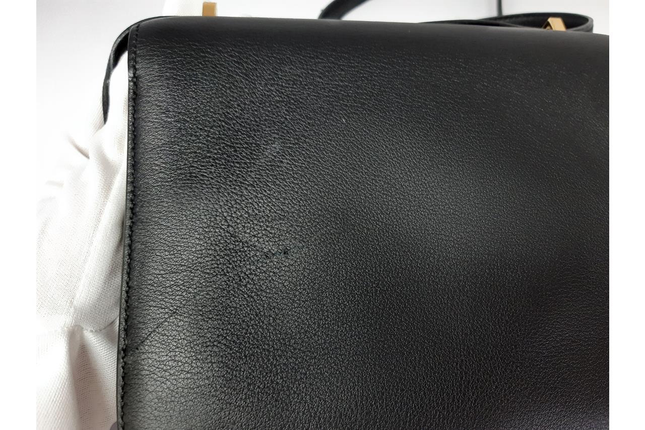 Hermes Constance 18 Mini handbag in black Swift leather (Square O, Year 2011). Gold-tone hardware, flap with H-Buckle closure on front. The flap opens to a black leather interior with two compartments and 2 slip pockets. Approximate dimensions: 18cm(W) x 15cm(H) x 6cm(D), 50cm single strap height. Accompanied by Hermes dust bag. With Entrupy certificate of authenticity. (Pre-owned)