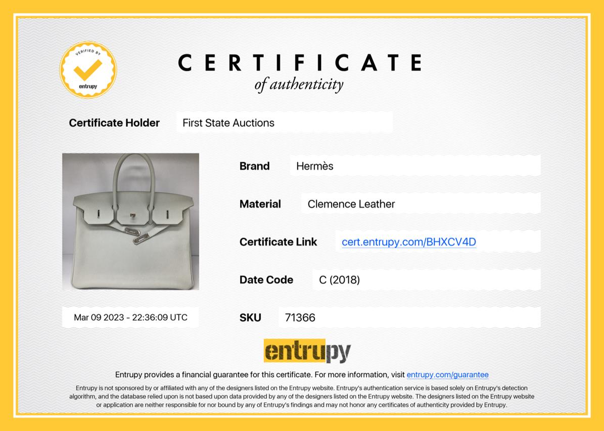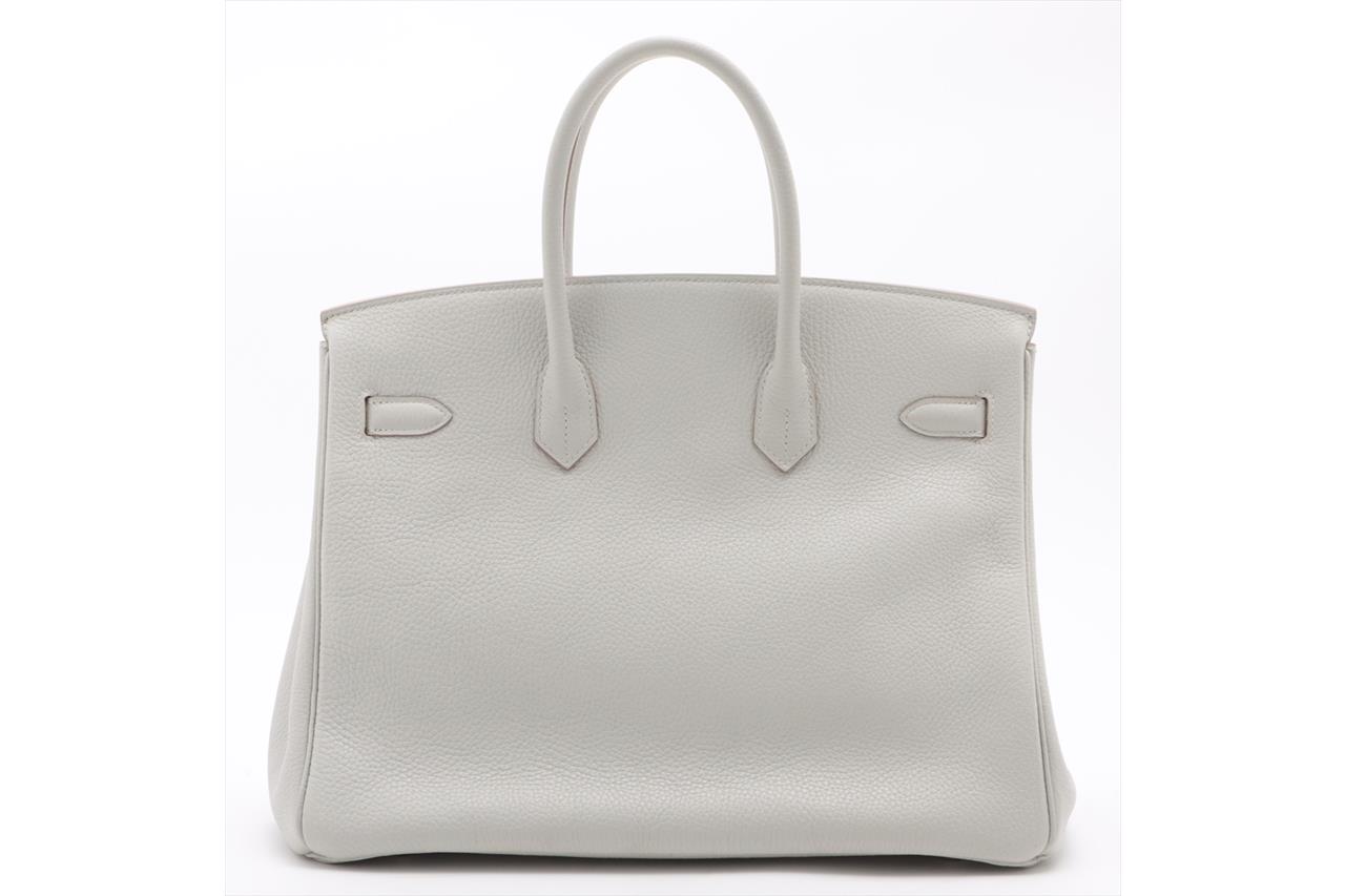 Hermes Gris Pearl Birkin 35 in Taurillon Clemence (C, 2018). Silver-toned hardware. Featuring rolled leather top handles, frontal flap with strap closure and a turn lock. The top flap opens to a matte leather interior with zipper and patch pockets. Approximate dimensions: 35cm(L) x 25cm(H) x 19cm(D) and 12.5cm handle drop height. Accompanied by Hermes dust bags, rain cover, clochette, keys and padlock. With Entrupy Certificate of Authenticity. (Pre-owned)