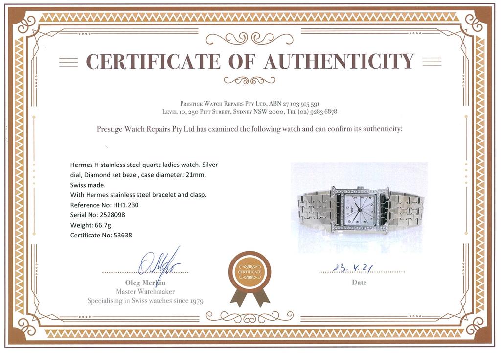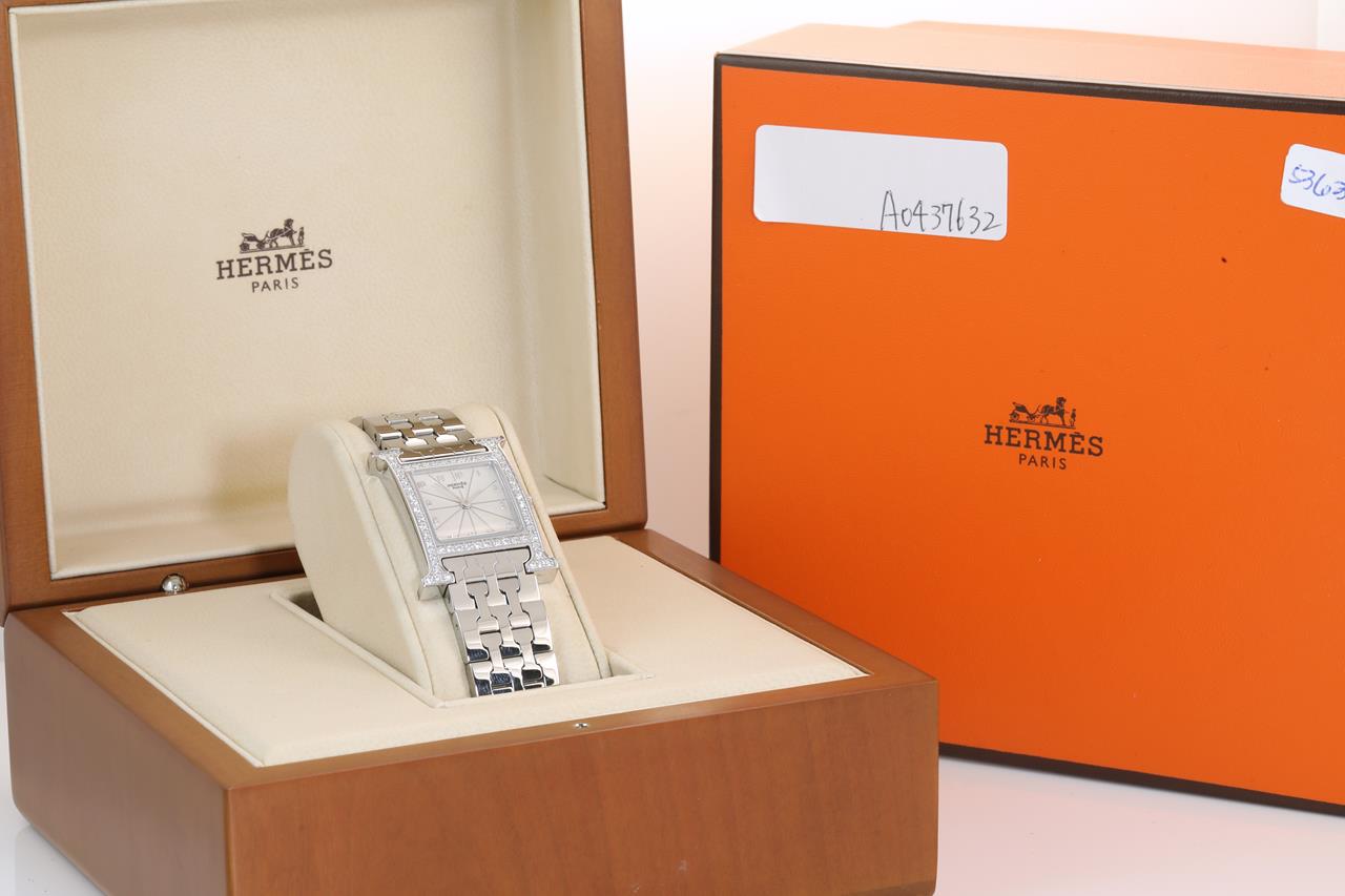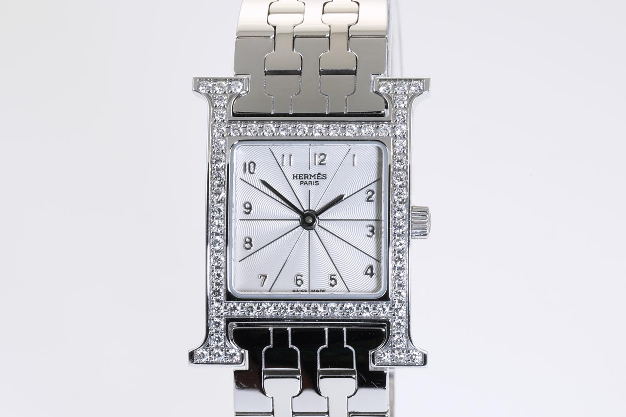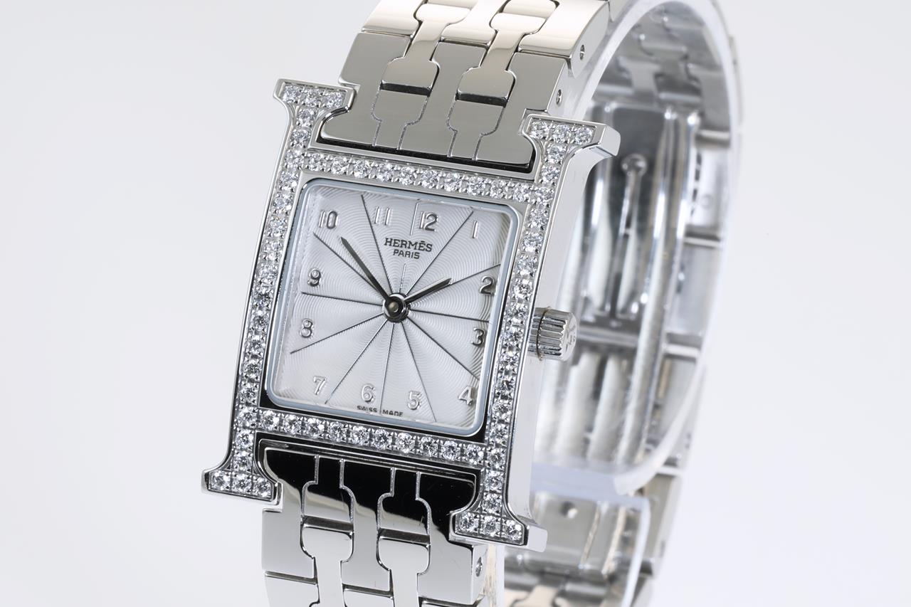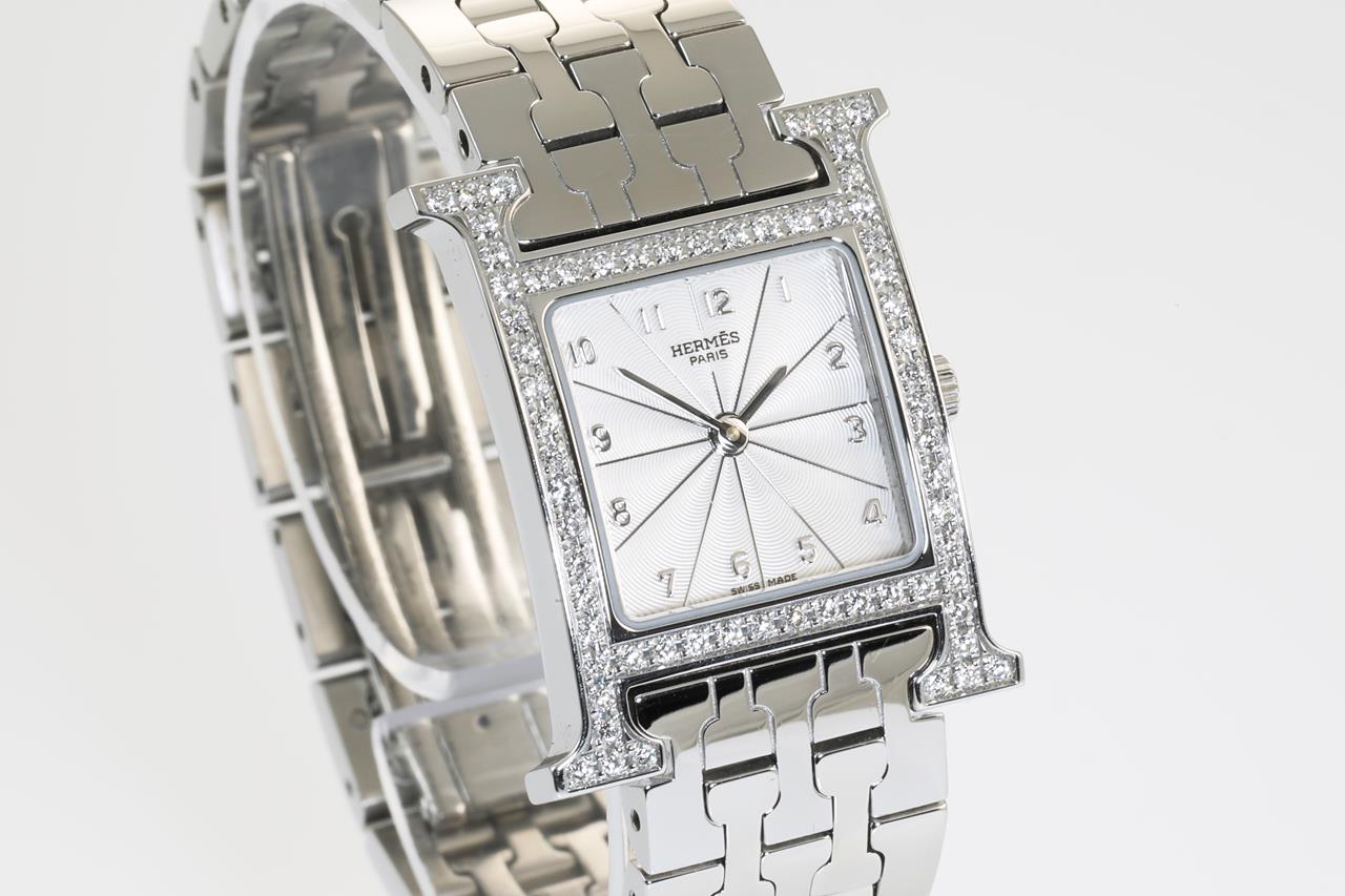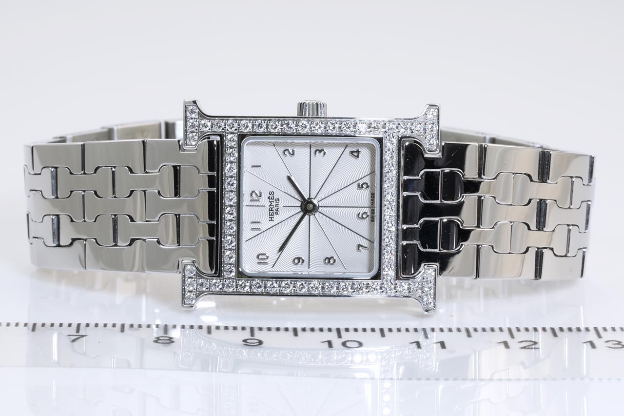 Hermes H stainless steel quartz ladies watch. Silver dial, Diamond set bezel, case diameter: 21mm, wrist size: 16cm, Swiss made. Ref# HH1.230. With Hermes stainless steel bracelet and clasp. With Certificate of Authenticity and Hermes box. 3 month FSA warranty. (Pre-owned)