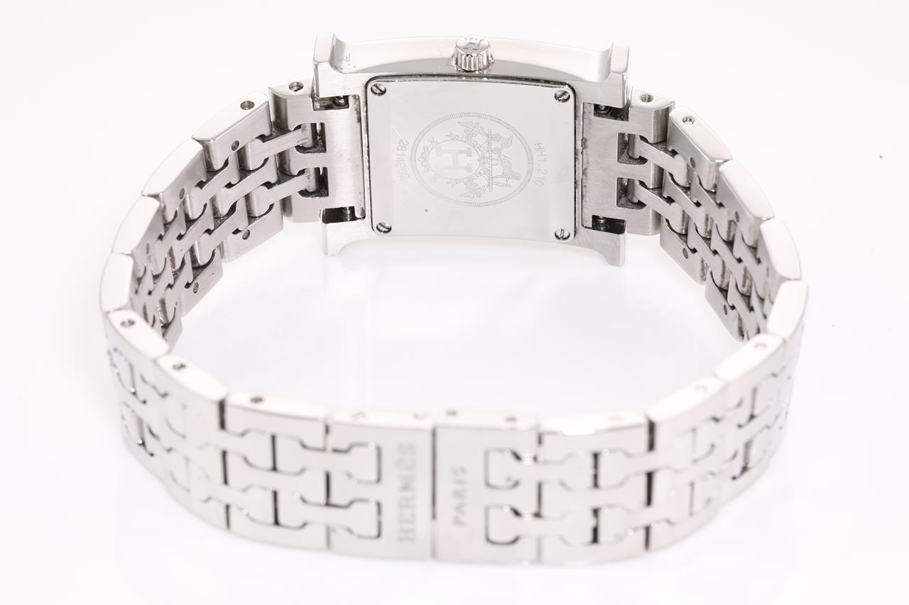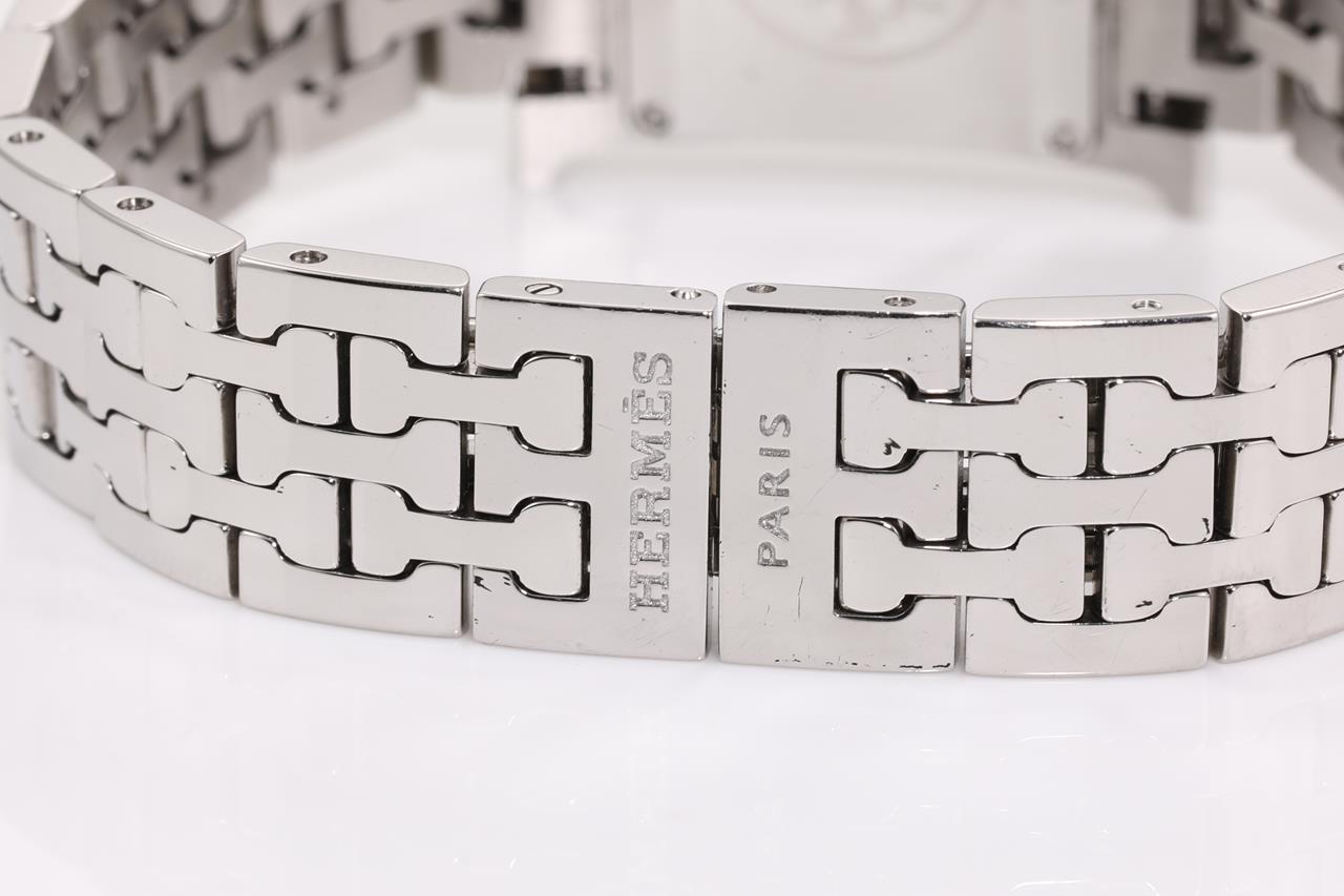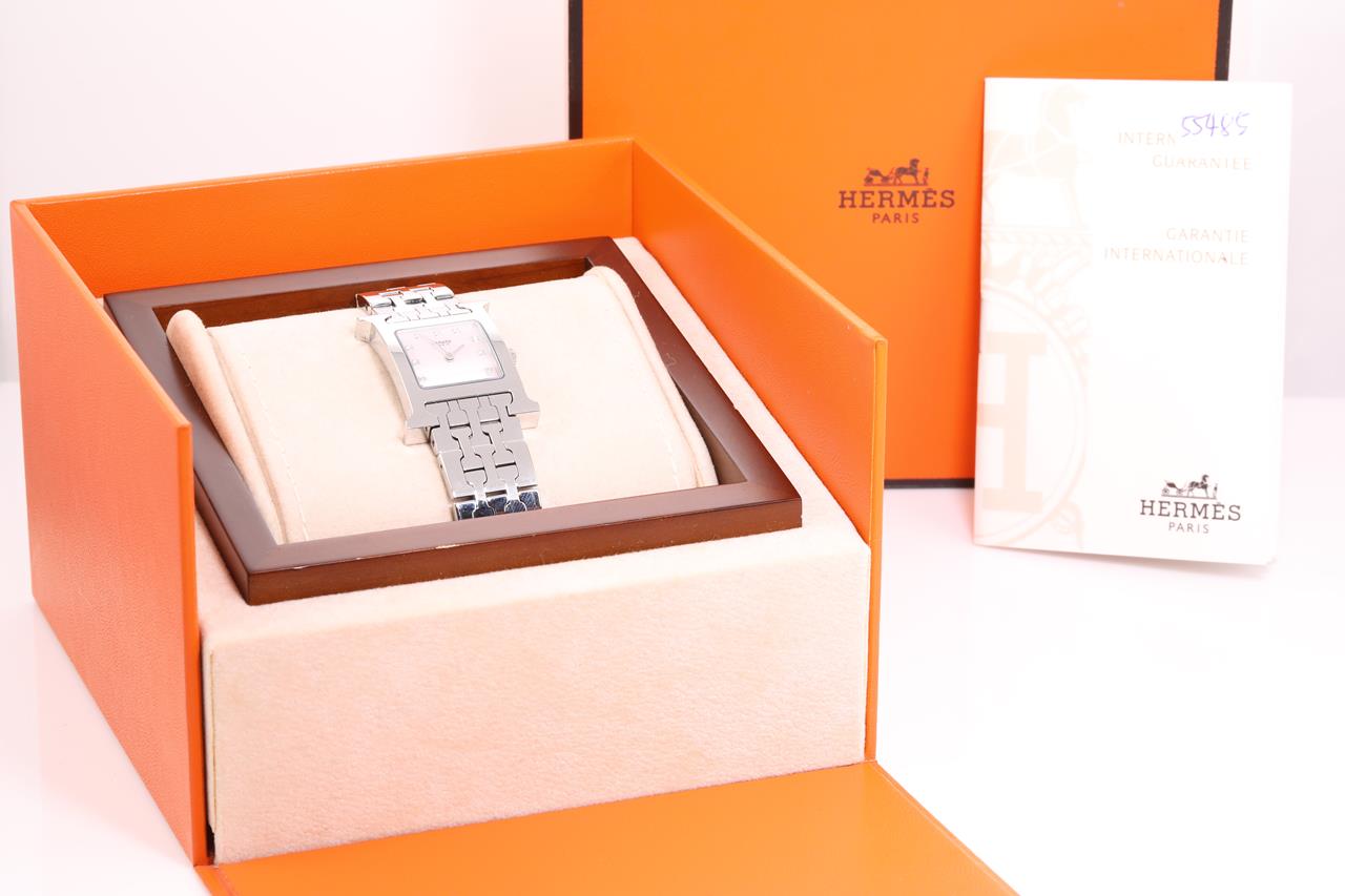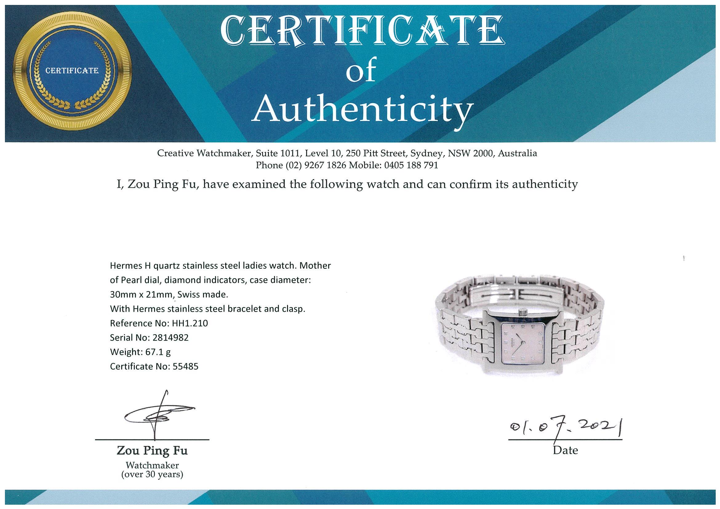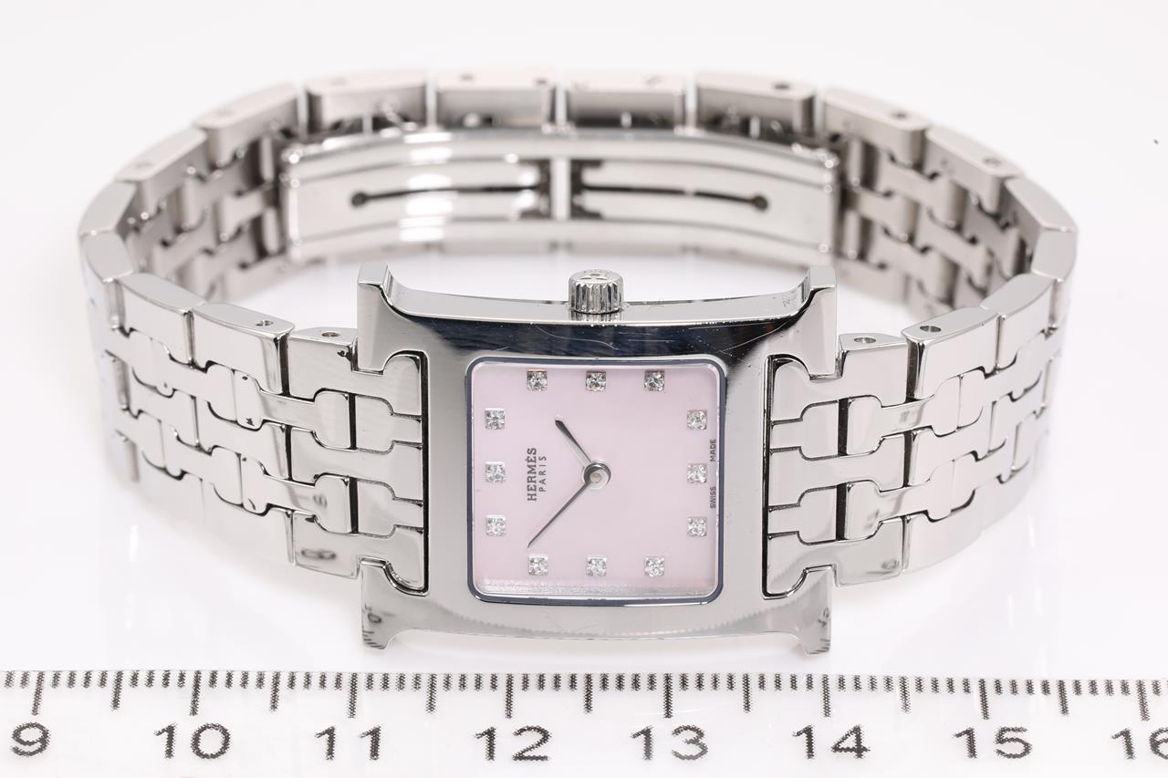 Hermes H quartz stainless steel ladies watch. Mother of Pearl dial, Diamond indicators, case diameter: 30mm x 21mm, wrist size: TBAcm, Swiss made. Ref# HH1.210. With Hermes stainless steel bracelet and clasp. With certificate of authenticity, Hermes international guarantee booklet and Hermes box. 3 month FSA warranty. (Pre-owned)