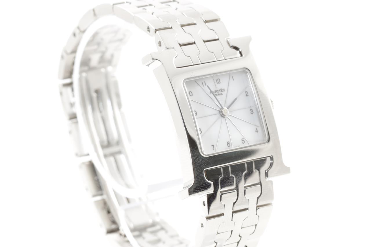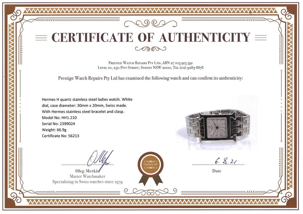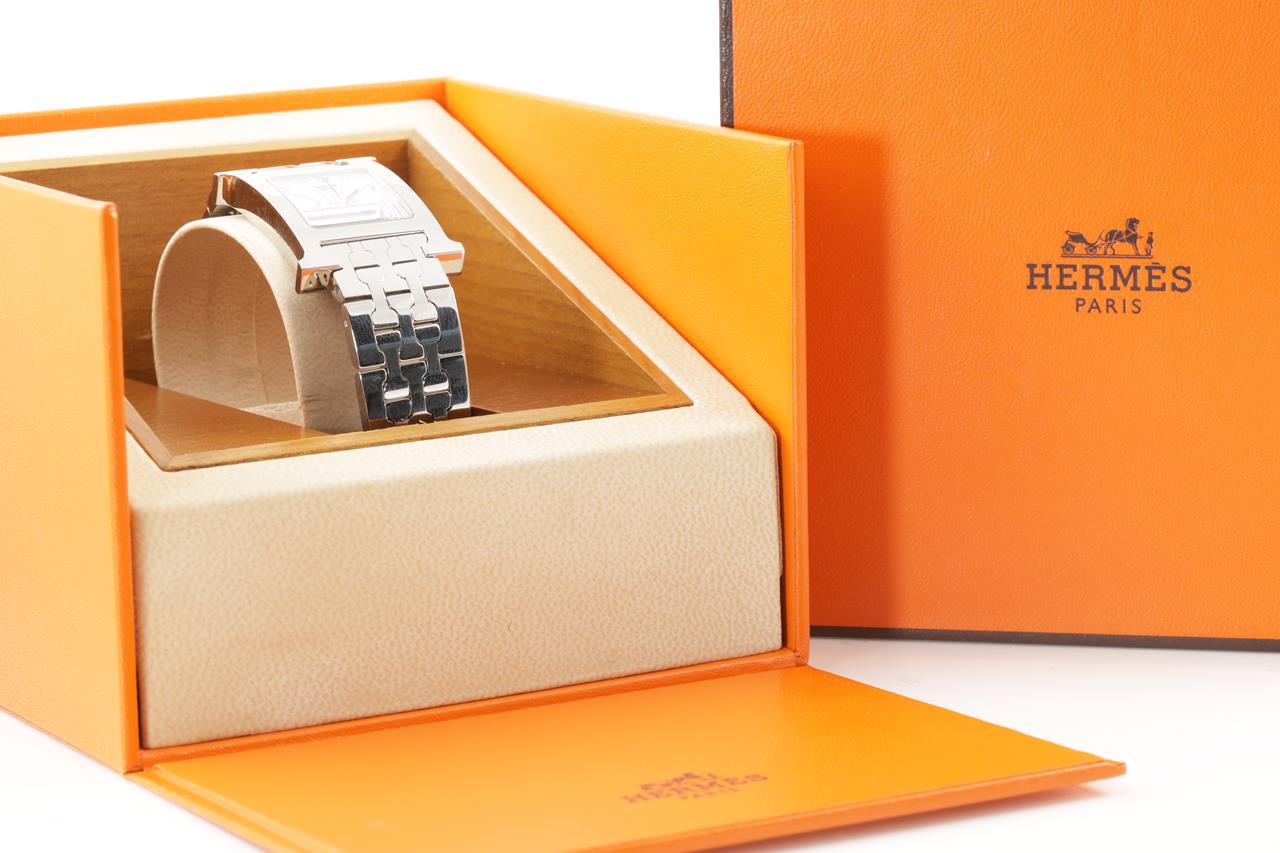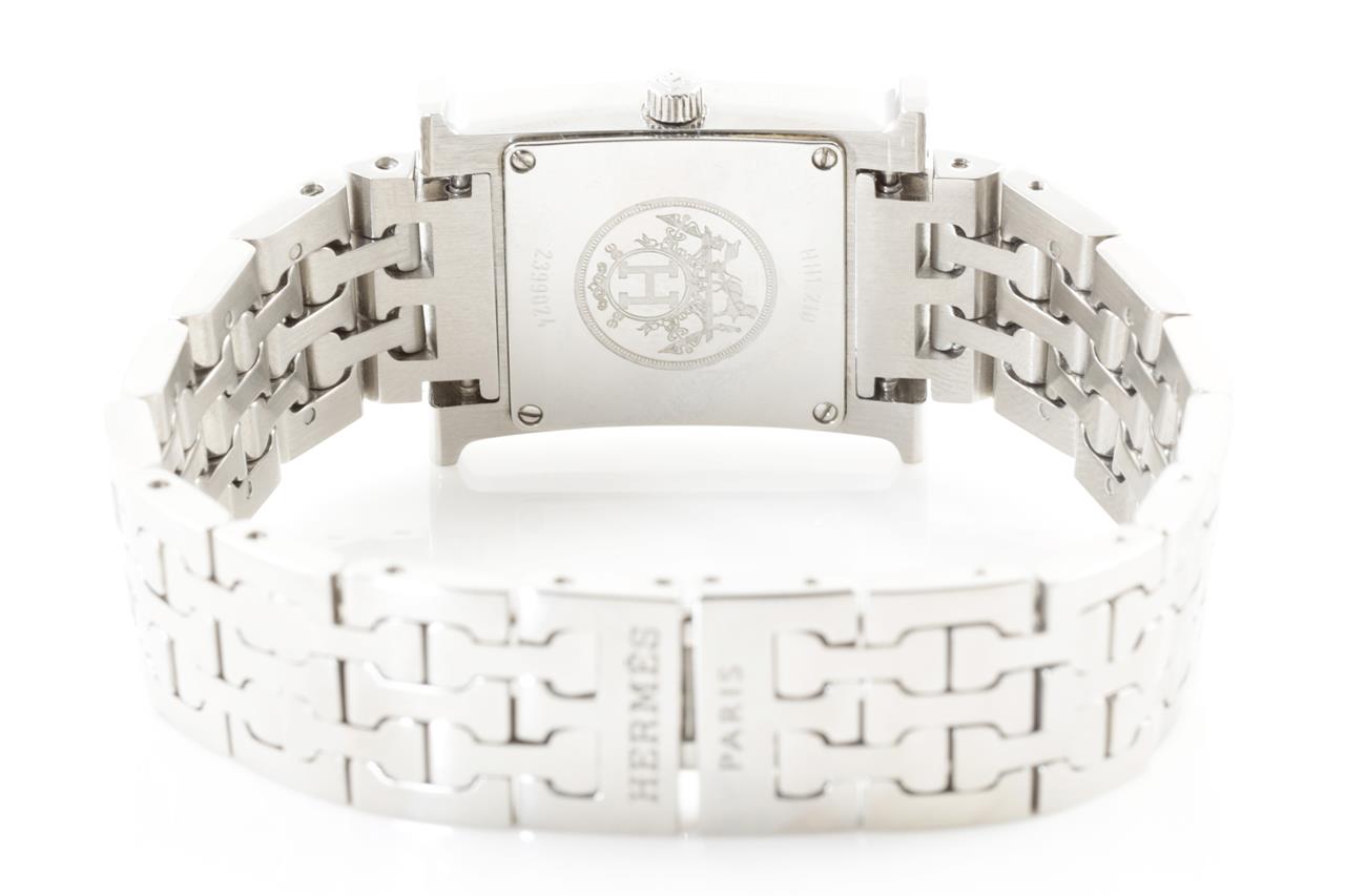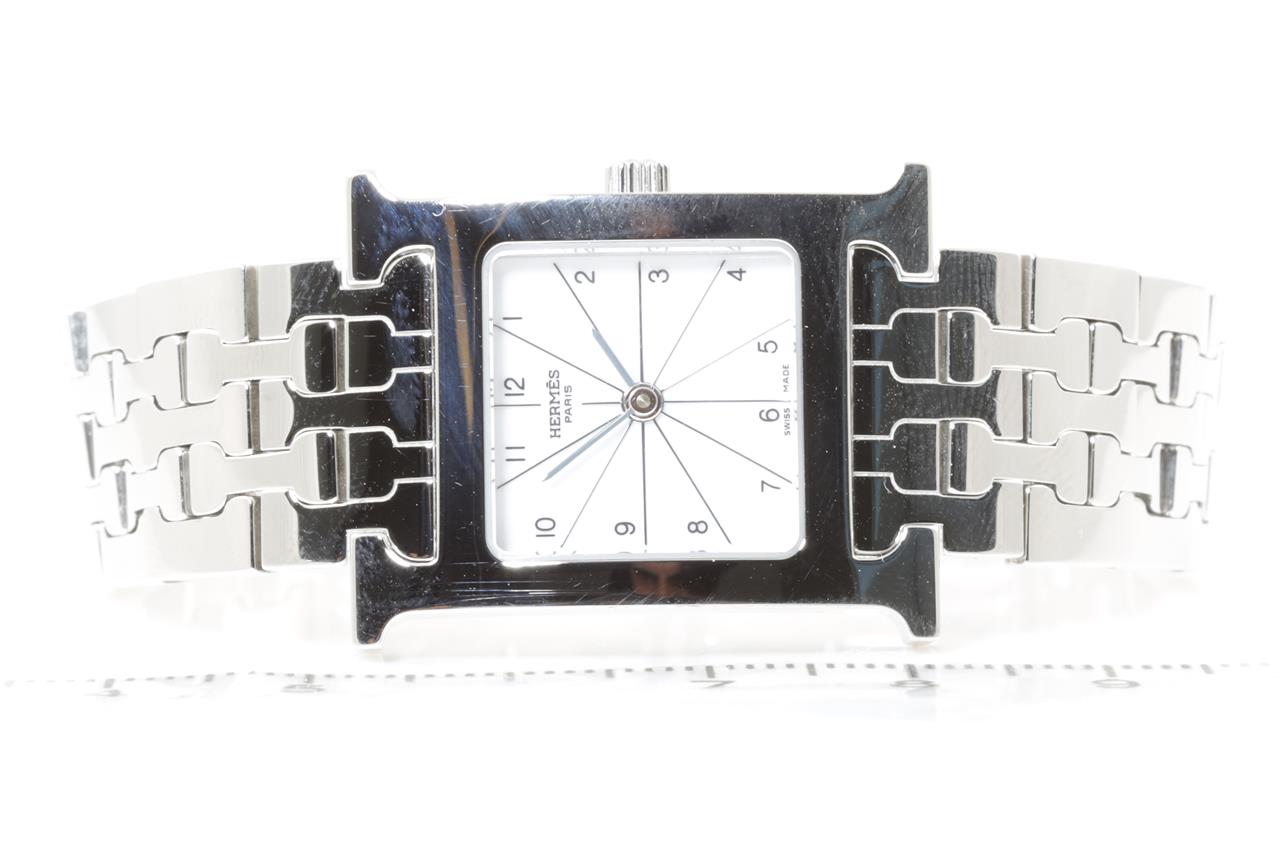 Hermes H quartz stainless steel ladies watch. White dial, case diameter: 30mm x 20mm, wrist size: 16cm, Swiss made. Ref# HH1.210. With Hermes stainless steel bracelet and clasp. With certificate of authenticity, Hermes international guarantee certificate booklet and Hermes box. 3 month FSA warranty. (Pre-owned)