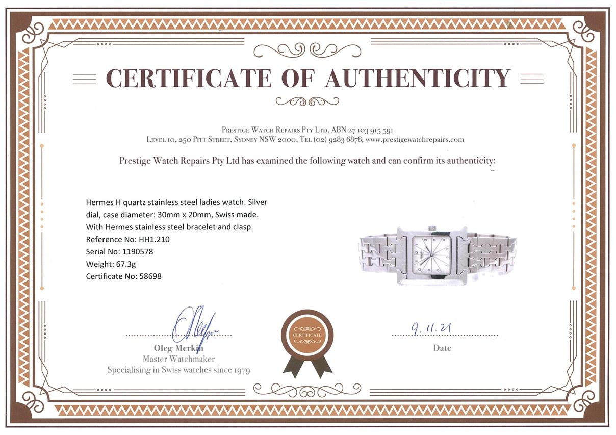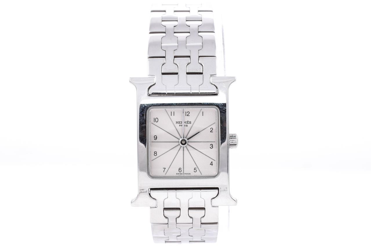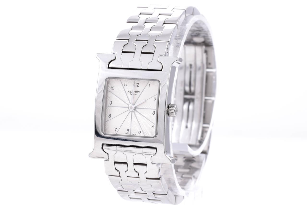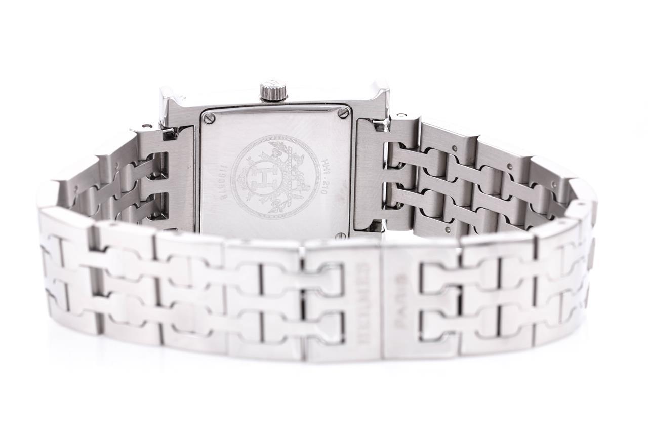 Hermes H quartz stainless steel ladies watch. Silver dial, case diameter: 30mm x 20mm, wrist size: 16cm, Swiss made. Ref# HH1.210. With Hermes stainless steel bracelet and clasp. With certificate of authenticity, Hermes international guarantee certificate booklet and Hermes pouch. 3 month FSA warranty. (Pre-owned)