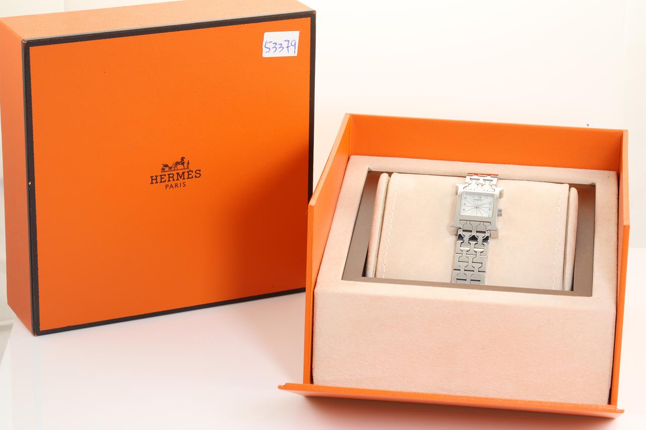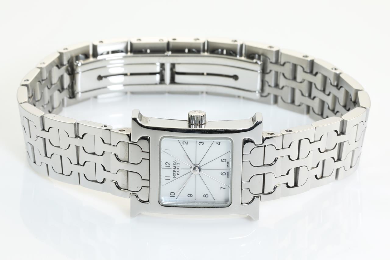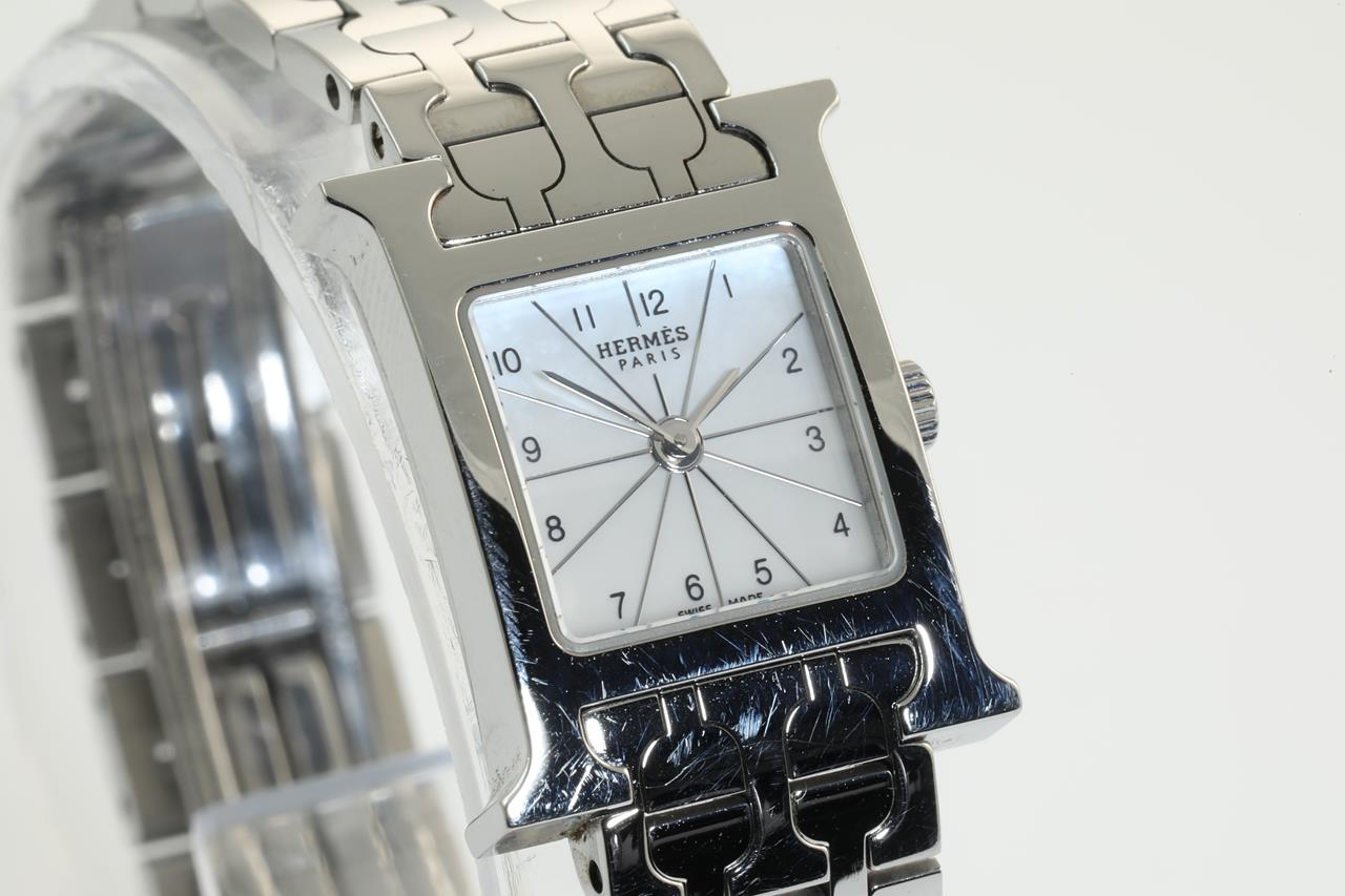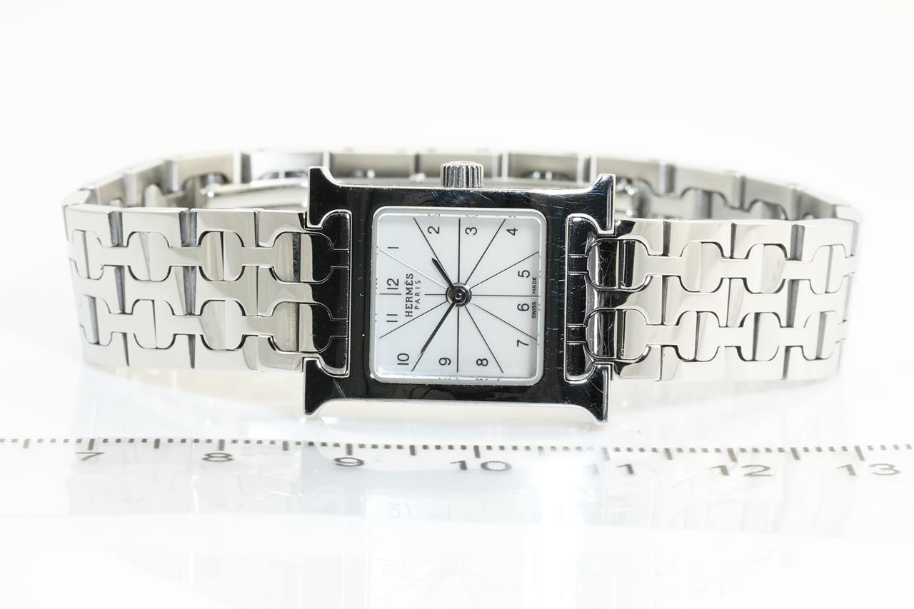 Hermes H stainless steel quartz ladies watch. Mother of Pearl dial, case diameter: 24.5cm x 17mm, wrist size: 16.5cm, Swiss made. Ref# HH1.110. With Hermes stainless steel bracelet and clasp. With Certificate of Authenticity, Hermes international guarantee booklet and Hermes box. 3 month FSA warranty. (Pre-owned)