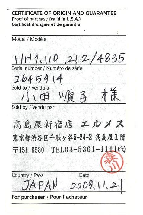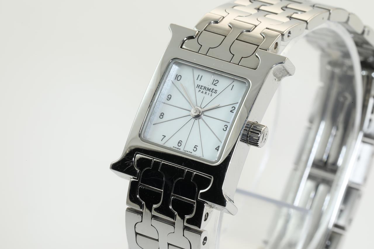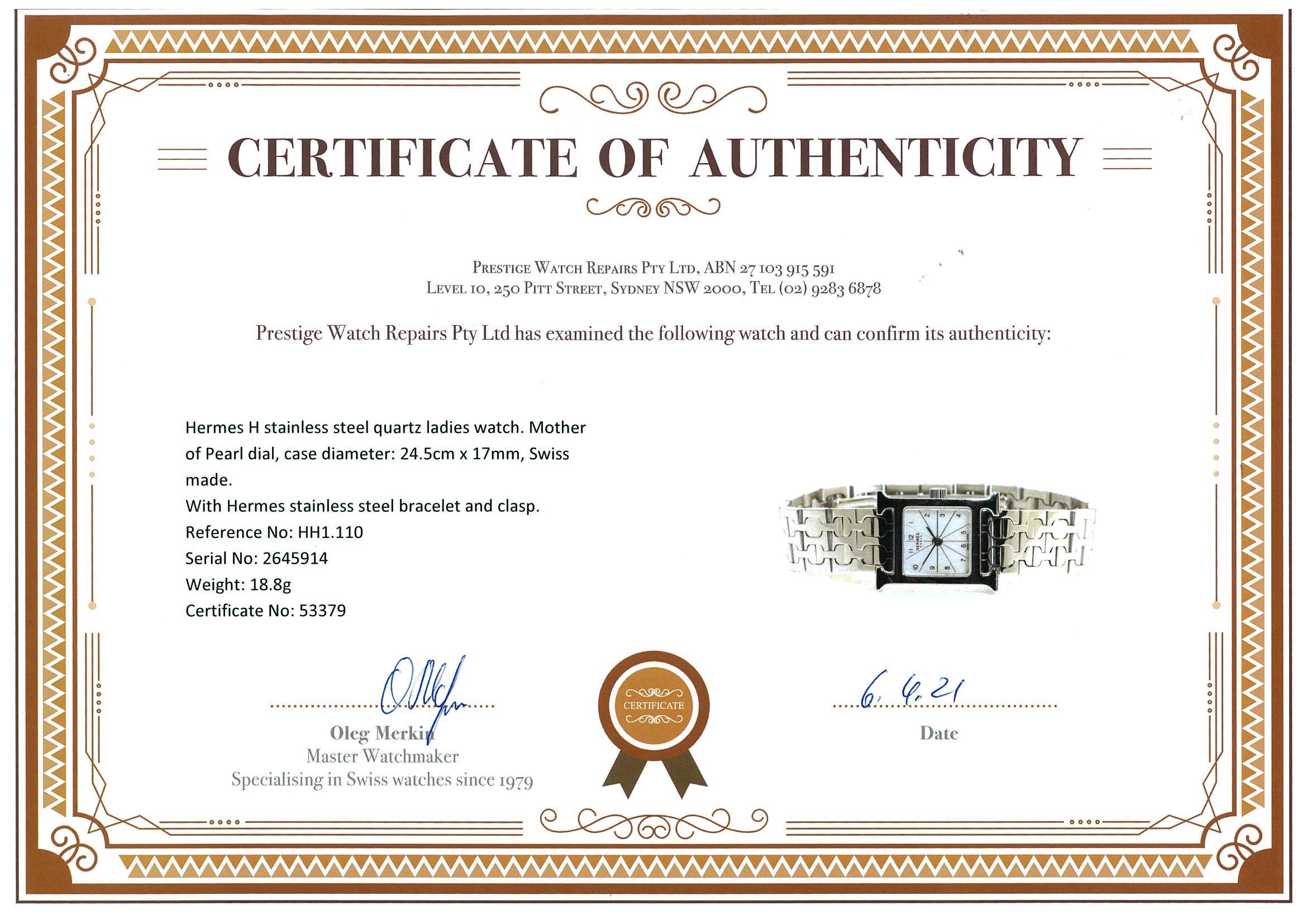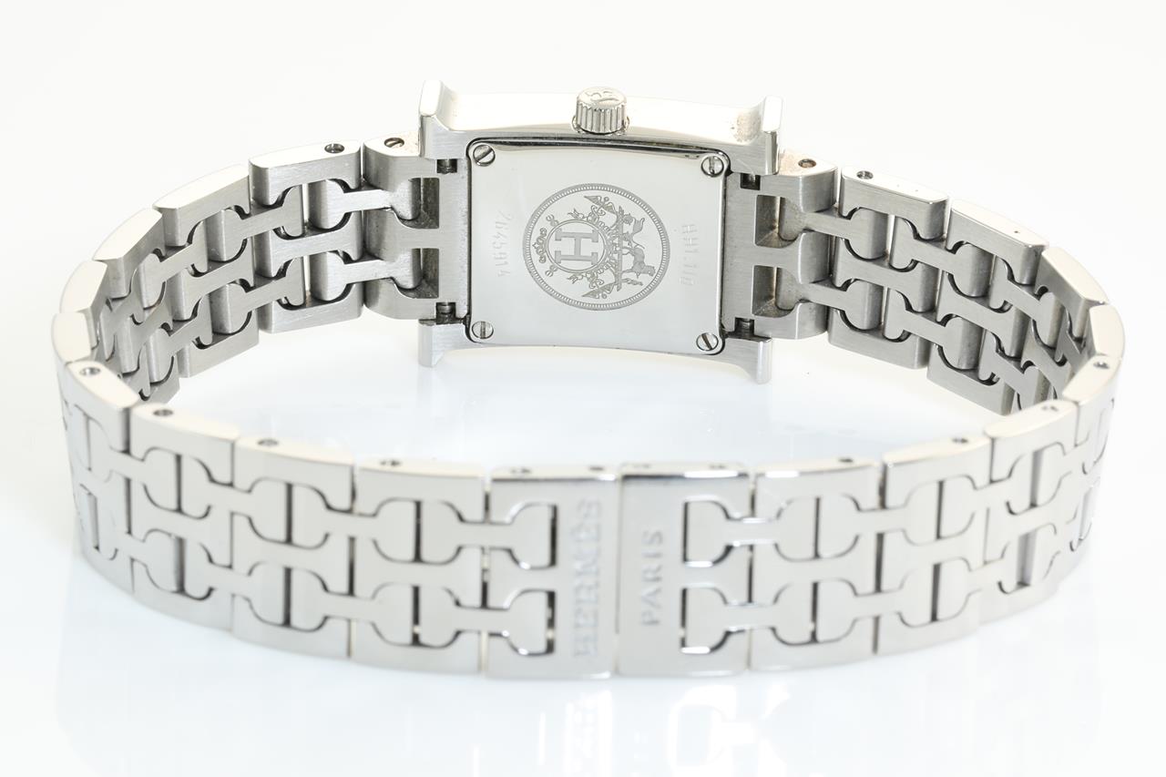 Hermes H stainless steel quartz ladies watch. Mother of Pearl dial, case diameter: 24.5cm x 17mm, wrist size: 16.5cm, Swiss made. Ref# HH1.110. With Hermes stainless steel bracelet and clasp. With Certificate of Authenticity, Hermes international guarantee booklet and Hermes box. 3 month FSA warranty. (Pre-owned)