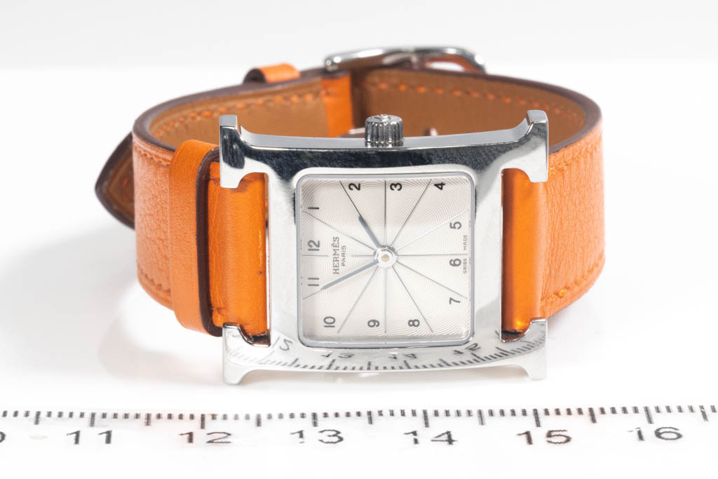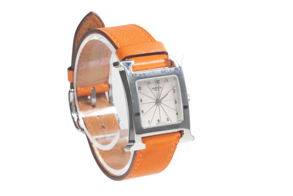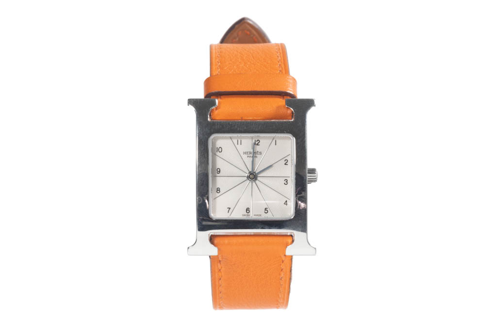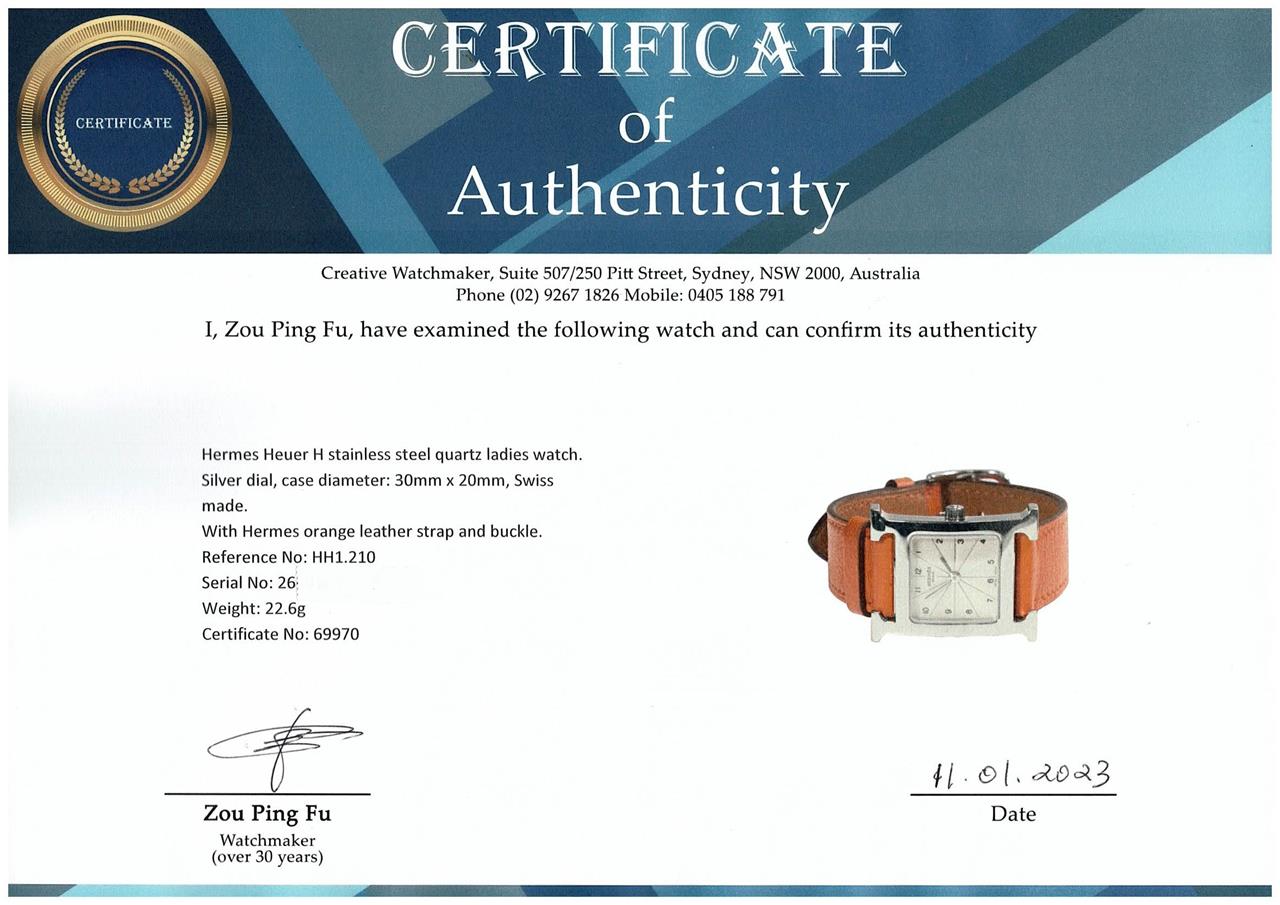 Hermes Heuer H stainless steel quartz ladies watch. Silver dial, case diameter: 30mm x 20mm, strap length: 17cm, Swiss made. Ref# HH1.210. With Hermes orange leather strap and buckle. With Certificate of Authenticity, Hermes International Guarantee booklet dated 13/12/2008 and Hermes box. 3 month FSA warranty (Pre-owned)