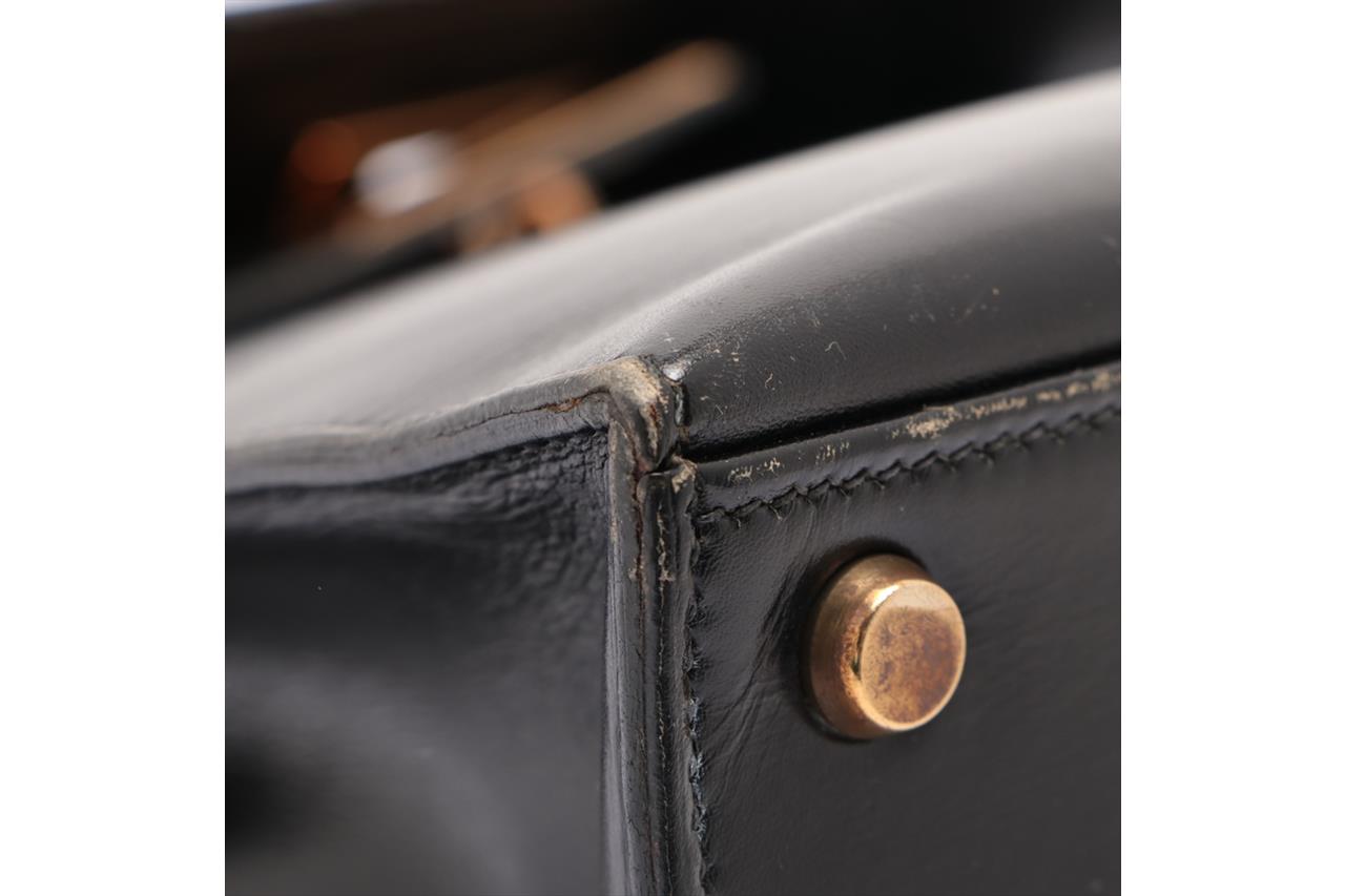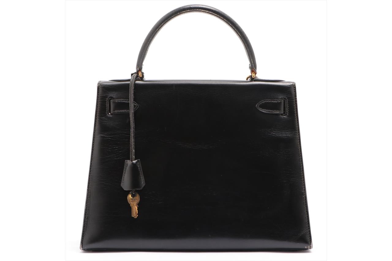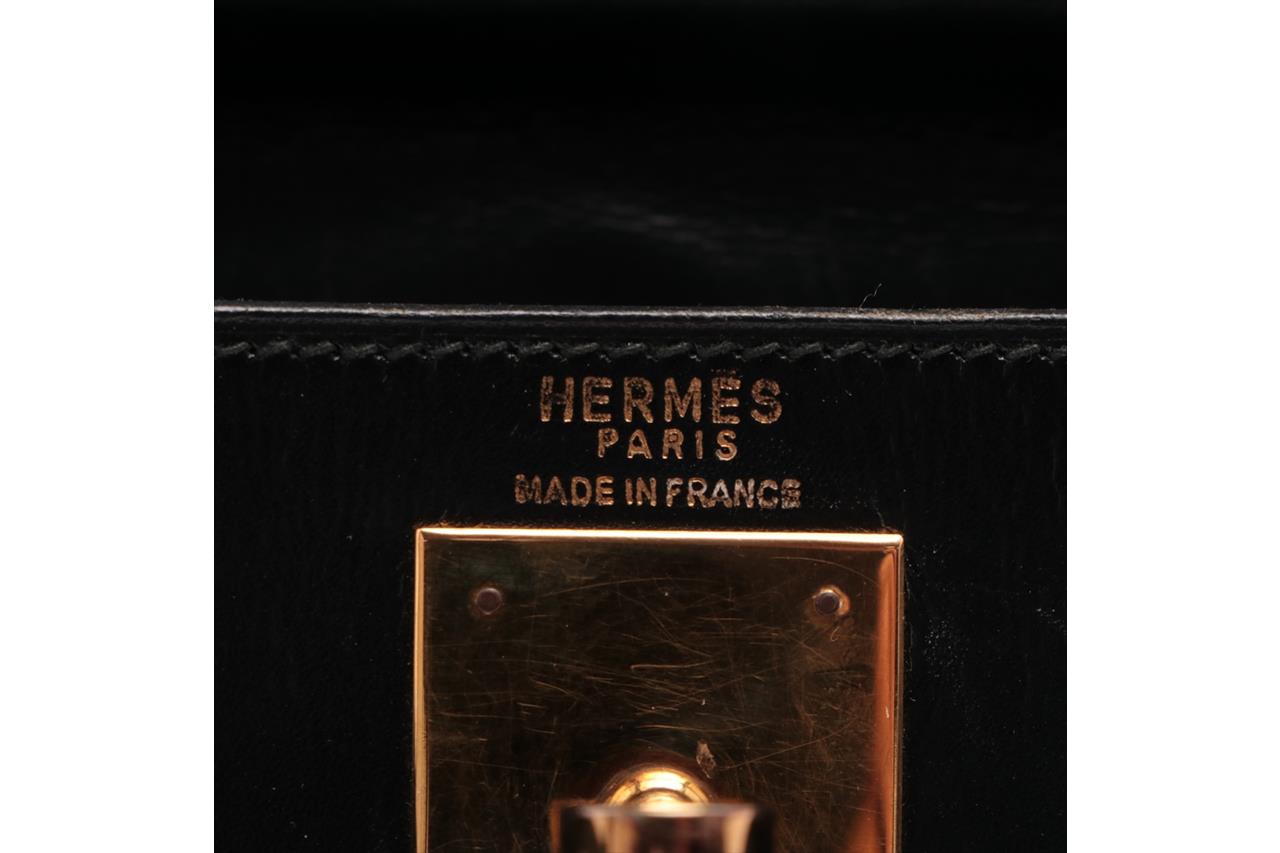 Vintage Hermes Kelly 28 in Black Box Calf Leather. Gold-tone hardware. Approximate dimensions: 28cm (L) x 22cm (H) x 11cm (D) and 10cm handle height. Accompanied by Hermes clochette, keys and padlock. With Entrupy Certificate of Authenticity. (Pre-owned)
