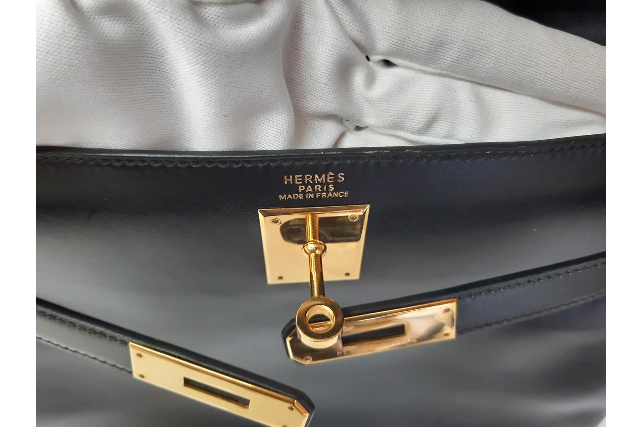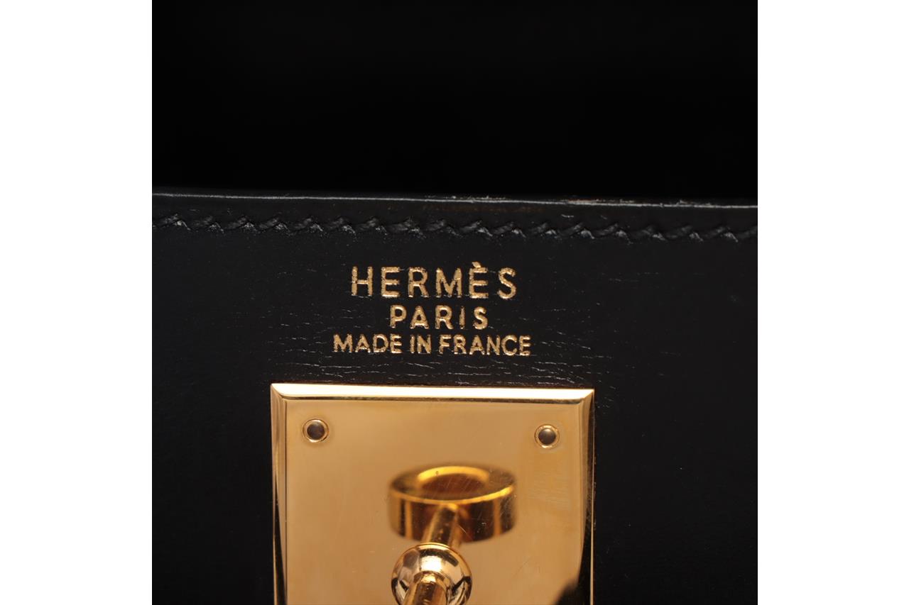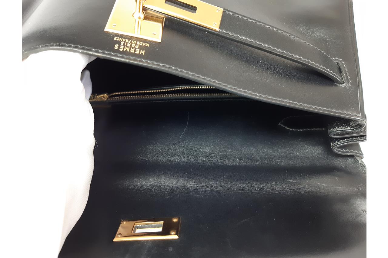 Hermes Kelly 32 bag in black Box Calf leather (Square A, 1997). Gold-toned hardware. Featuring frontal flap strap closure and a turn lock. The flap opens to a matte leather interior with zipped and flat pockets. Approximate dimensions: 32cm (L) x 22cm (H) x 12cm (D), 9.5cm handle height and 44cm detachable shoulder strap height. Accompanied by Hermes keys, clochette and dust bag (padlock NOT included). With Entrupy Certificate of Authenticity. (Pre-owned)