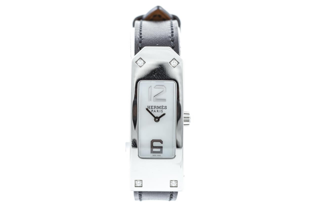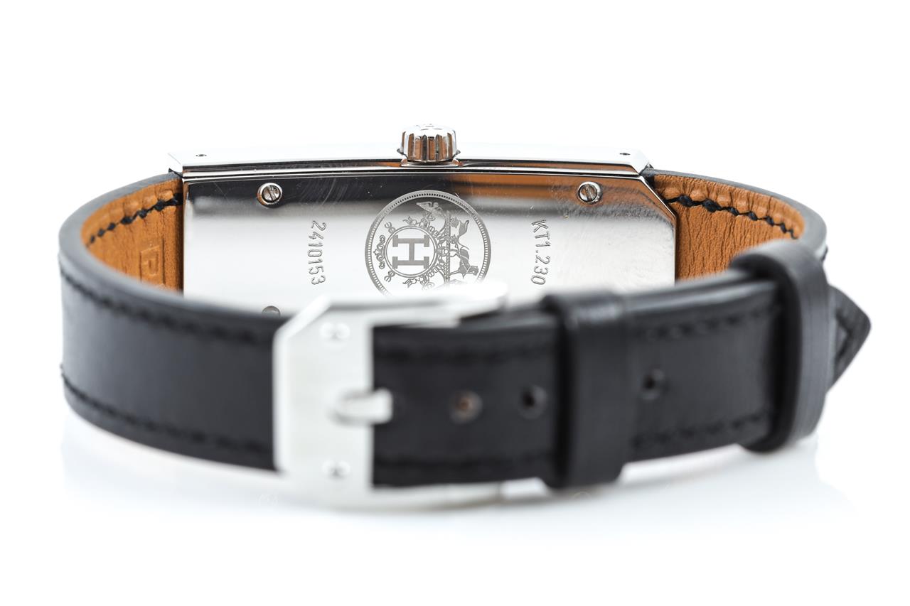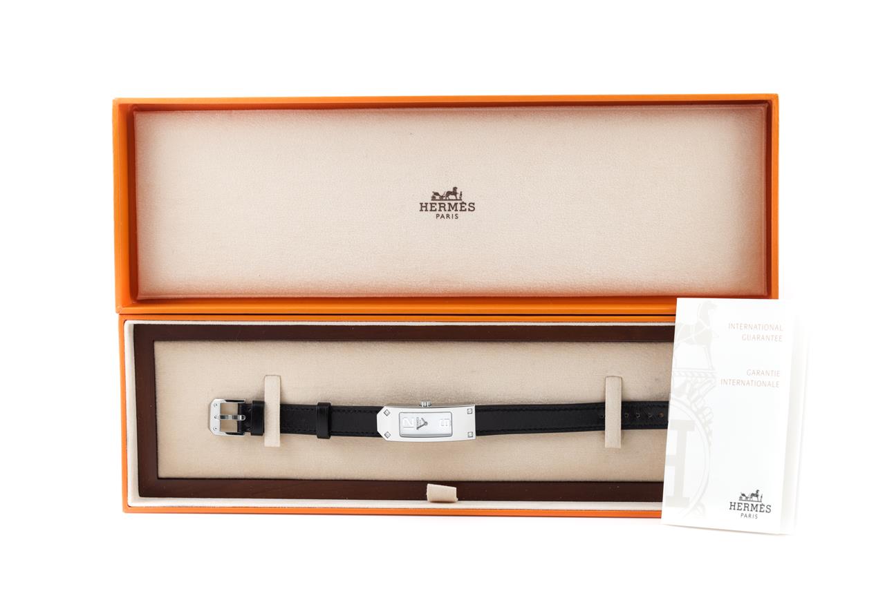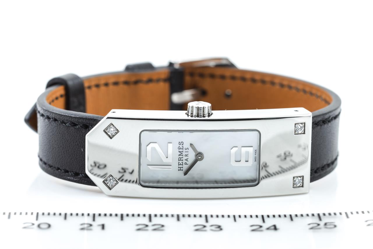 Hermes Kelly II stainless steel quartz ladies watch. Mother of Pearl dial, case diameter: 40mm x 15mm, wrist length: 18cm, Swiss made. Ref# KT1.230. With Hermes black leather strap and clasp. With certificate of authenticity, Hermes guarantee booklet and Hermes box. 3 month FSA warranty. (Pre-owned)