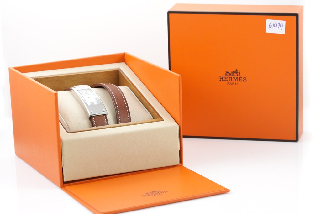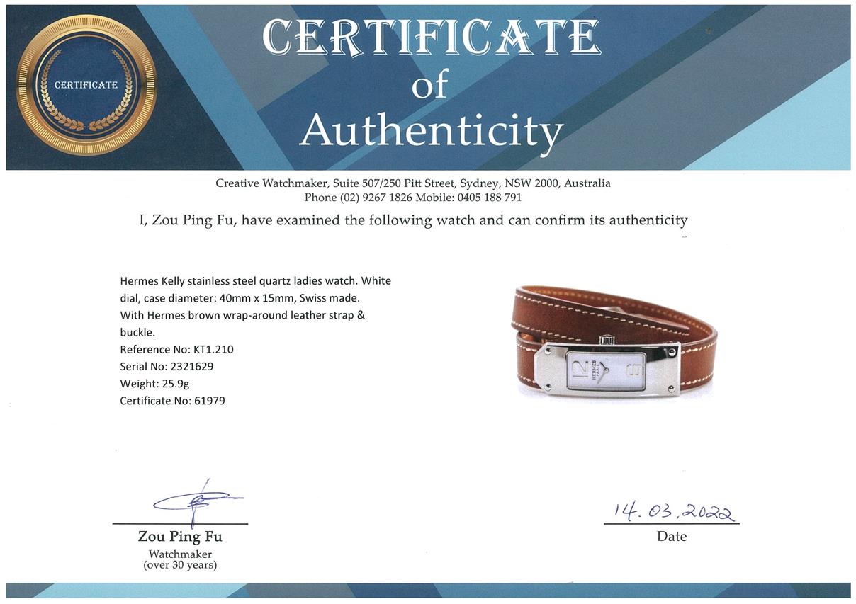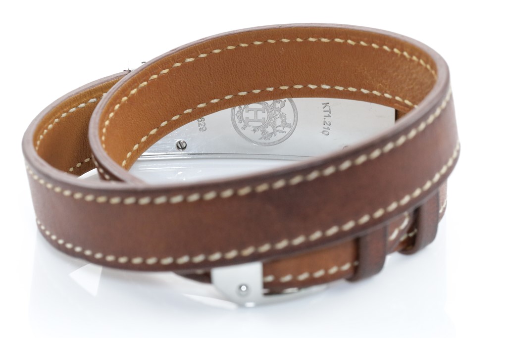 Hermes Kelly stainless steel quartz ladies watch. White dial, case diameter: 40mm x 15mm, length: 33cm, Swiss made. Ref# KT1.210. With Hermes brown wrap-around leather strap and buckle. With Certificate of Authenticity, Hermes International Guarantee Booklet dated 03/08/2009 and Hermes box. and 3 month FSA warranty. (Pre-owned)