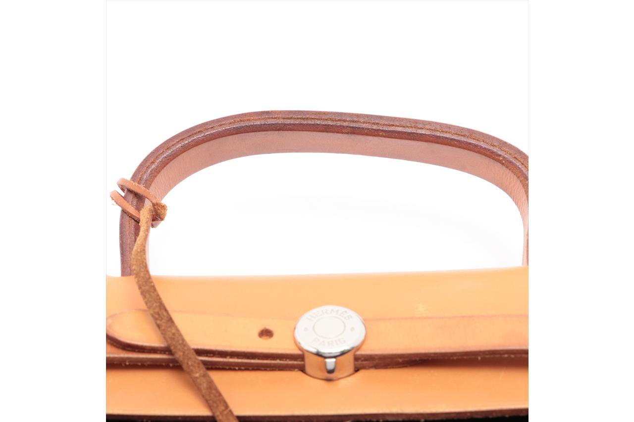 Hermes Navy Canvas Natural Brown Leather Zip PM Herbag. Palladium hardware. Approximate dimensions: 32cm (L) x 25cm (H) x 11cm (D) and 7.5cm handle height. Accompanied by Hermes lock, clochette, keys, dust bag and protector. With Entrupy Certificate of Authenticity. (Pre-owned)