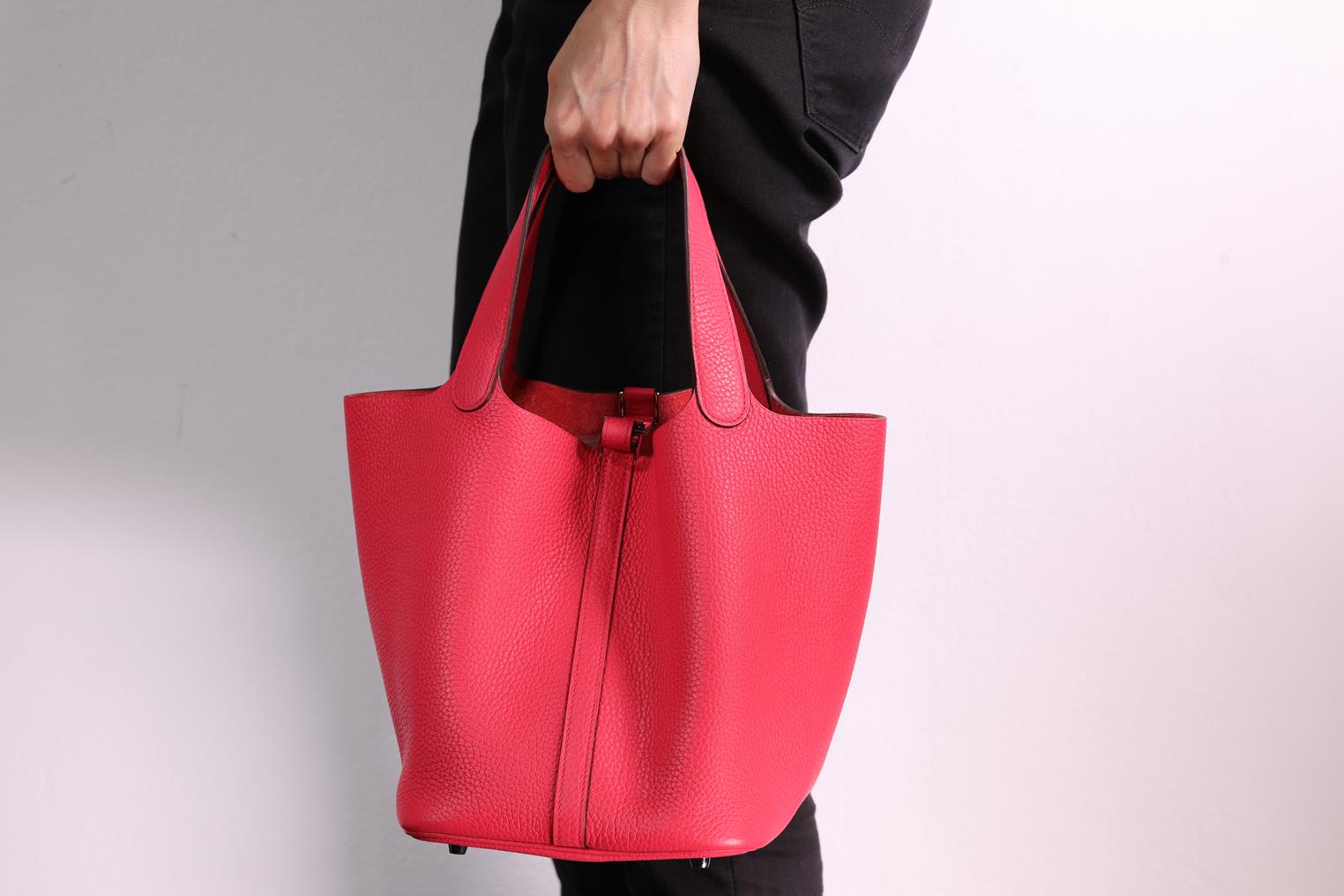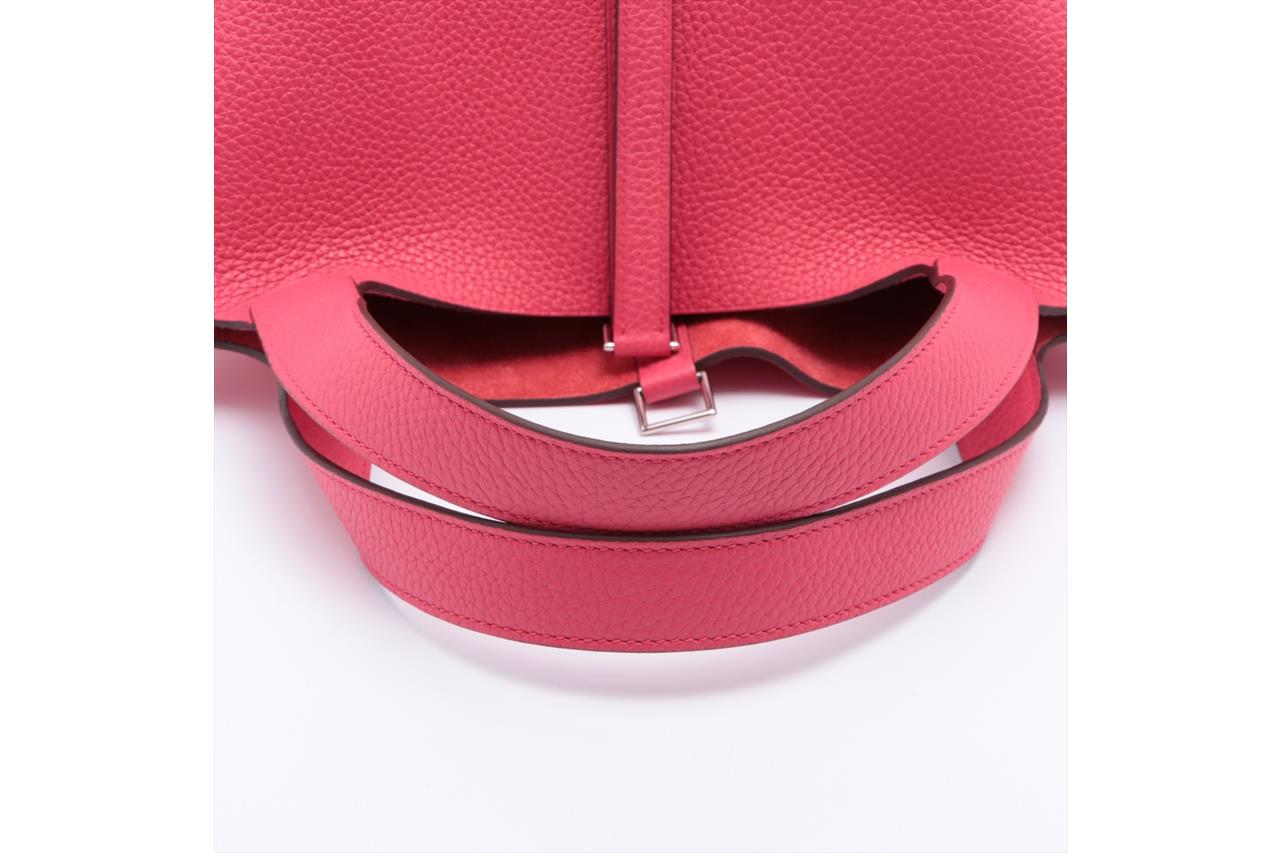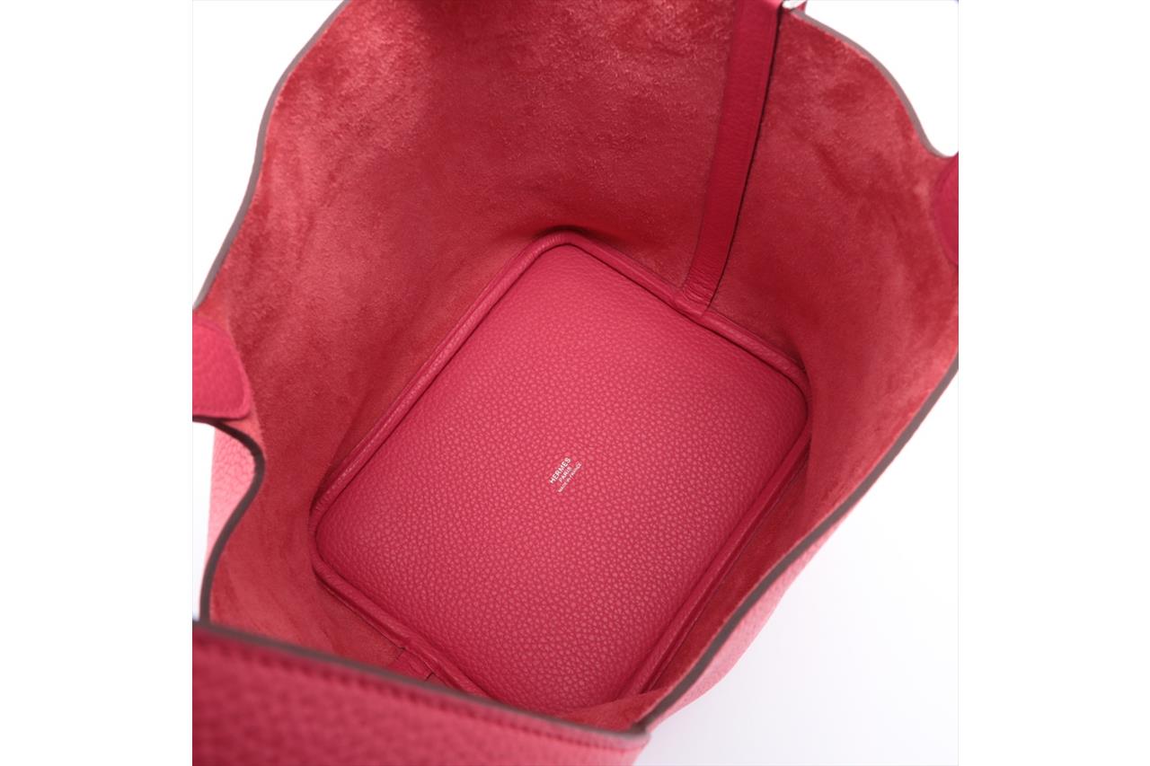 Hermes Picotin Lock MM in Rose Lipstick Taurillon Clemence Leather. Palladium hardware. Circa 2019. Approximate dimensions: 22cm (L) x 22cm (H) x 18cm (D). Made in France. Accompanied by Hermes box, papers, dust bag, keys and padlock. With Entrupy Certificate of Authenticity. (As New)
