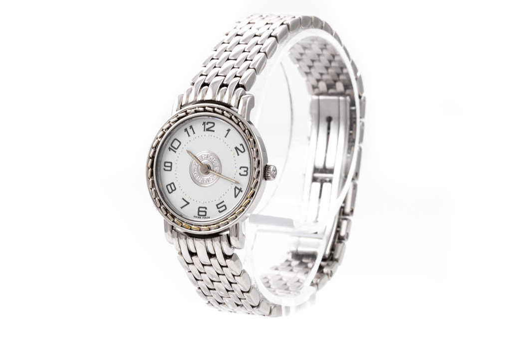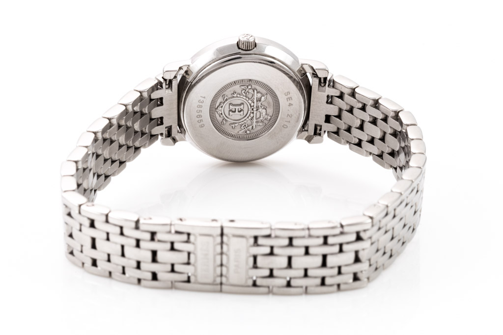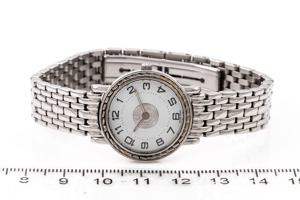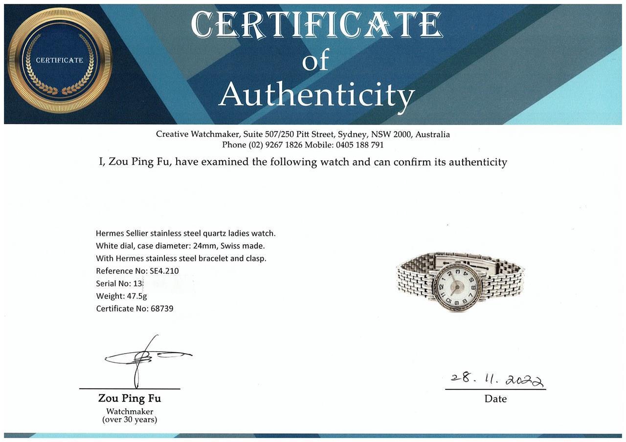 Hermes Sellier stainless steel quartz ladies watch. White dial, case diameter: 24mm, wrist size: 16cm, Swiss made. Ref# SE4.210. With Hermes stainless steel bracelet and clasp. With Certificate of Authenticity and 3 month FSA warranty. (Pre-owned)