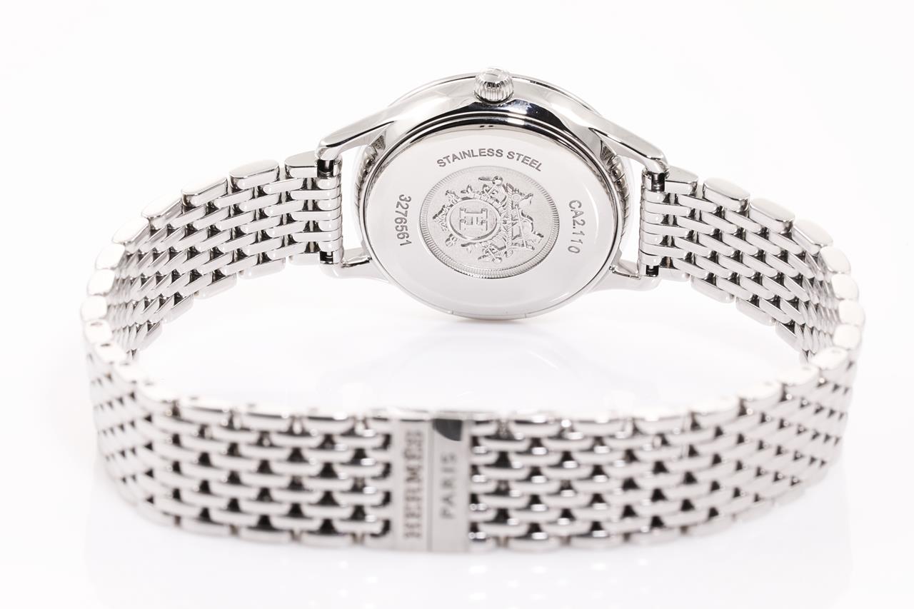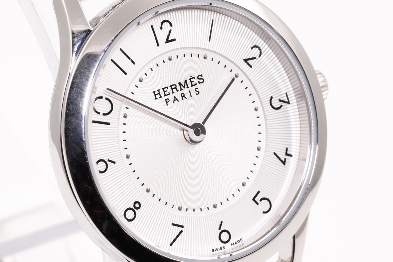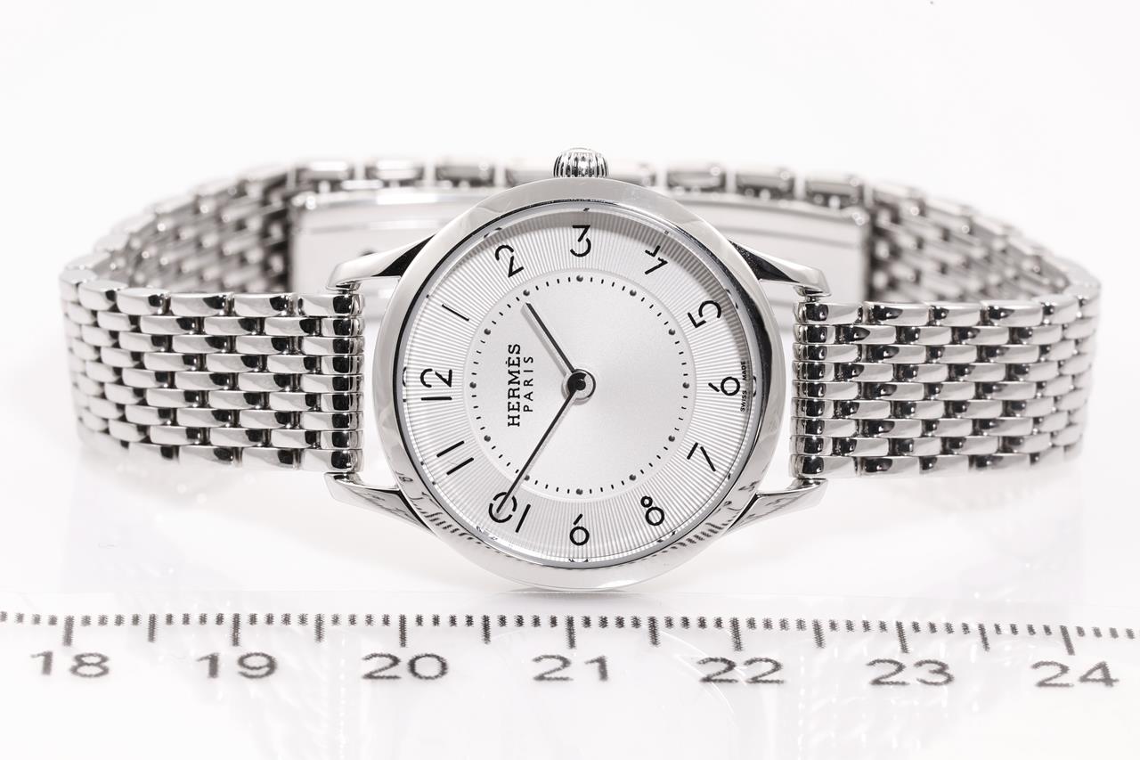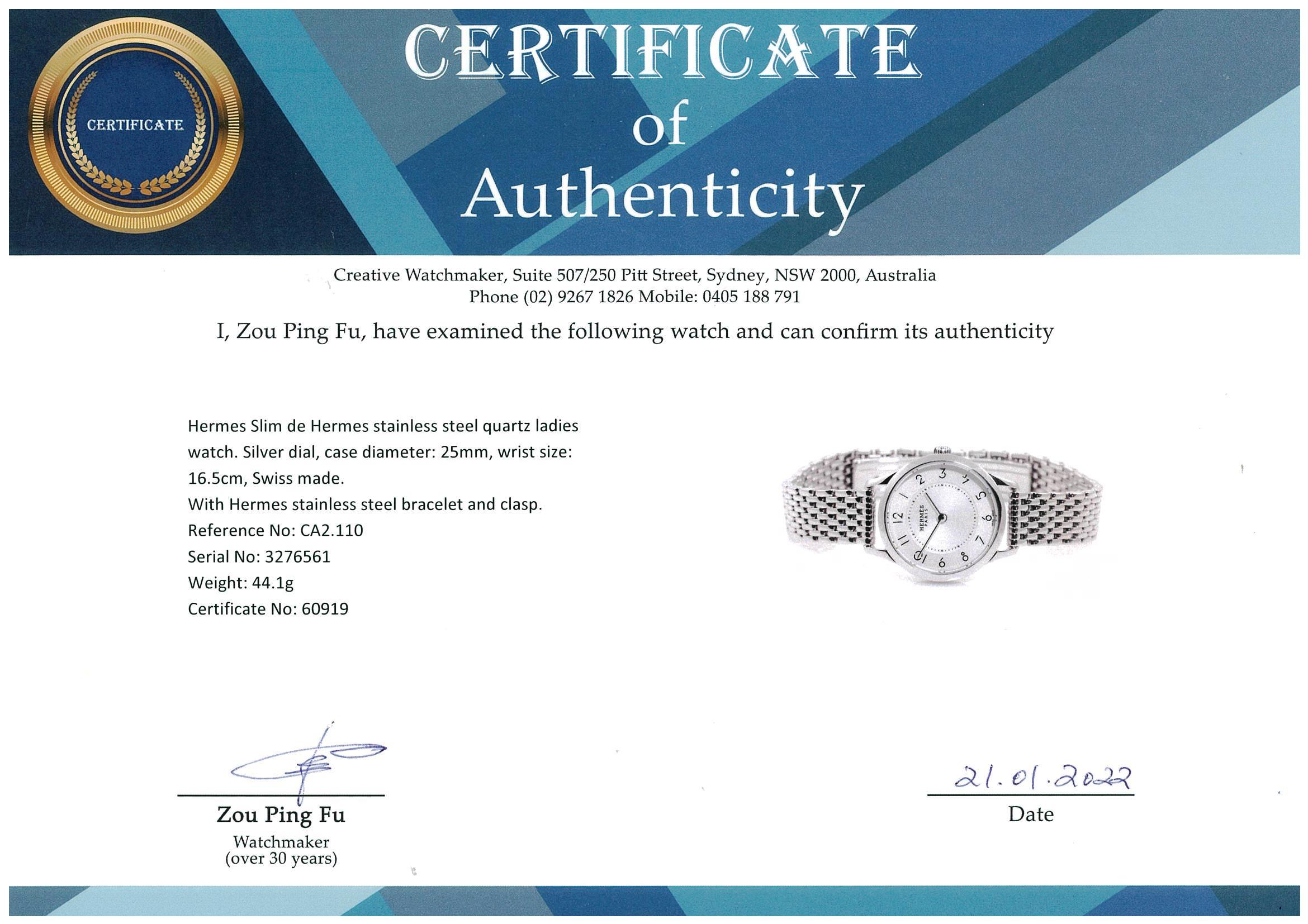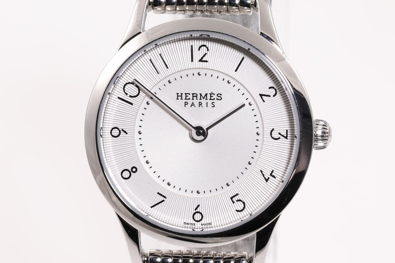 Hermes Slim de Hermes stainless steel quartz ladies watch. Silver dial, case diameter: 25mm, wrist size: 16.5cm, Swiss made. Ref# CA2.110. With Hermes stainless steel bracelet and clasp. With Certificate of Authenticity, Hermes International Warranty Booklet and Hermes box. 3 month FSA warranty (Pre-owned)