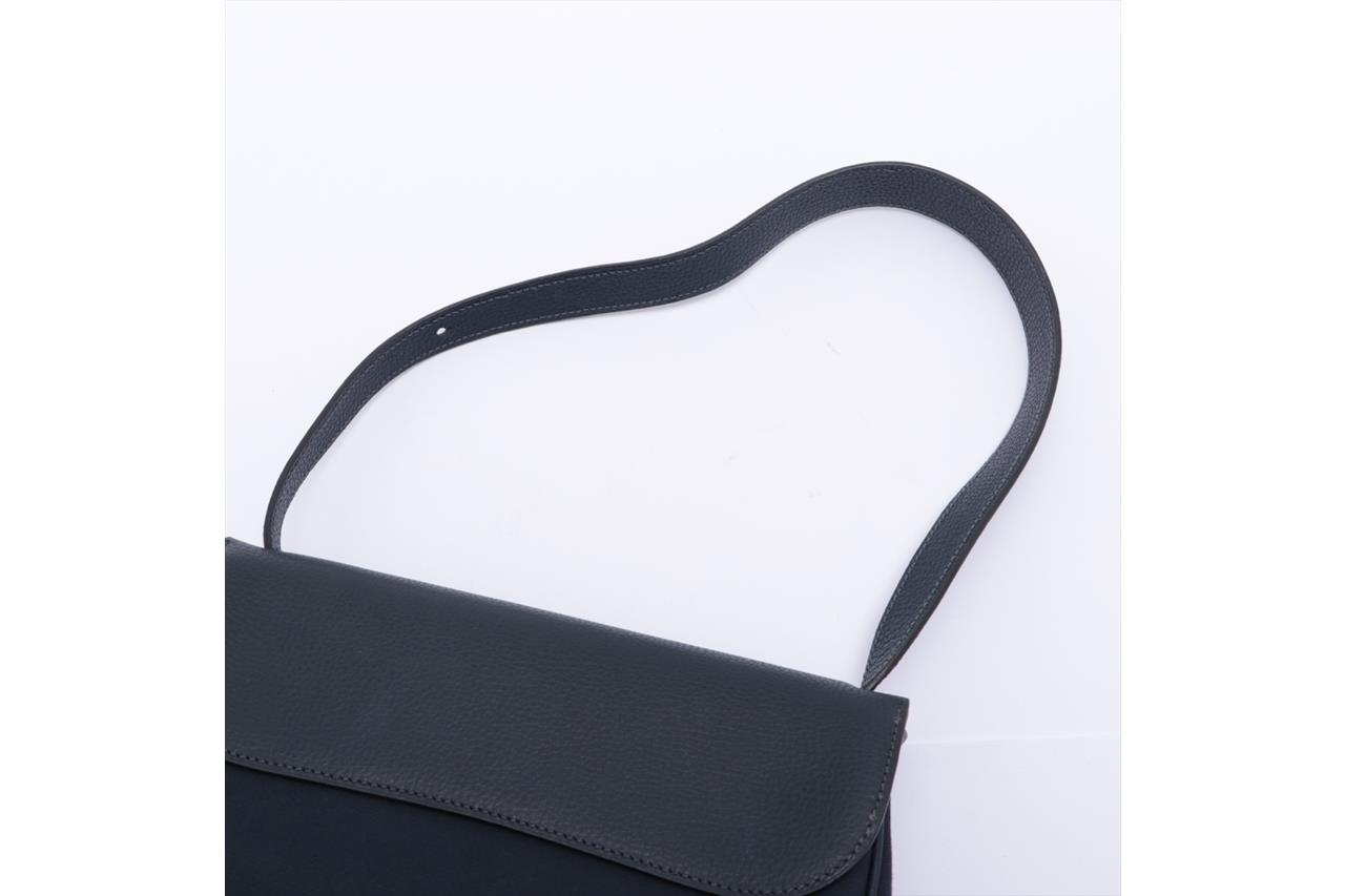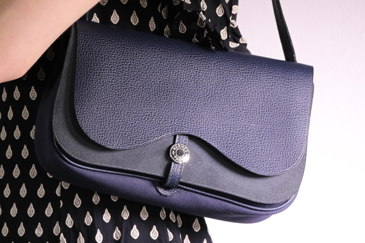 Hermes Vache Liegee Toile Sac Colorado PM in Blue Grained Leather and Blue Suede. Silver-tone hardware and Palladium closure. Approximate dimensions: 22cm (L) x 16cm (H) x 2cm (D). Accompanied by Hermes dust bag and protector. With Entrupy Certificate of Authenticity. (Pre-owned)