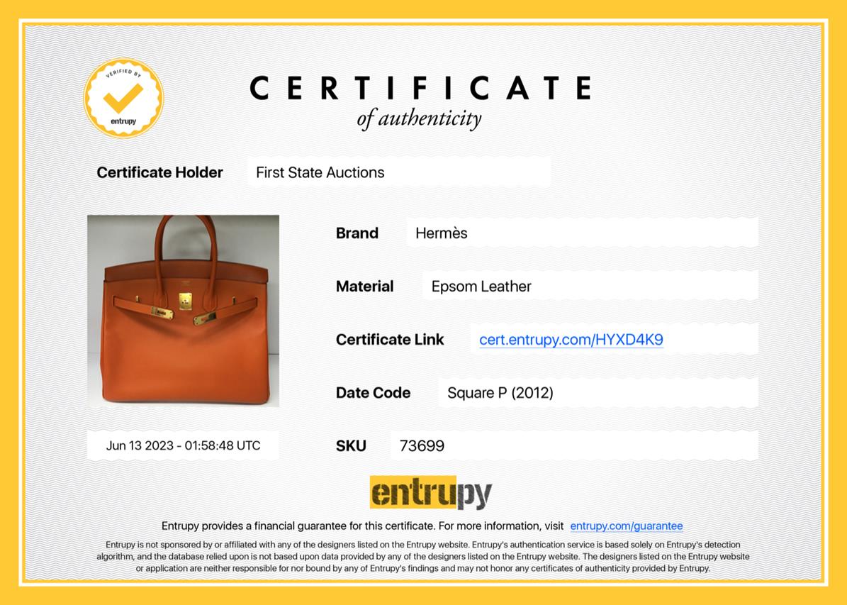 Hermes Birkin 35 in Mango Veau Epsom Leather (P in Square, Circa: 2012). Gold-toned hardware. Featuring rolled leather top handles, a frontal flap with strap closure and a turn lock. The top flap opens to a matte leather interior with zipper and patch pockets. Approximate dimensions: 35cm (L) x 28cm (H) x 18cm (D) and 11cm handle drop. Accompanied by Hermes clochette, keys, padlock and box. With Entrupy Certificate of Authenticity. (Pre-owned)