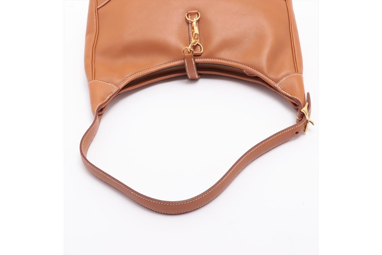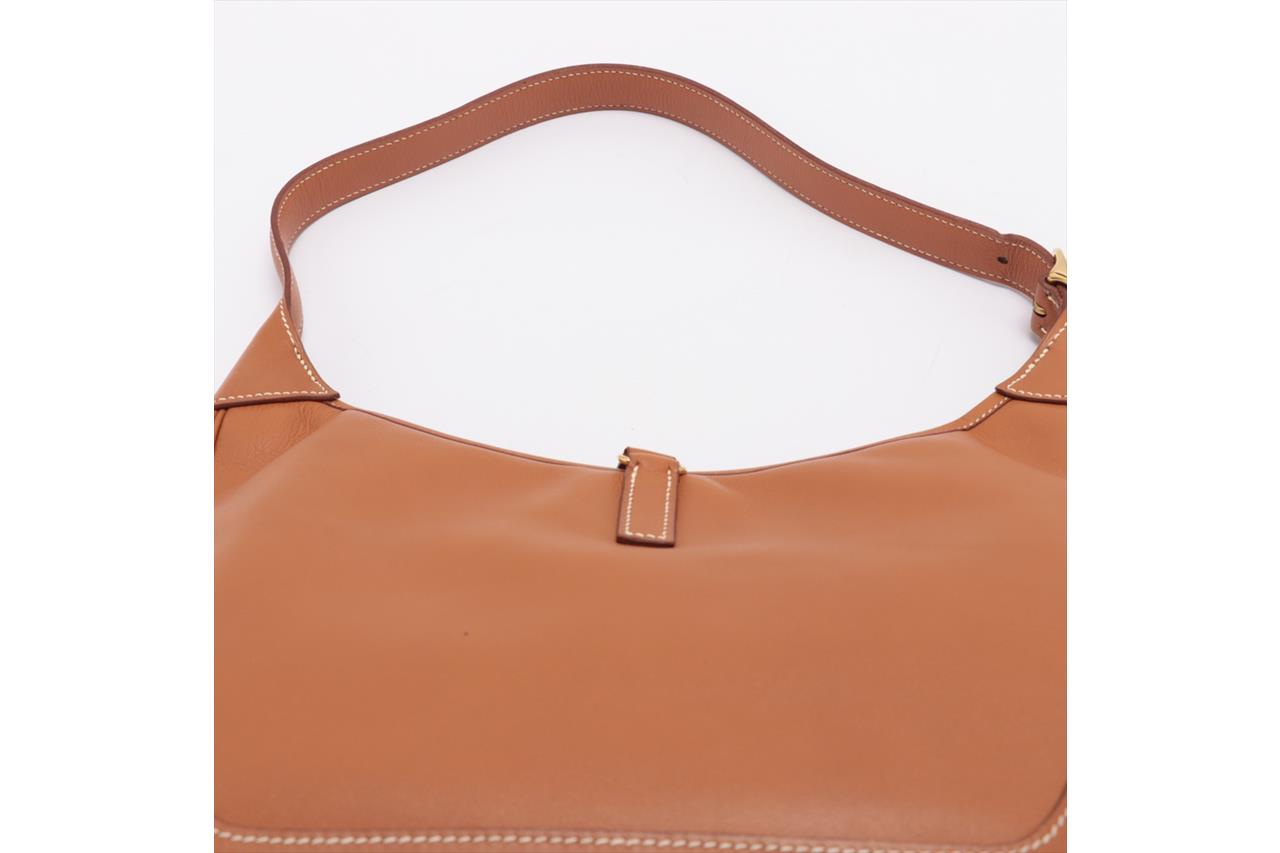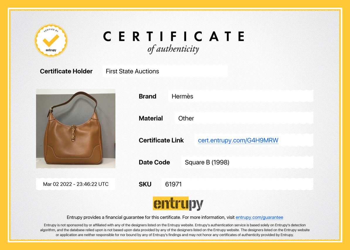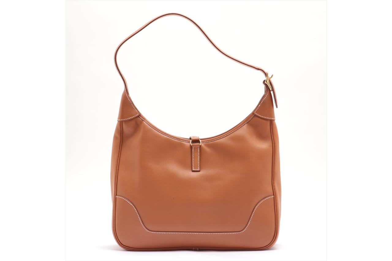 Hermes Vintage Trim 31 in Gold Evercalf Leather. Circa 1998. Gold-tone palladium hardware. Featuring a single top handle, clasp fastening, zip-top fastening and an internal slip pocket. Approximate dimensions: 31cm (L) x 22cm (H) x 5cm (D), 20cm shoulder drop and 38cm shoulder strap length. Accompanied by Hermes dust bag. With Entrupy Certificate of Authenticity. (Pre-owned)