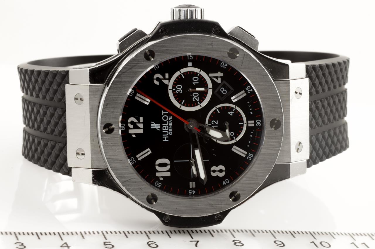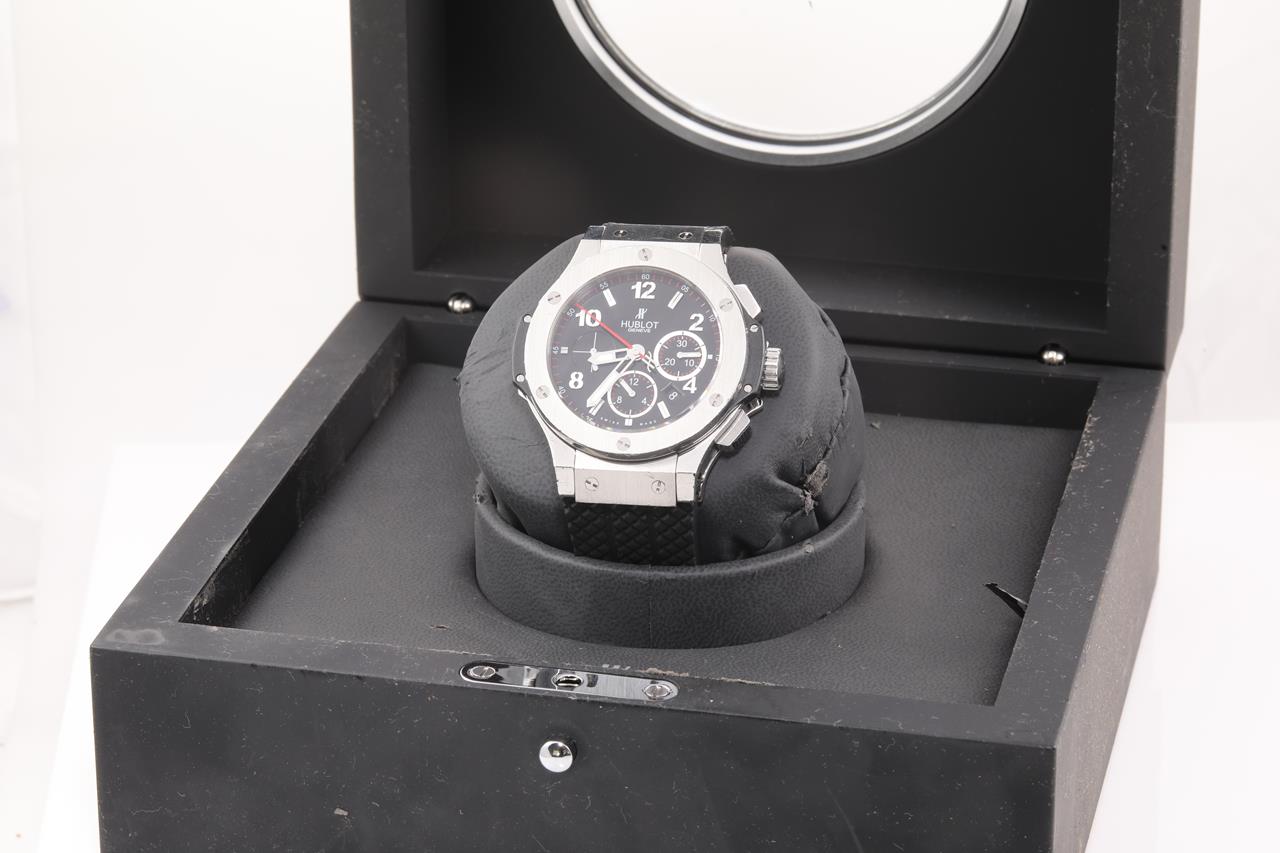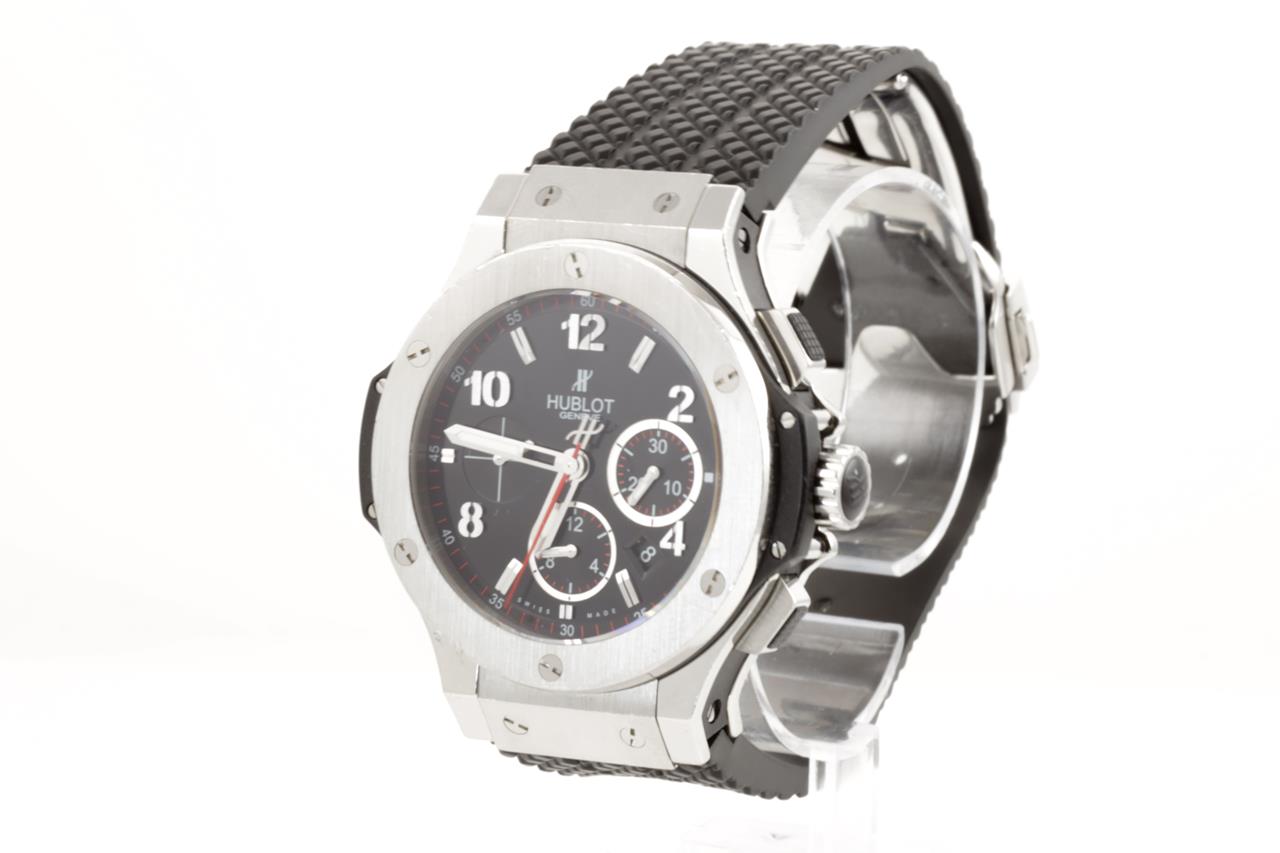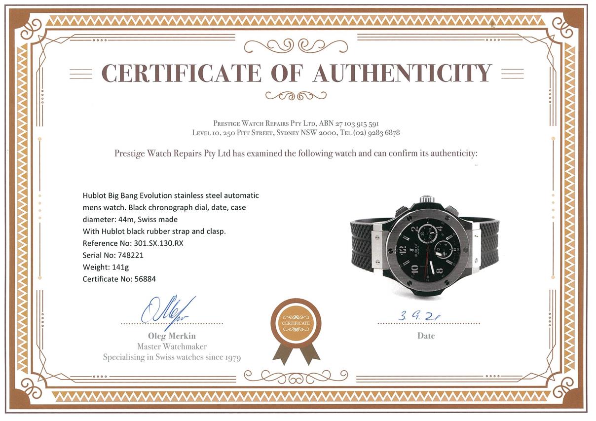 Hublot Big Bang Evolution stainless steel automatic mens watch. Black chronograph dial, date, case diameter: 44m, wrist size: 20cm (adjustable), Swiss made. Ref# 301.SX.130.RX. With Hublot black rubber strap and clasp. With certificate of authenticity, Hublot international warranty card dated 13/10/2012 and Hublot box. 3 month FSA warranty. (Pre-owned)