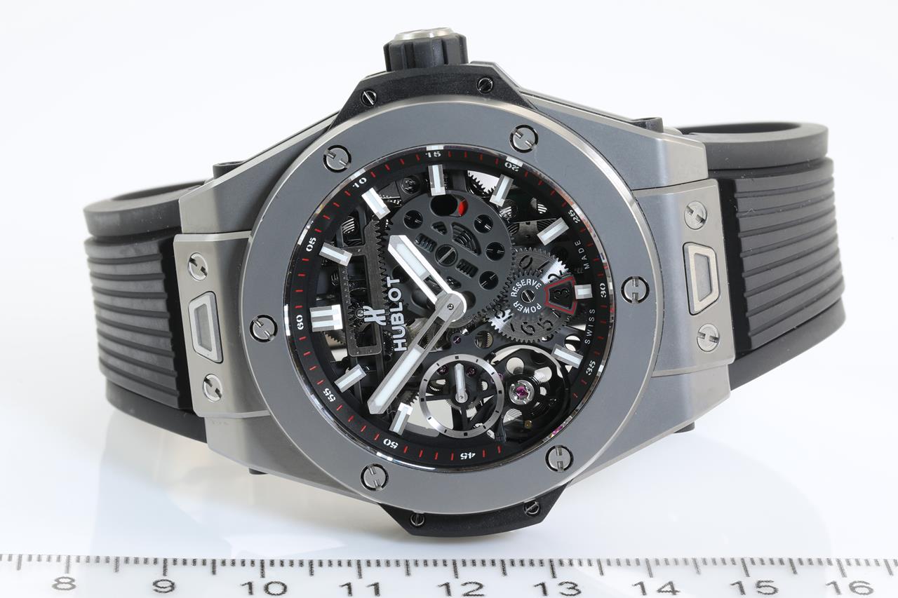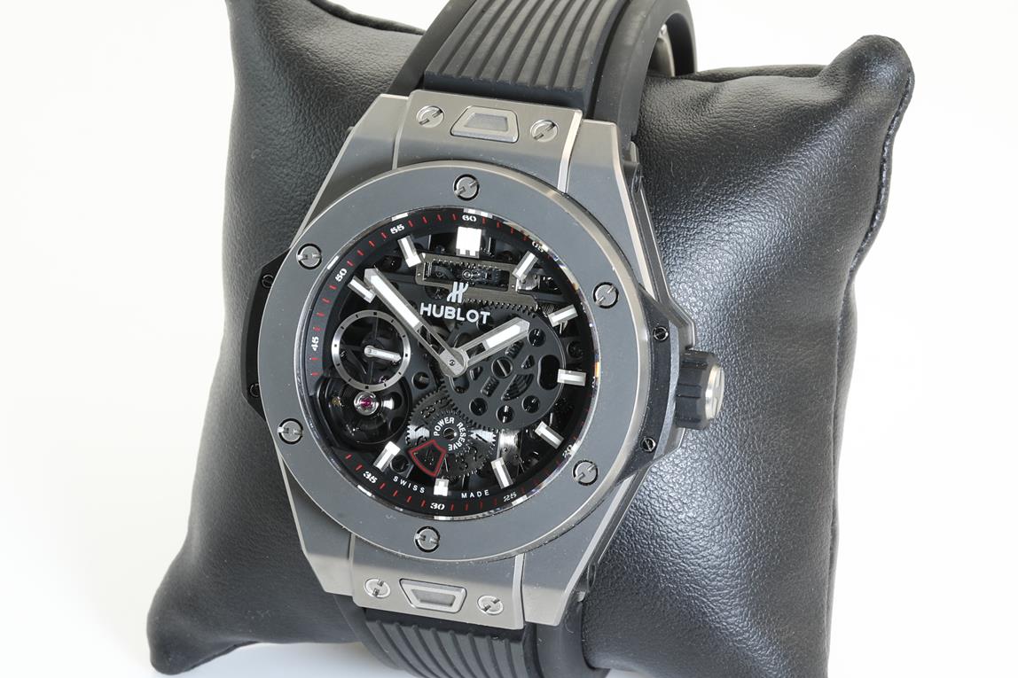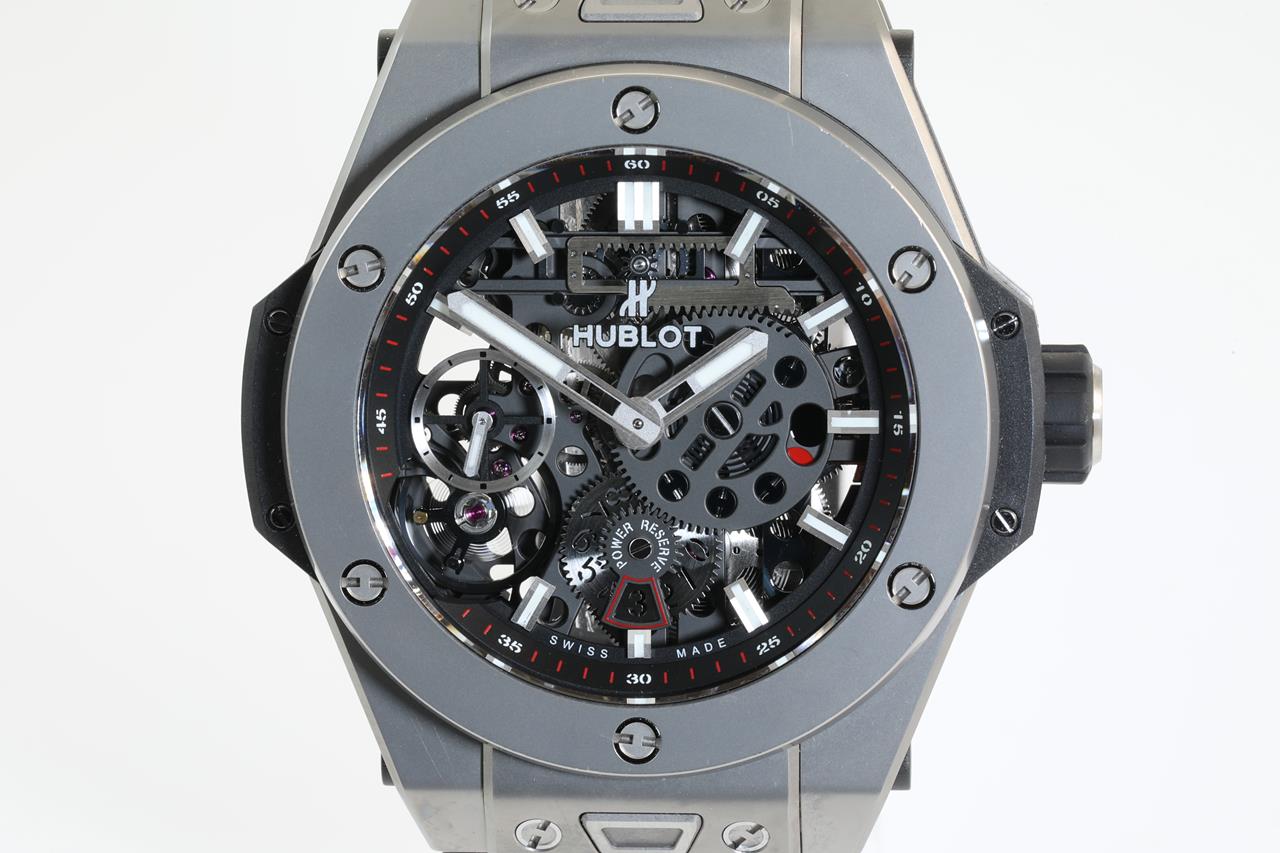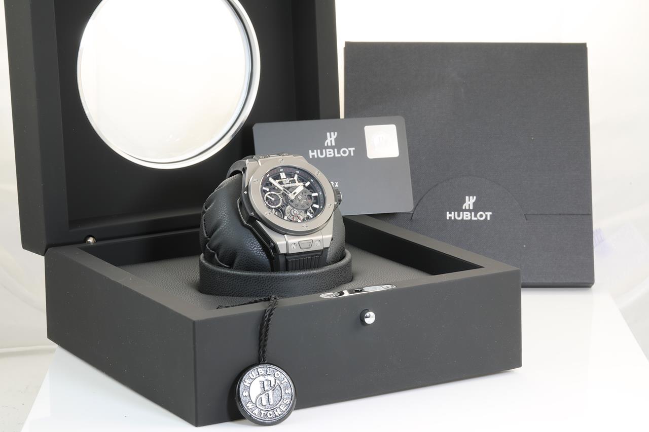 Hublot Big Bang MECA-10 manual winding titanium mens watch. Black Skeleton dial, case diameter: 45mm, wrist size: 19cm (adjustable), Swiss made. Ref# 414.NI.1123.RX. With Hublot black rubber strap and clasp. With Certificate of Authenticity. With Hublot international warranty card dated 2019/6/4 inside Hublot box. 3 month FSA warranty. (Pre-owned)