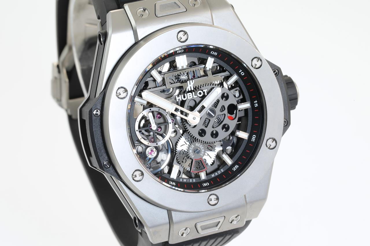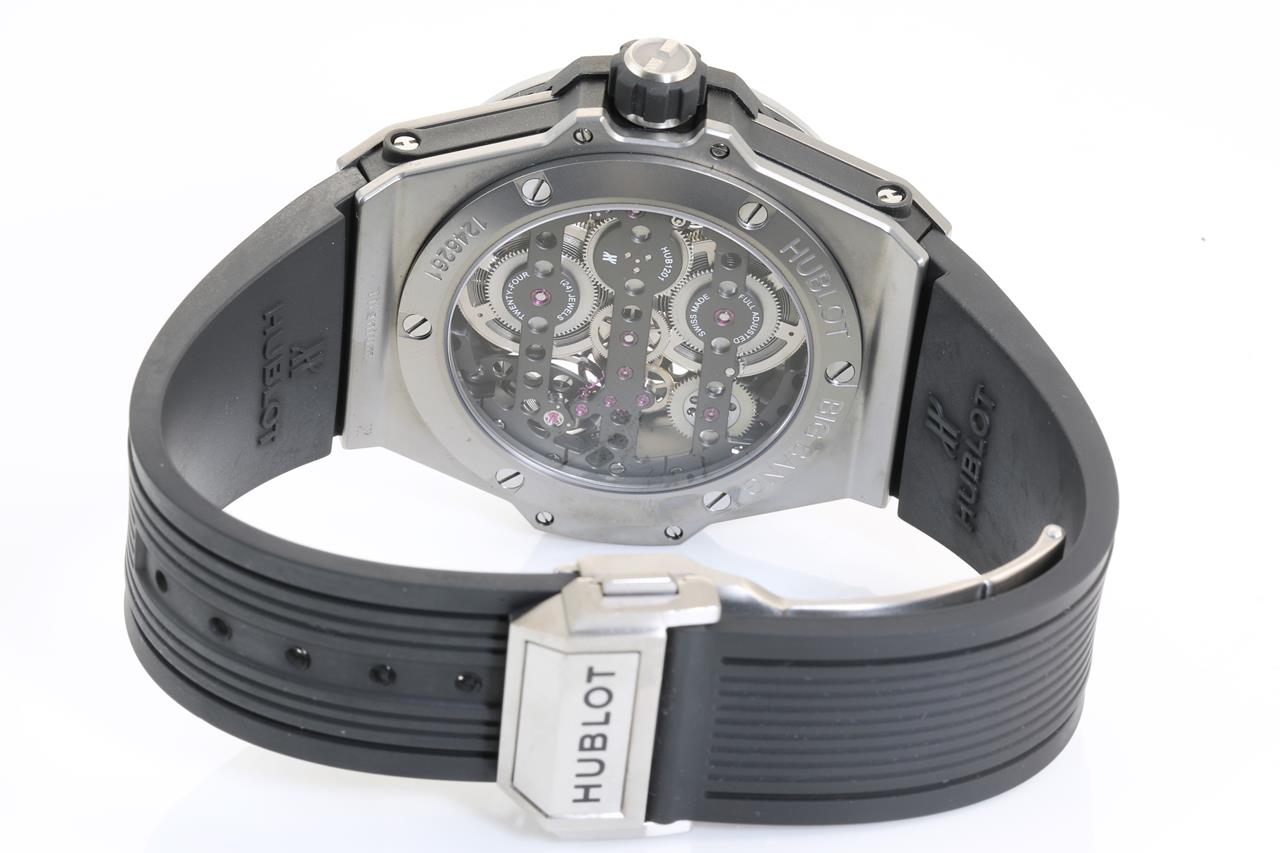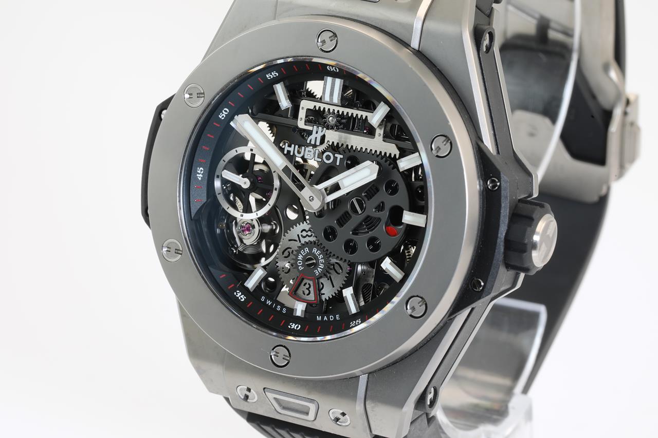 Hublot Big Bang MECA-10 manual winding titanium mens watch. Black Skeleton dial, case diameter: 45mm, wrist size: 19cm (adjustable), Swiss made. Ref# 414.NI.1123.RX. With Hublot black rubber strap and clasp. With Certificate of Authenticity. With Hublot international warranty card dated 2019/6/4 inside Hublot box. 3 month FSA warranty. (Pre-owned)